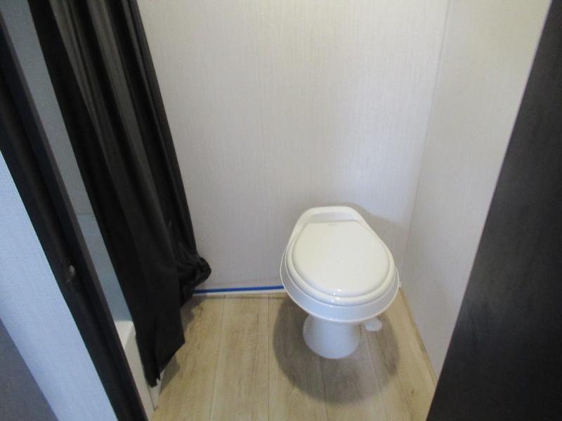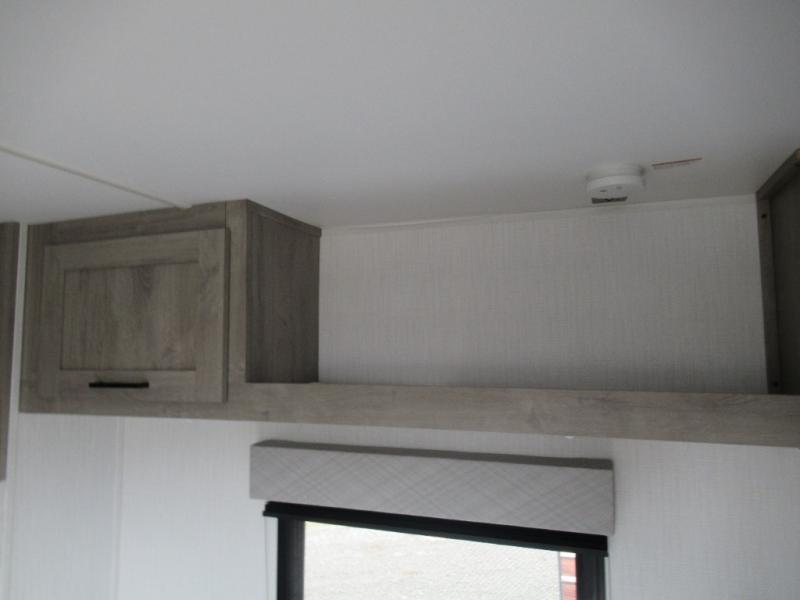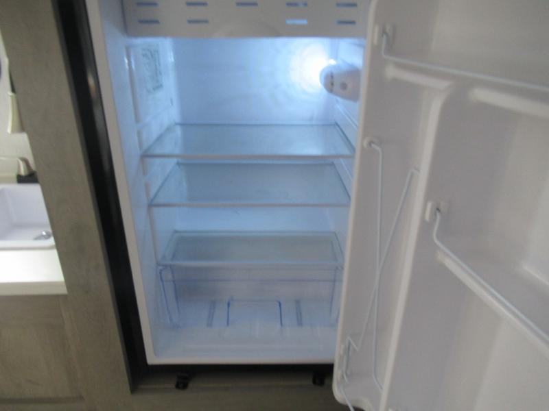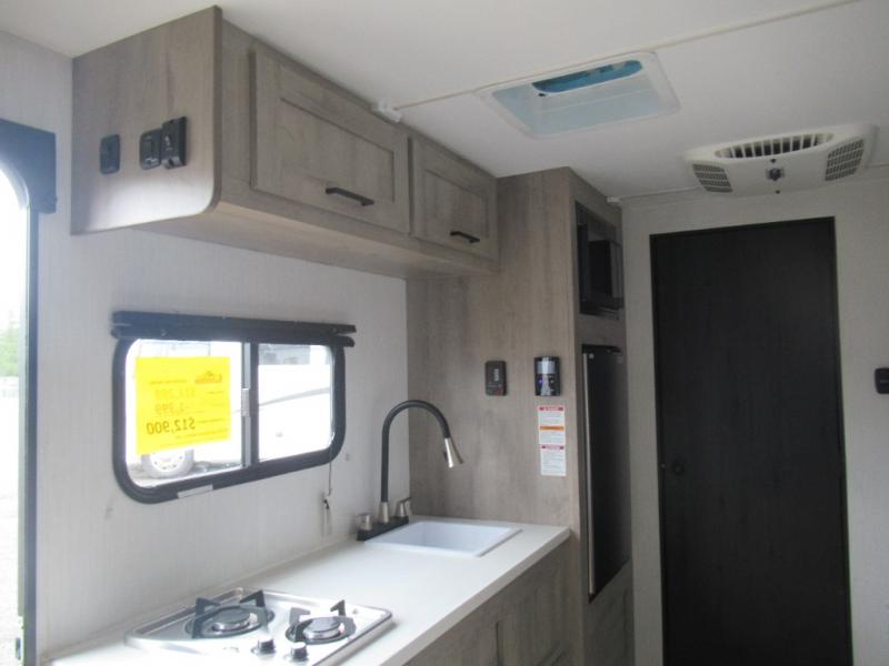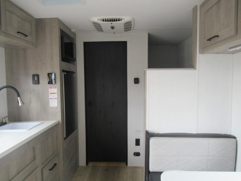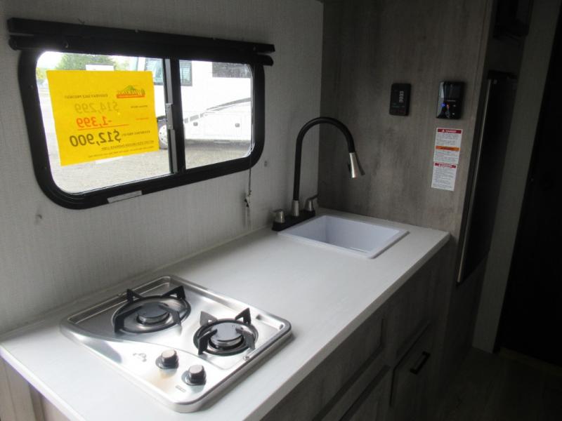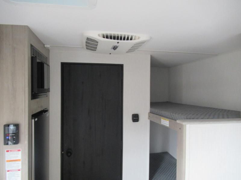 This single axle unit may be compact, but you can confidently sleep five each night thanks to the rear corner bunk beds! Up front you'll find a queen bed with a shelf above for your things, and there is even a booth dinette which which double as dining and sleeping space. A two burner cooktop and double door refrigerator will let you cook and store food each day, and the 8' power awning provides shade if you want to eat outside. There is also a private shower and toilet so you don't have to use the camp's facilities at night!