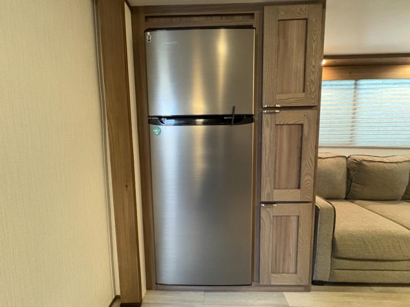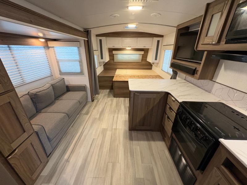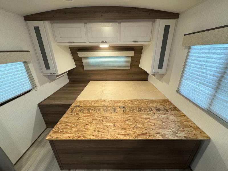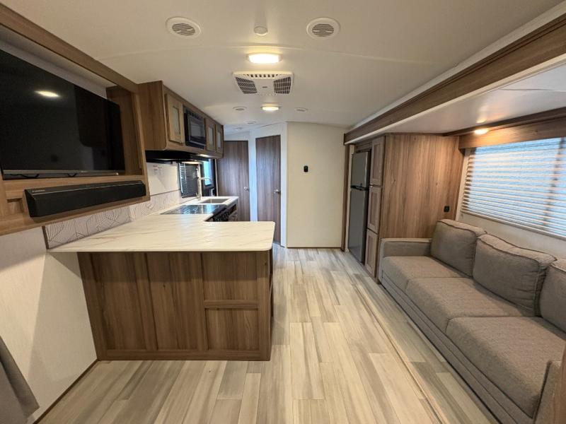 This is the perfect couple's trailer with space for an overnight guest on the sofa within the large slide out. You will enjoy the sliding king bed in the front bedroom, plus there are dual wardrobes for your clothes. The kitchen includes a counter with two stools for breakfast in the morning, two pantries, plus a 10.7 cu. ft. double door refrigerator. A rear corner full bath on board allows you to freshen up each day, and the exterior full belly storage system will be great for fishing poles, lawn chairs, and luggage!