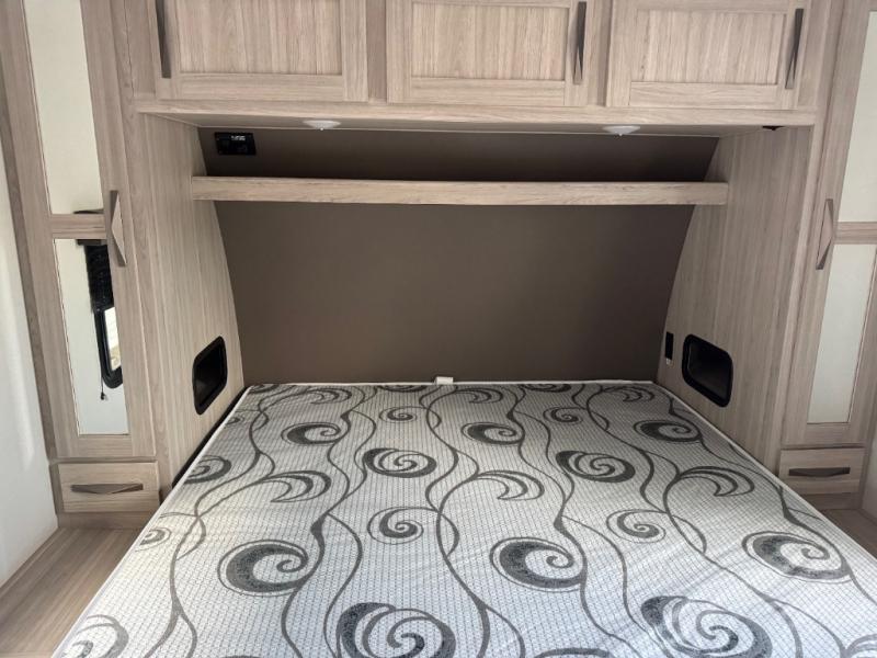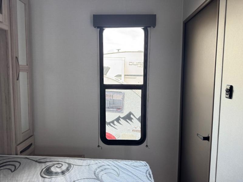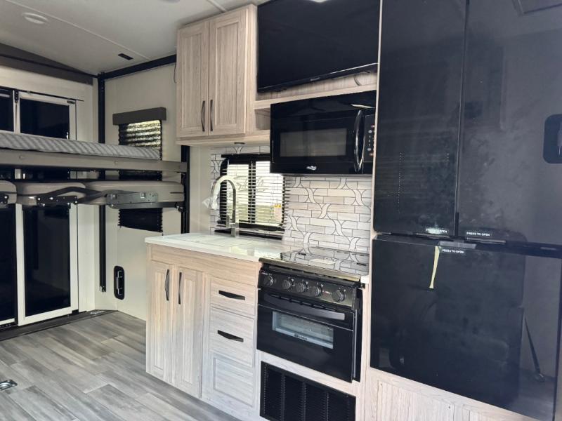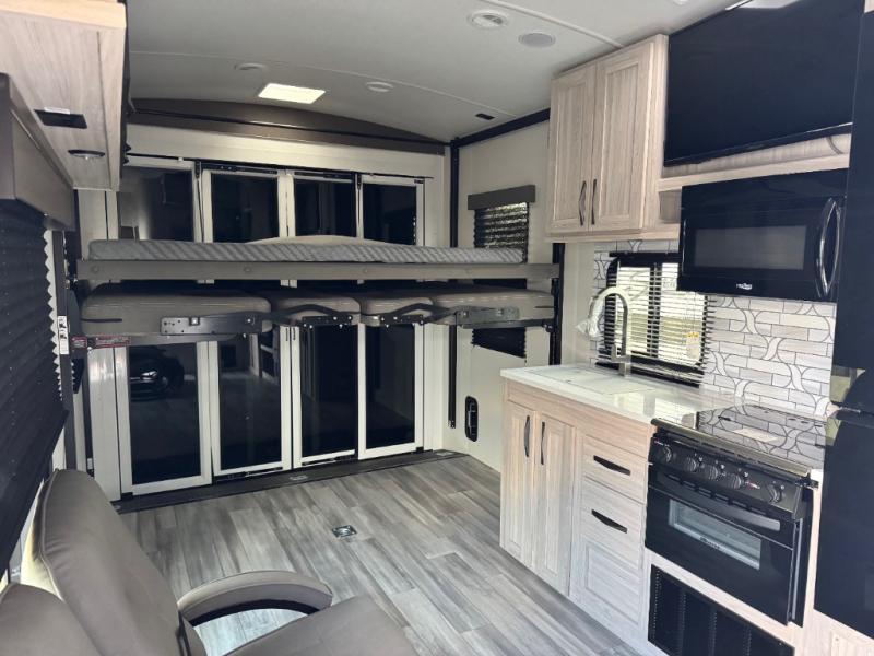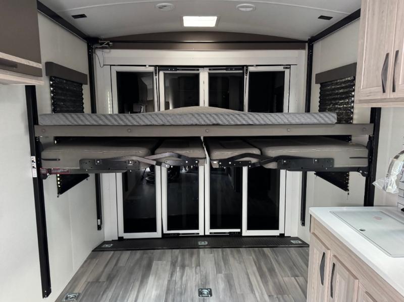 Never leave your dirt bikes behind with this toy hauler in tow! You can easily unload them through the 8' 6" door opening while using the easy-load 8' ramp door. Once the toys are out, you can relax on the opposing sofas with a dinette, and this area can become your guests' bedroom at night since there is a power queen bed above the sofas. And you might want to add the optional three seasons glass door for great outdoor views as you dine or play cards in the evening. The full kitchen includes a three burner range with an oven and a large residential microwave to cook meals each day, along with a refrigerator for food storage. This model also includes dual lounge chairs in the kitchen area to provide even more seating space. When you're ready to turn in for the night, freshen up in the dual entry bath that includes a spacious shower with a skylight, a seamless edge countertop, and even a bonus shelf with towel hangers so everything has a place. Your king bed will be waiting for you in the front master bedroom, and you can keep all your clothes tidy in the dual wardrobes!