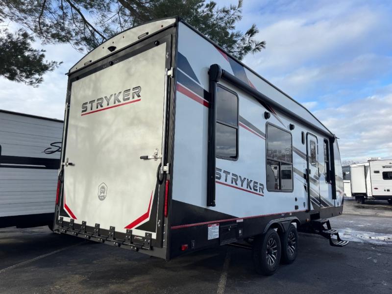 Each Stryker toy hauler travel trailer by Cruiser starts with a powder coated structural steel I-beam frame, Azdel composite laminated sidewalls, and a 102" wide body, perfect for your side-by-side, dirt bikes, or kayaks! The EZ flex rubberized suspension provides smooth towing on tougher roads, and the painted molded fiberglass front cap not only looks sleek, but provides better protection. Inside, you'll find barreled ceilings up to 98" in height, solid surface kitchen cabinets, and numerous USB ports and 110V outlets. There's so much more to love about the Stryker toy haulers, like the premium sound system, large windows, tons of storage space, and the list goes on!