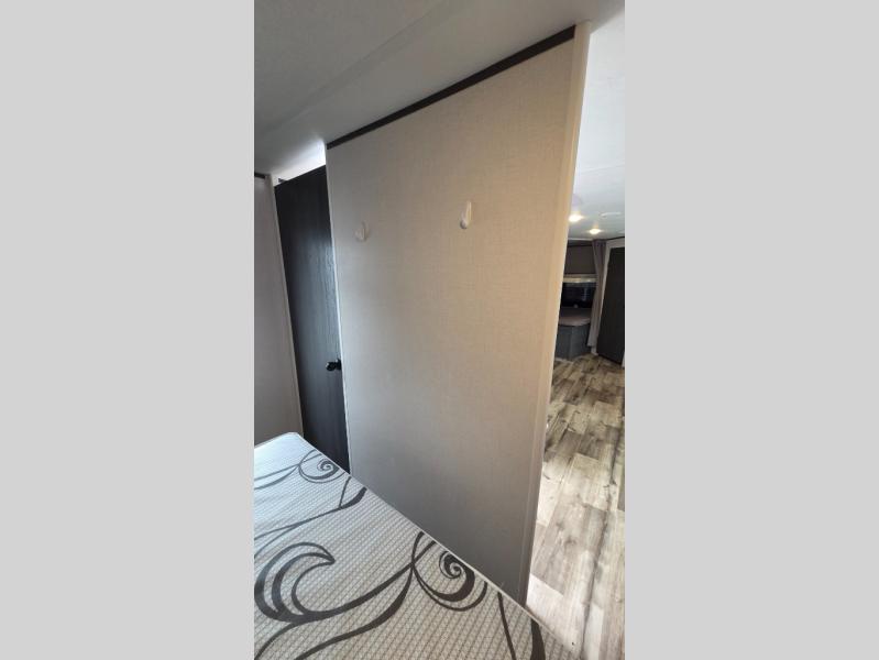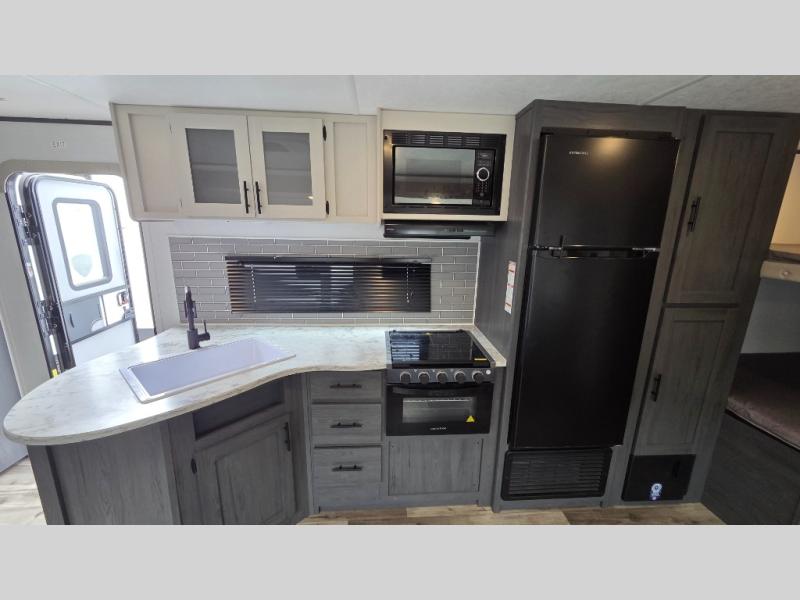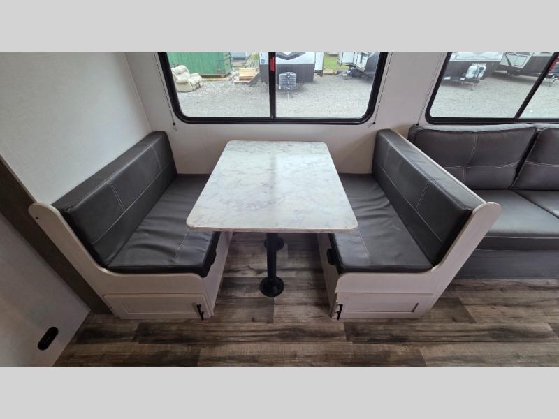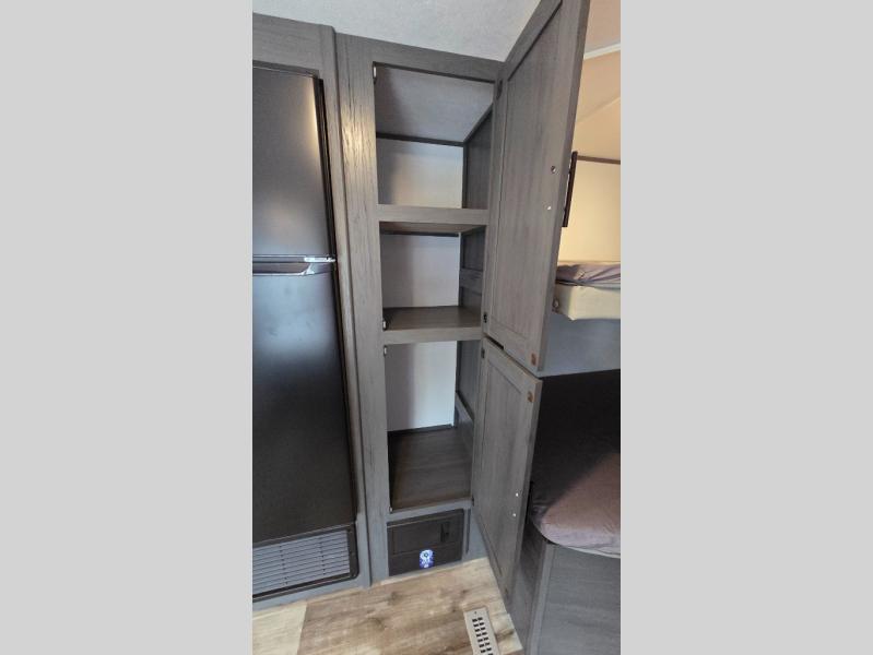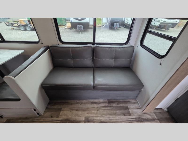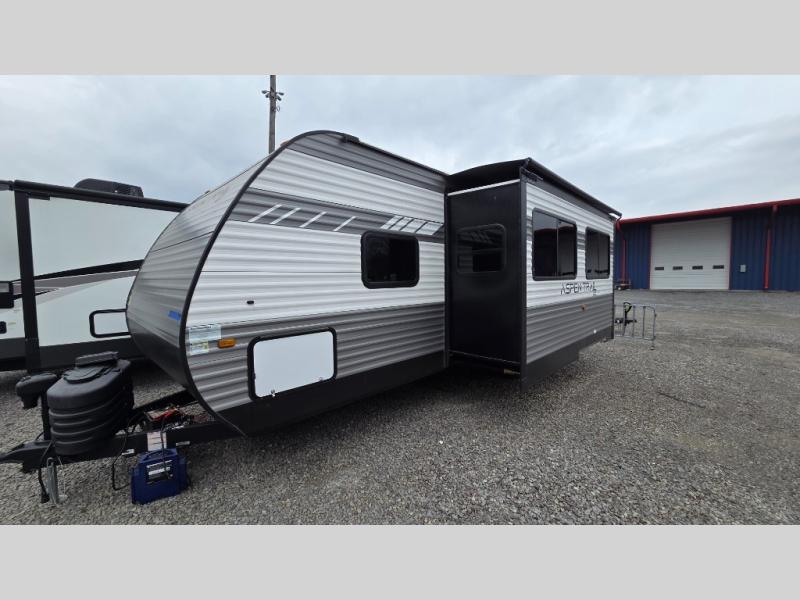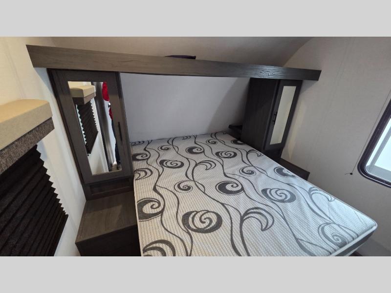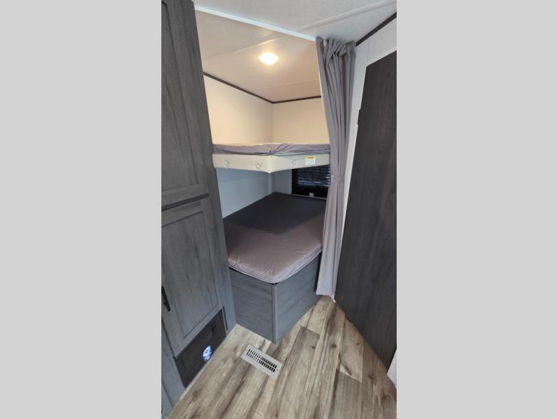 Get ready for fun and relaxation at the campgrounds with this trailer in your campsite. You can fish in the river, hike the trails and relax under the power awning before heading inside to enjoy the comforts of home. You will also enjoy having double access to the private bedroom which offers a residential queen bed and dual closets, plus the full bathroom will keep you refreshed after outdoor fun. The double-size bunks offer sleeping for four, and the furniture doubles as extra sleeping space. The cook will have full amenities including a 10 cu. ft. 12V refrigerator to store lots of cold items. And the large slide gives everyone more floor space.