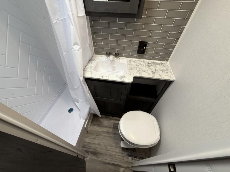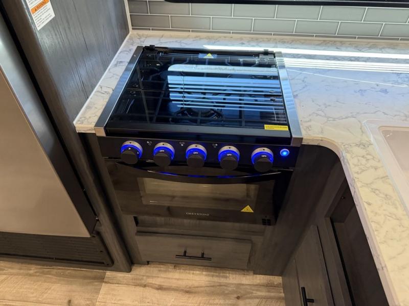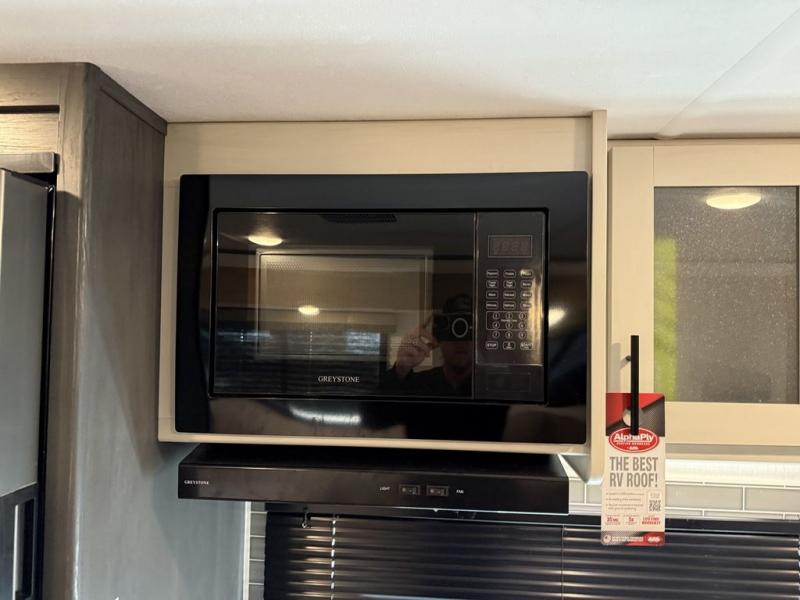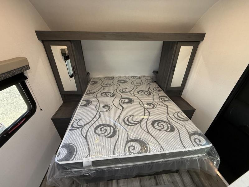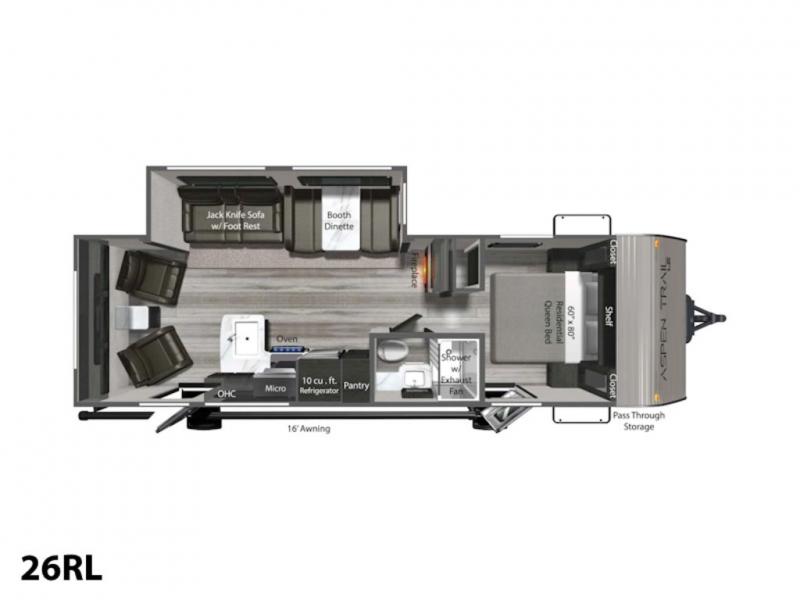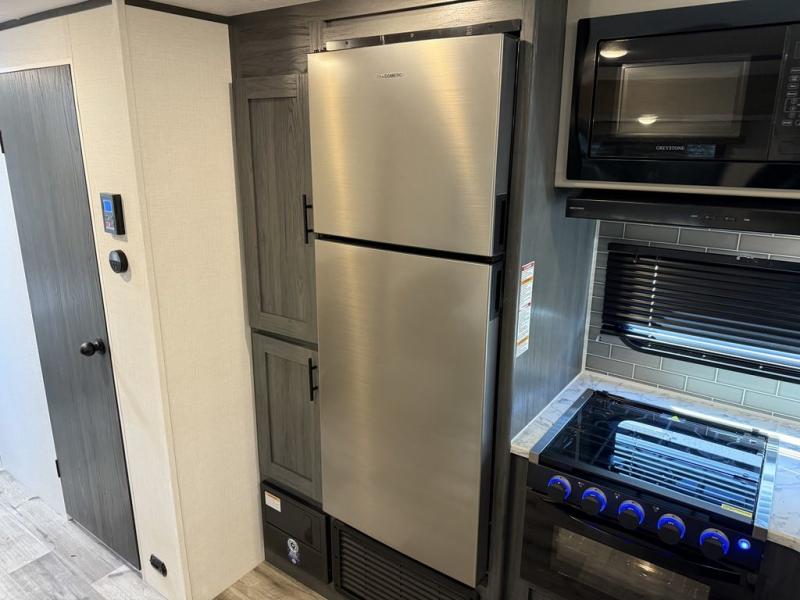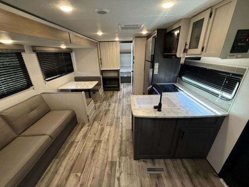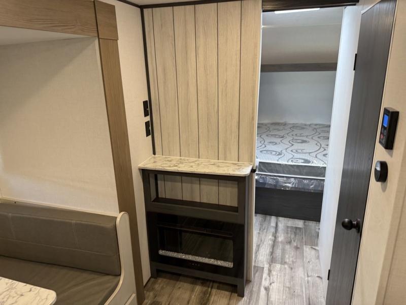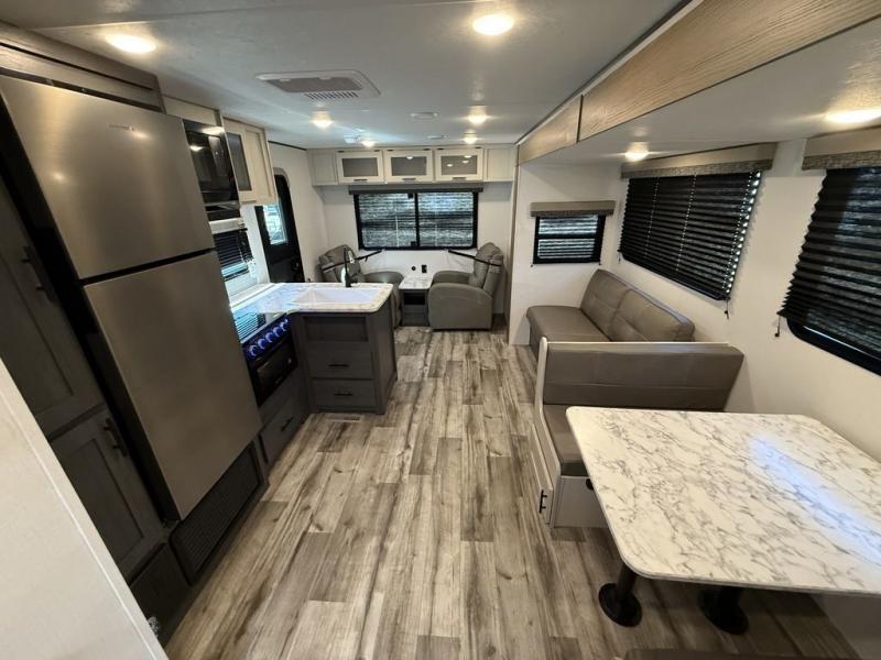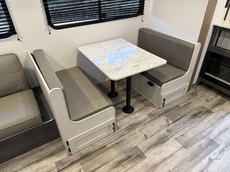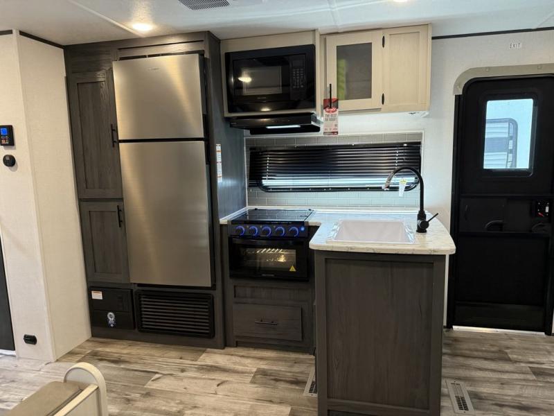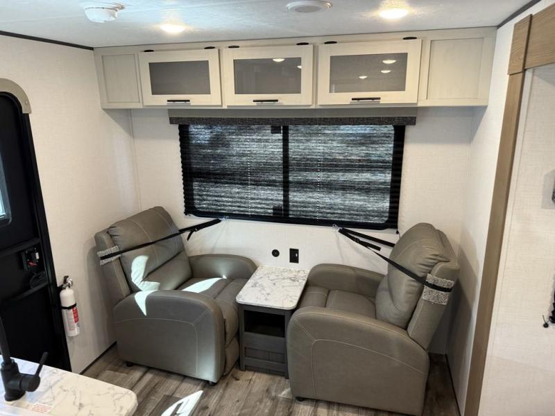 With dual entry doors, you can easily enter and exit this travel trailer! The jackknife sofa with footrest and booth dinette are next to each other near the fireplace, as well as two rear recliners allowing you to visit with other RVers or your family. The cook will have an oven and a microwave to make meals, and a 10 cu. ft. 12V refrigerator for cold items, plus a galley sink with high rise faucet to keep the dishes clean. Speaking of being clean, the full bathroom offers a shower with exhaust fan to eliminate unwanted steam as you clean yourself up after a fun day at the beach. The front private bedroom has a residential queen bed and one of the entrance/exit doors so you can slip out for an early morning fishing trip!