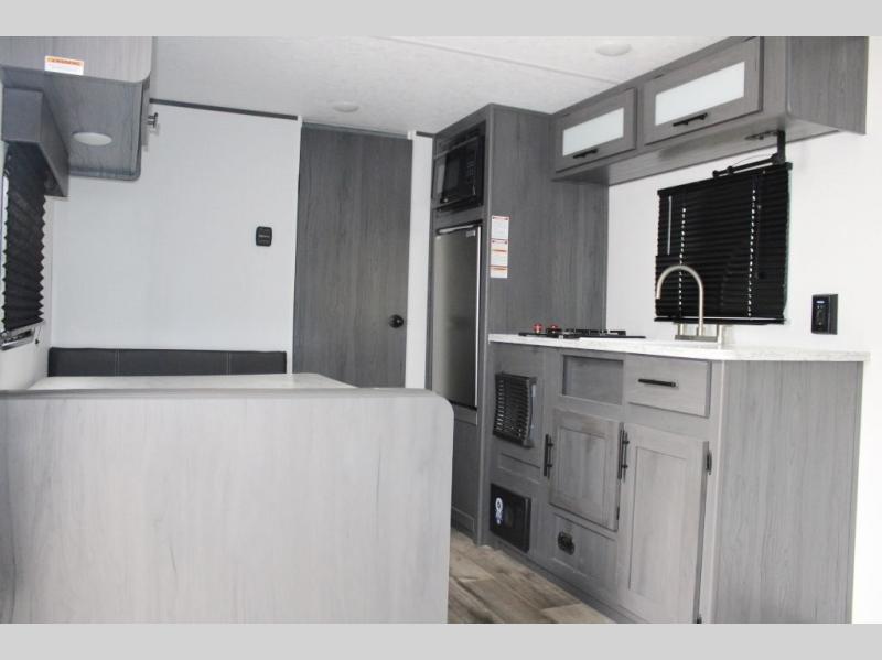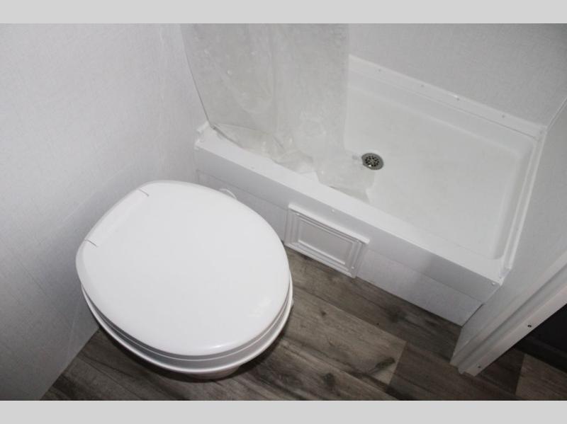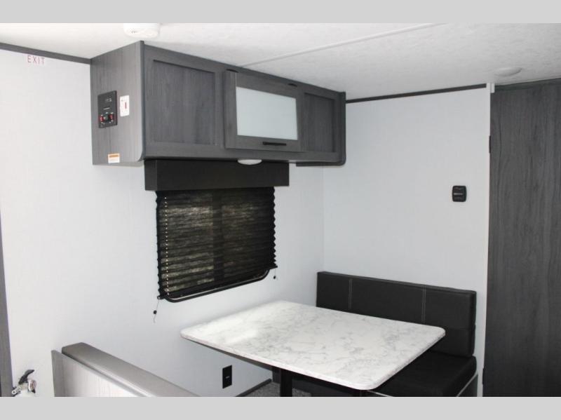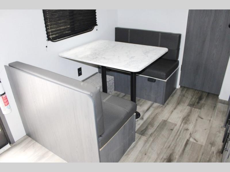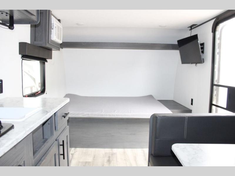 A perfect couples coach that could sleep one or two more, depending on size, using the booth dinette which can be converted at night This unit is cozy and convenient providing you just what you need to enjoy a little adventure away from home. For meals, there is a two burner cooktop and sink, plus a 3.3 cu. ft. refrigerator for your perishables. Overhead cabinetry can be found along both sides for your dishes and things. You will all appreciate the convenience of having your own private shower and toilet so that you don't need to use the campground facilities at night. You will also enjoy spending time outside with an 8' awning to provide even more living space outdoors!