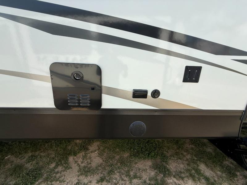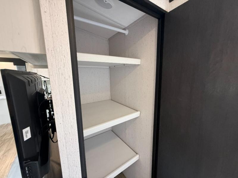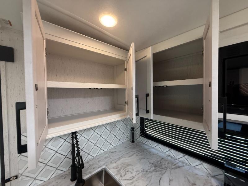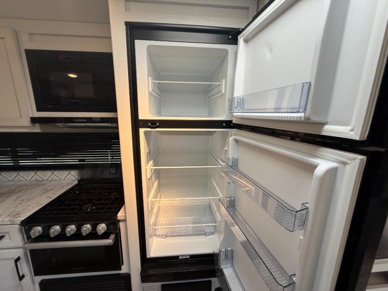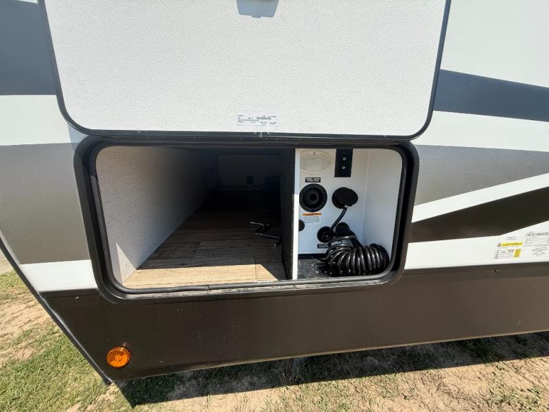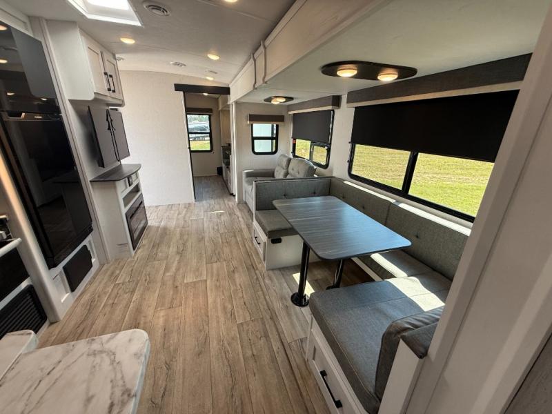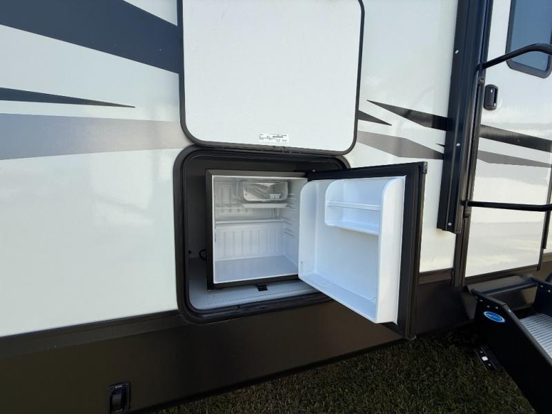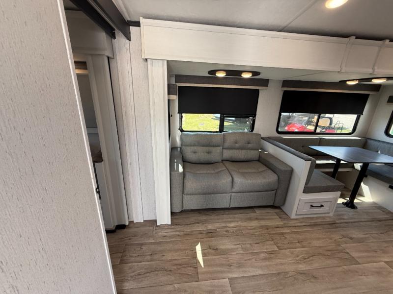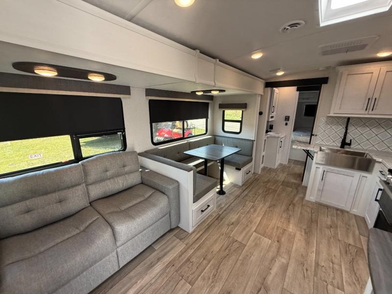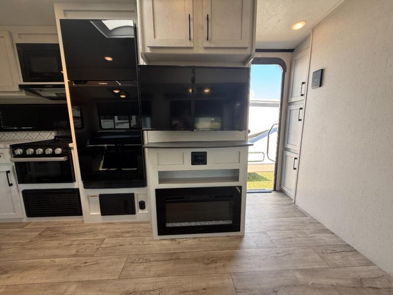 There are plenty of sleeping spaces for everyone in this travel trailer! From the rear private bunkhouse with a set of bunk beds along one side and a bunk bed above a sofa on the other to the front private bedroom with a king bed. You can even transform the tri-fold sofa and U-shaped dinette slide into extra sleeping spaces if needed. The walk-through bathroom has everything you will need to freshen up each morning. The chef will love cooking indoors with the glass top three burner cooktop with an oven, yet may love cooking at the outdoor kitchen even more. Grab a snack from the walk-in pantry behind the entertainment center and watch your favorite movie on the LED TV while a fire roars in the fireplace!