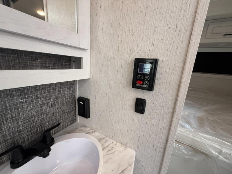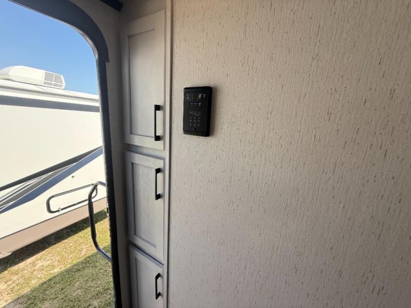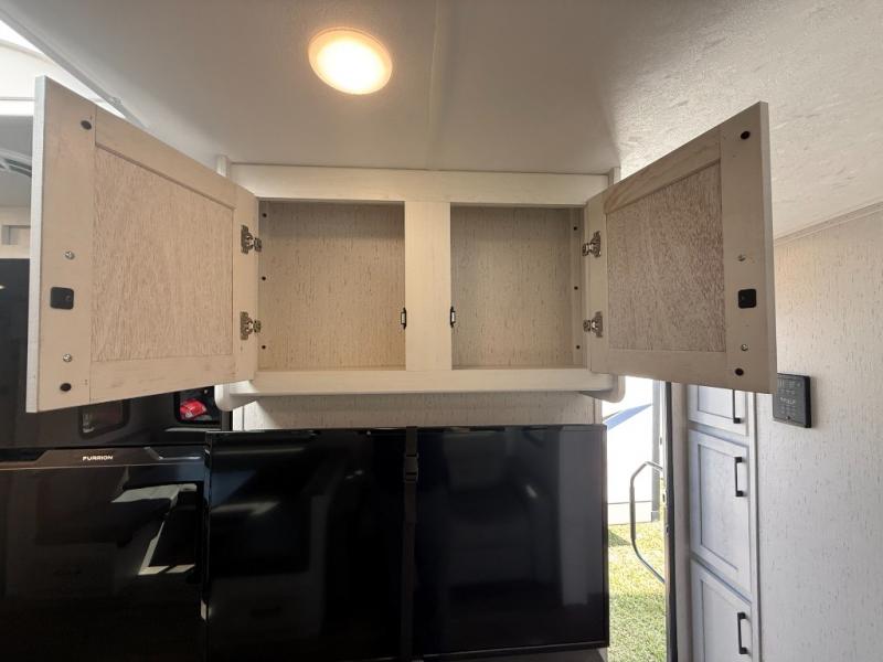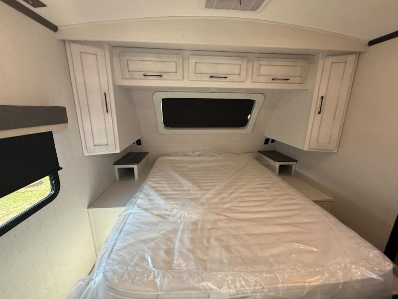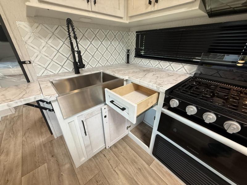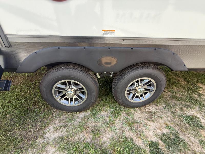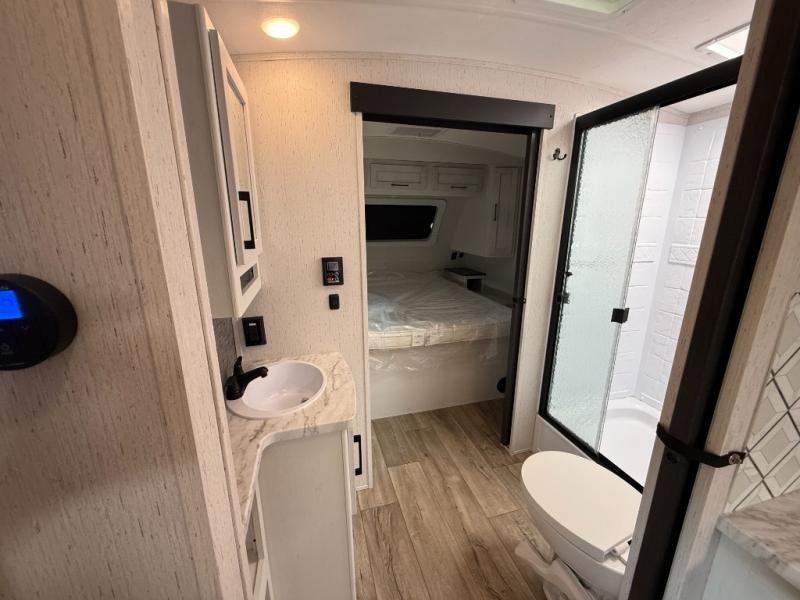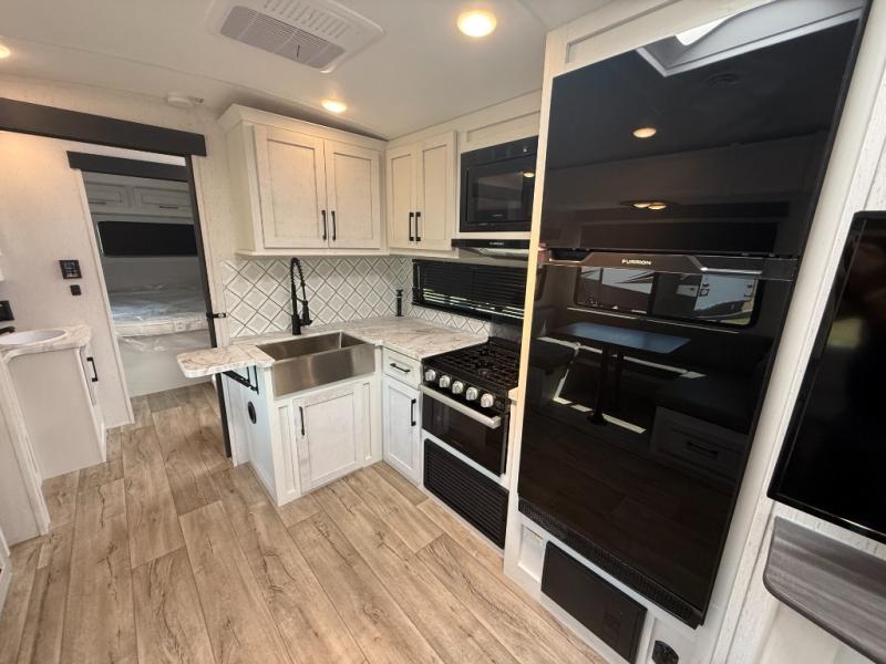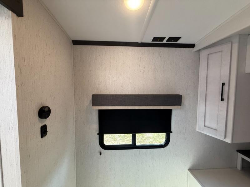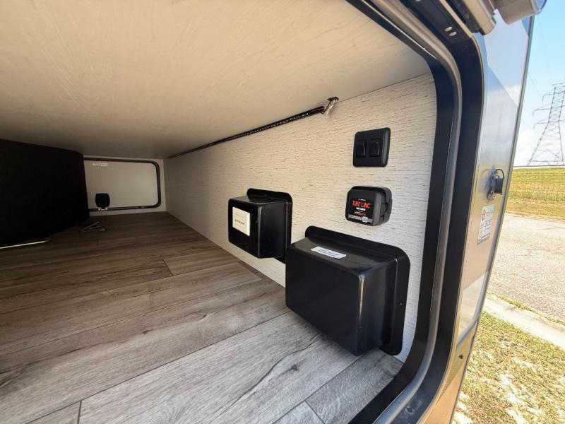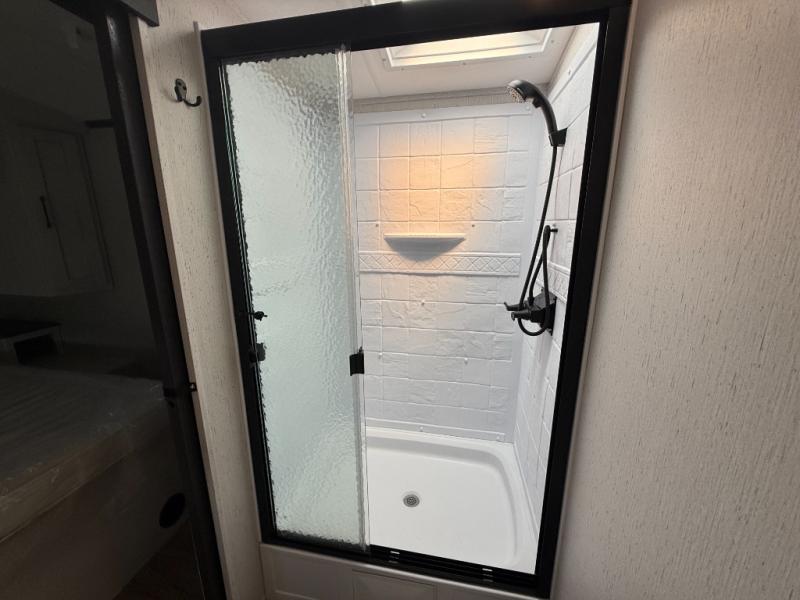 There are plenty of sleeping spaces for everyone in this travel trailer! From the rear private bunkhouse with a set of bunk beds along one side and a bunk bed above a sofa on the other to the front private bedroom with a king bed. You can even transform the tri-fold sofa and U-shaped dinette slide into extra sleeping spaces if needed. The walk-through bathroom has everything you will need to freshen up each morning. The chef will love cooking indoors with the glass top three burner cooktop with an oven, yet may love cooking at the outdoor kitchen even more. Grab a snack from the walk-in pantry behind the entertainment center and watch your favorite movie on the LED TV while a fire roars in the fireplace!