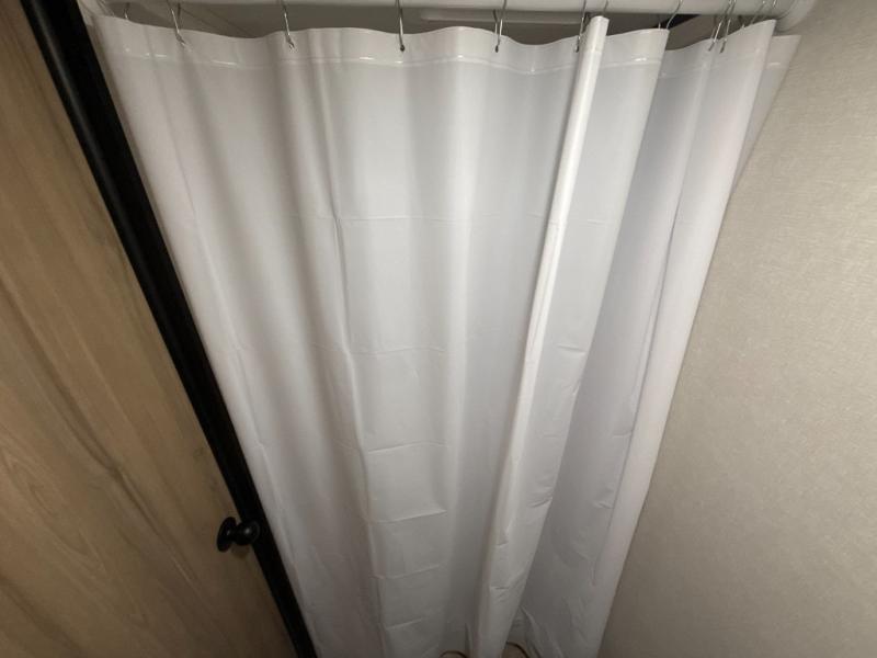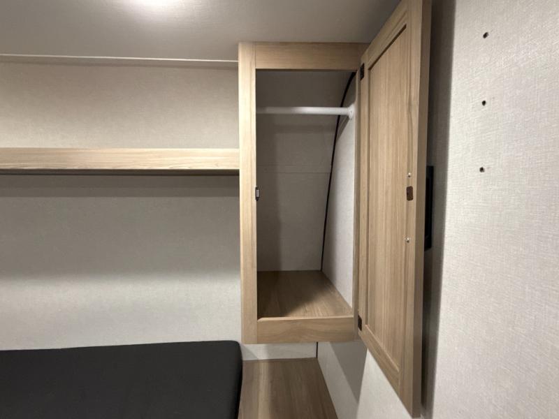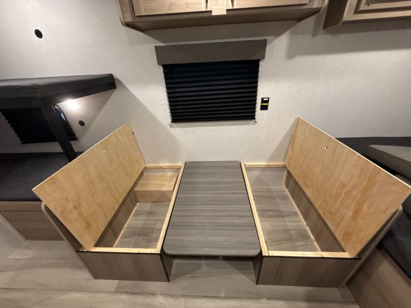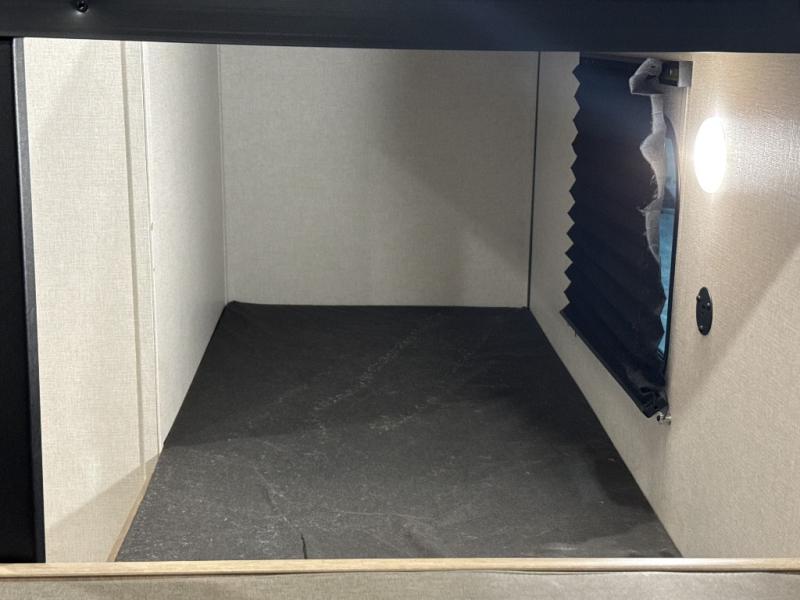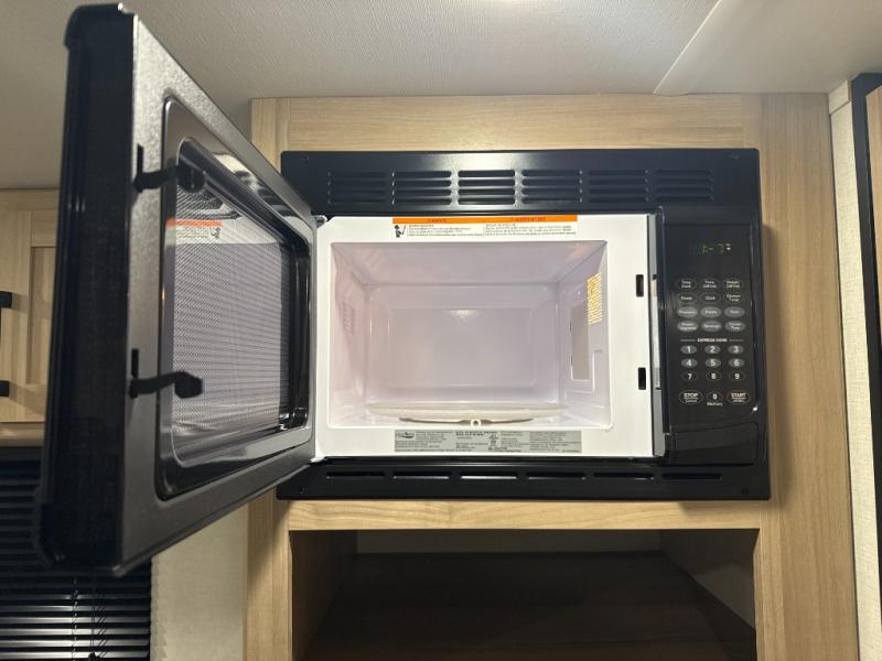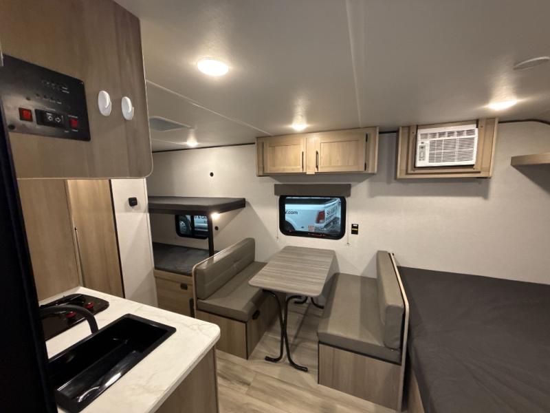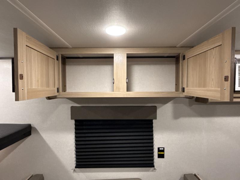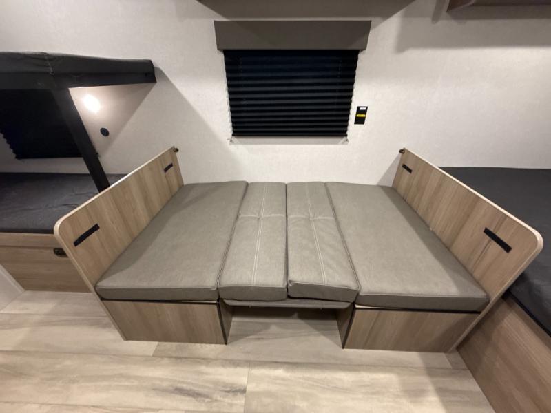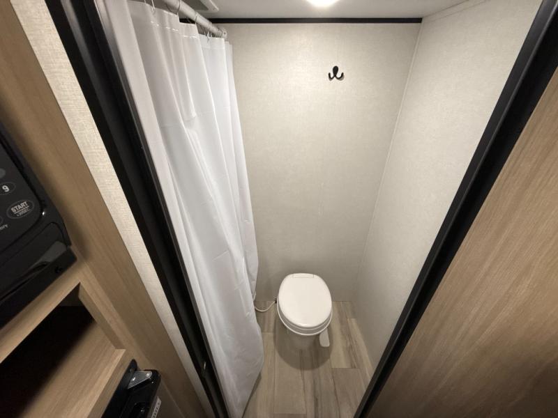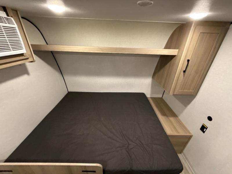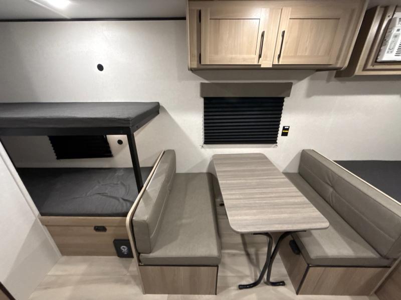 After making dinner on the two burner cooktop or inside the microwave, you can dine at the booth dinette or outside under the 8' power awning if you brought along your camping chairs. Either way you will be comfortable and the dinette may even sleep one person if needed. After playing outdoors all day, everyone can return to get cleaned up in the private bath with a shower and toilet, then fall asleep on the queen bed up front or the bunk beds in the rear corner.