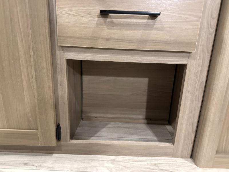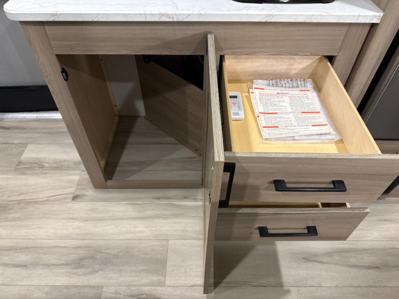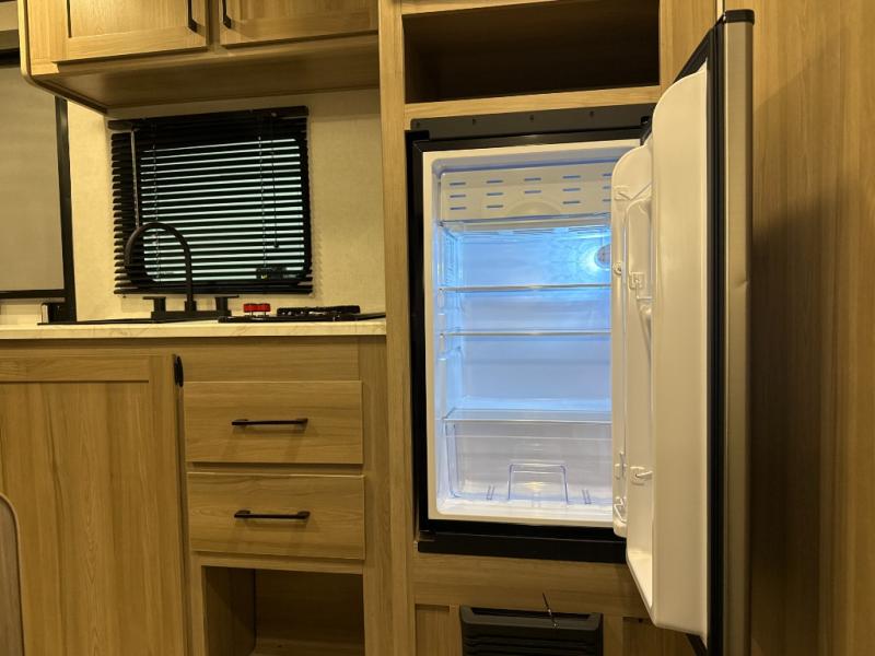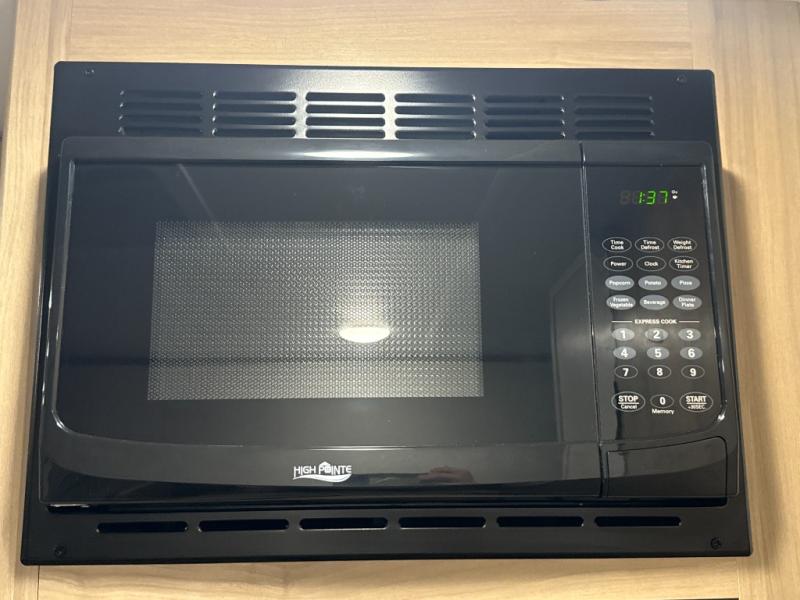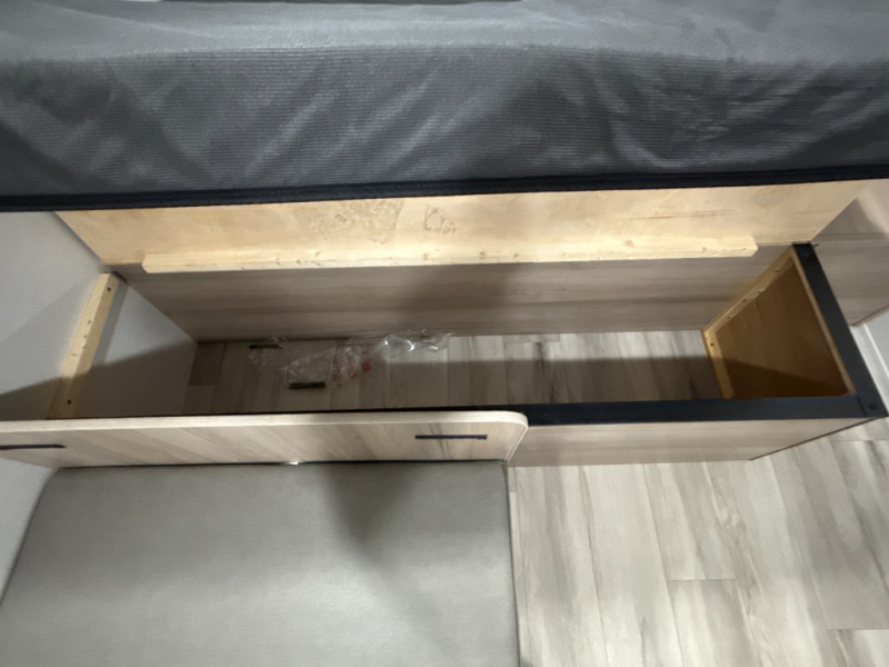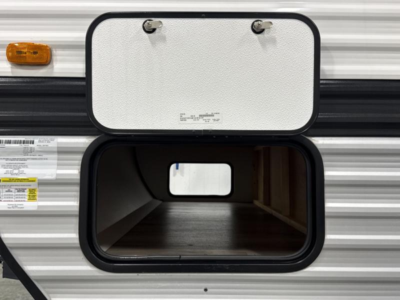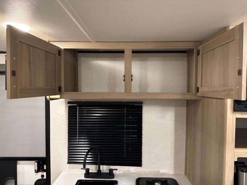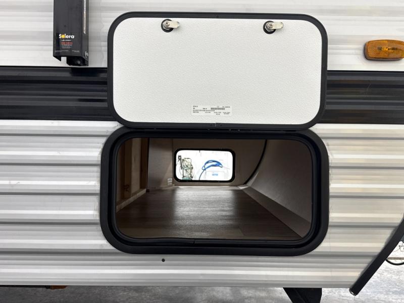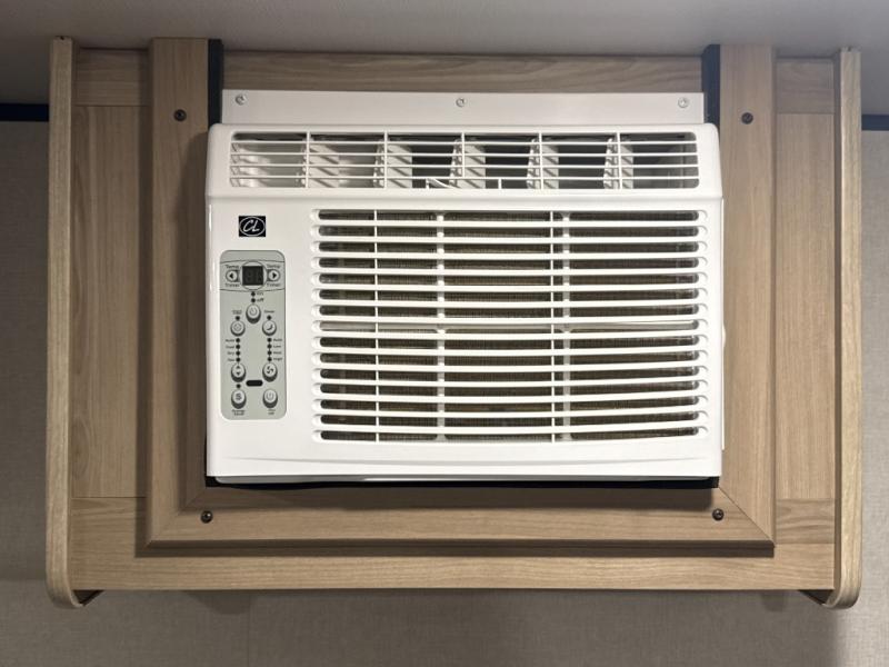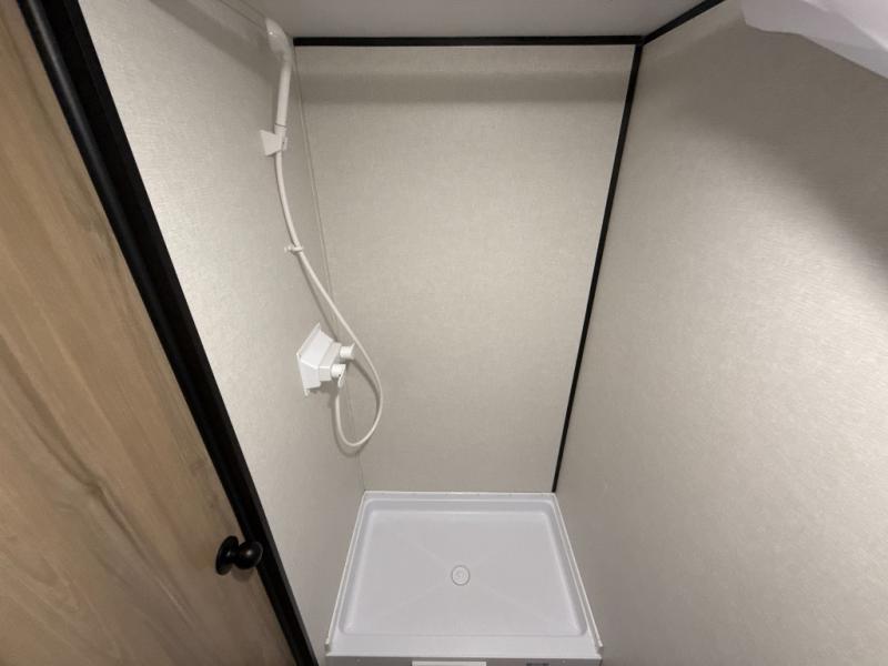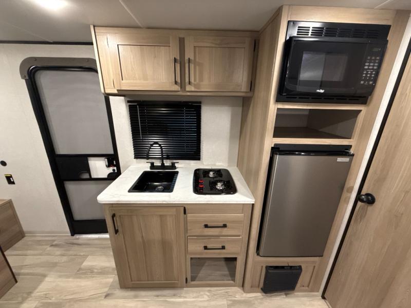After making dinner on the two burner cooktop or inside the microwave, you can dine at the booth dinette or outside under the 8' power awning if you brought along your camping chairs. Either way you will be comfortable and the dinette may even sleep one person if needed. After playing outdoors all day, everyone can return to get cleaned up in the private bath with a shower and toilet, then fall asleep on the queen bed up front or the bunk beds in the rear corner.
