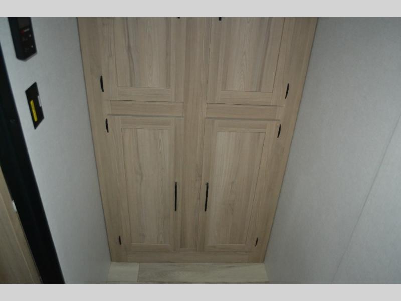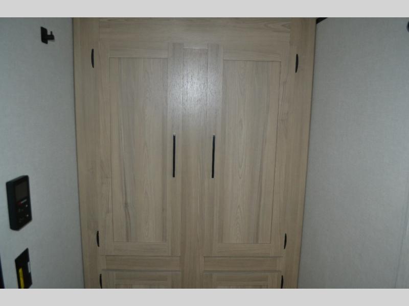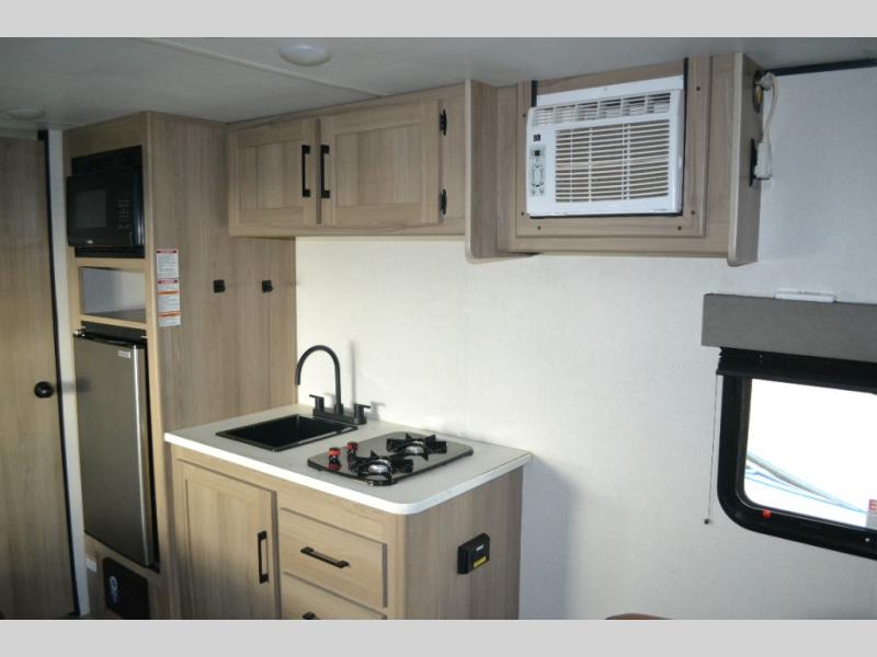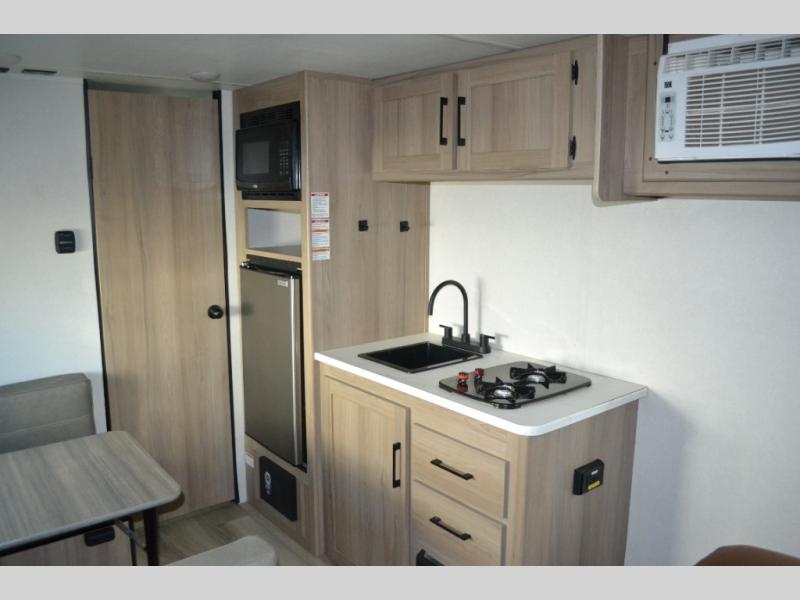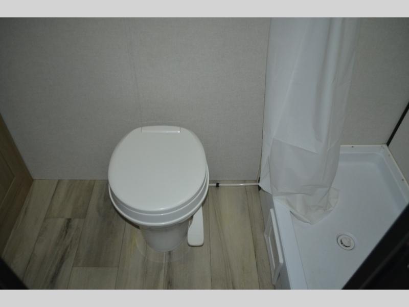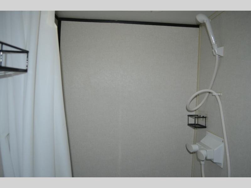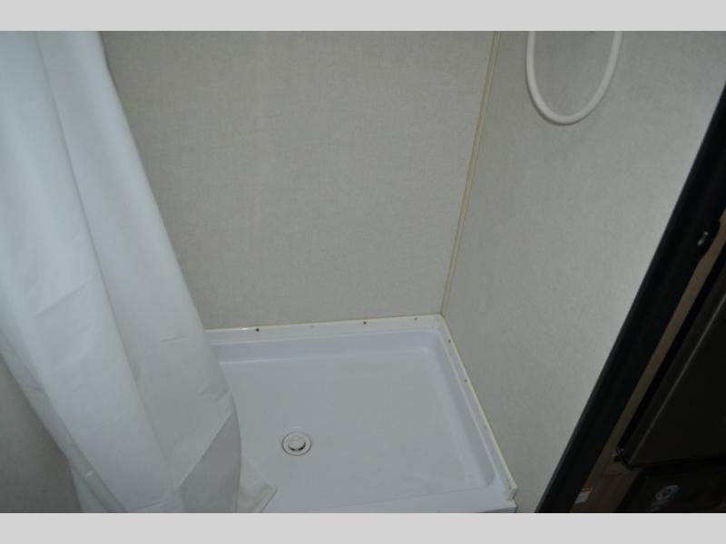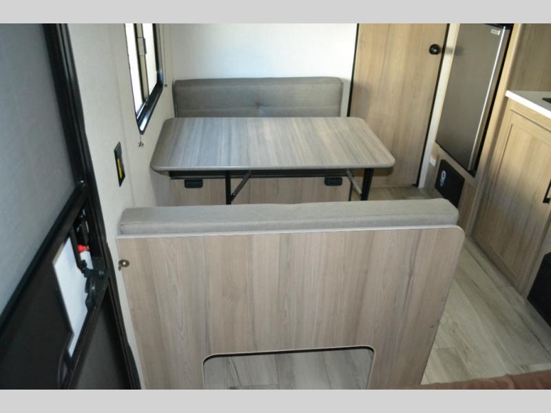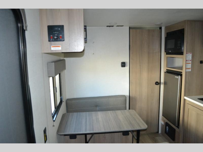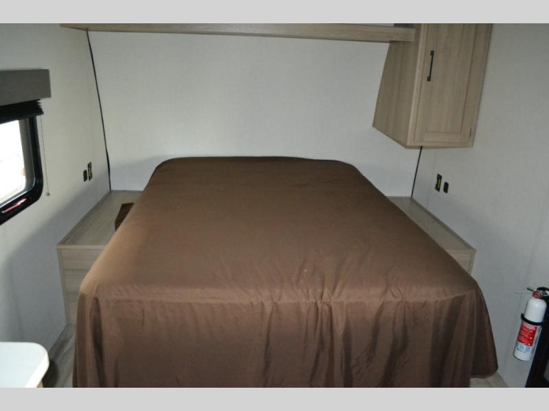 After making dinner on the two burner cooktop or microwave, you can dine at the booth dinette or outside under the power awning if you brought along your camping chairs. Either way you will be comfortable and the dinette can even be converted to sleep one person if needed. After playing outdoors all day, everyone can return to get cleaned up in the full rear bath including a walk-in shower. There is even a linen closet and space for some clothes that hang. You will get a great night's rest on the front queen bed, and the booth dinette can double as sleeping space for an extra guest or two!
