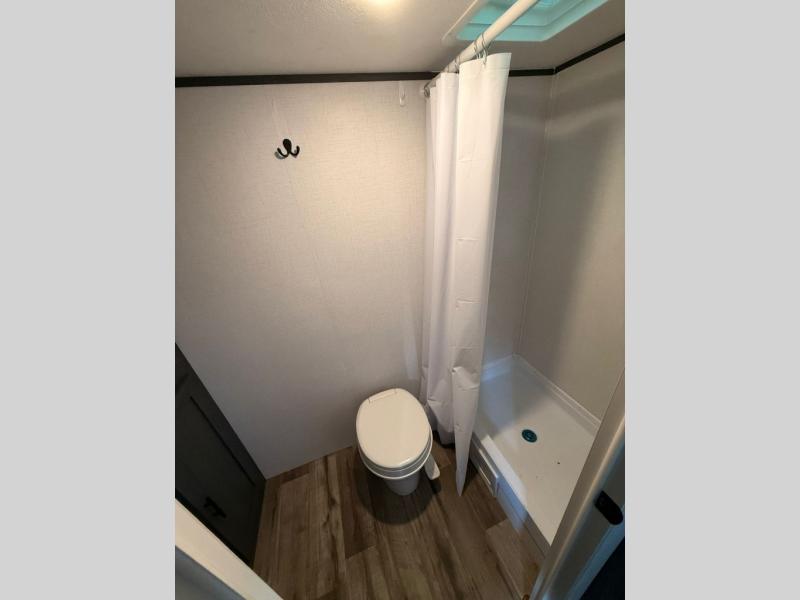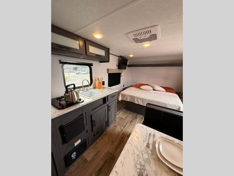 This single axle travel trailer is the perfect couple's trailer with space for an overnight guest on the booth dinette. The queen bed up front will provide a great night's rest instead of sleeping on an air mattress, and the full rear bath means you won't have to use the camp's facilities at night. You'll also find a refrigerator for food storage, a cooktop, plus a microwave oven for all your cooking needs!
