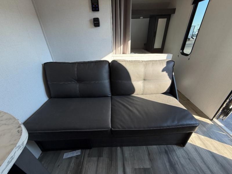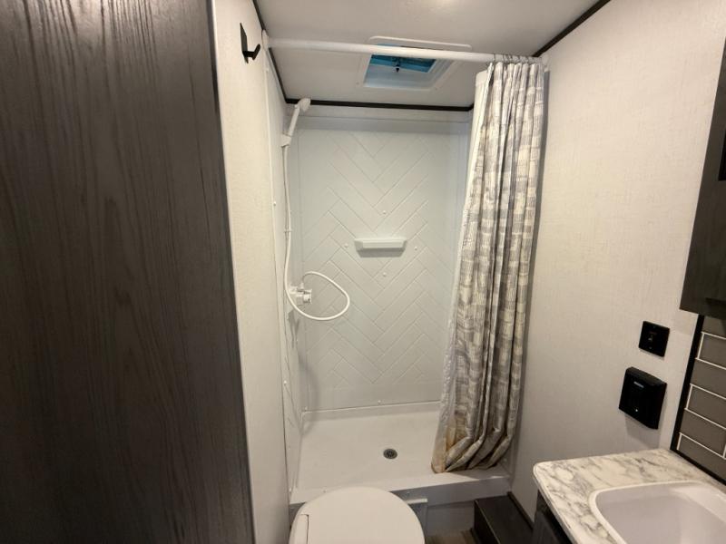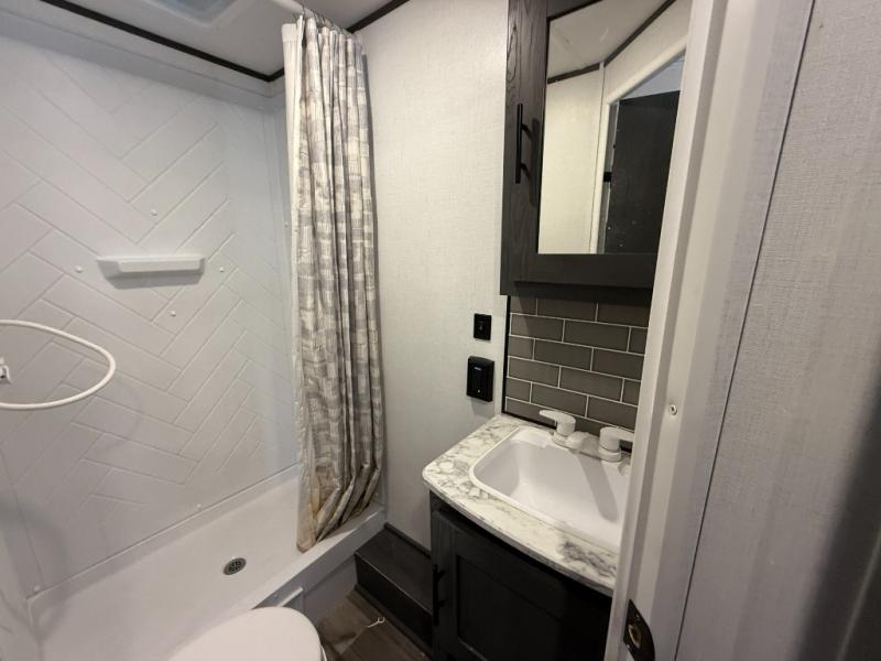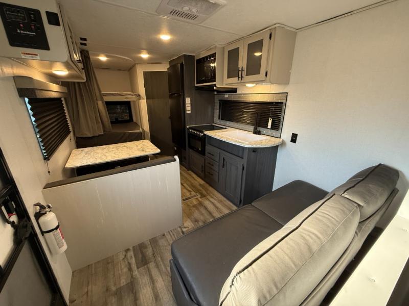 Load up for a fun weekend or long vacation with this trailer in tow! Whether you camp close or far away, you will have eight to nine sleeping spaces thanks to the residential queen bed in the semi-private bedroom, the double-size bunks near the rear corner bathroom, and the furniture in the middle. Everyone can take turns getting dressed in either the full bathroom, or front bedroom once the privacy curtain is closed. There is plenty of storage found throughout in the closets, overhead cabinets, and along the exterior in the pass-through compartment for those longer items. And the 14' awning gives you an outdoor living space protected from the elements, so just add your own camping chairs and such.