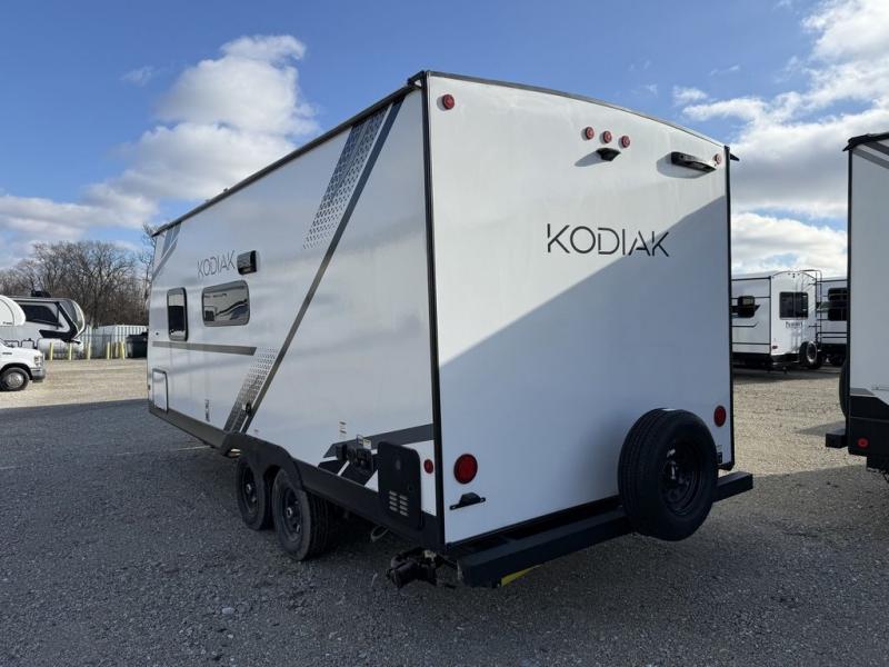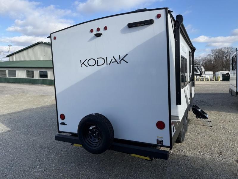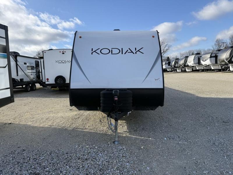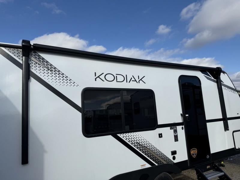 Each Kodiak travel trailer by Dutchmen includes a diamond front plate, easy lube axles, and a power tongue jack for hassle-free towing. The bear cave storage will allow you to bring along all the camp gear, and the power awning with an LED light will create an inviting outdoor space. Head inside to enjoy the designer valances, blackout roller shades, and seamless countertops. There is also HyperDeck flooring that will withstand your many adventures plus a 6' 8" interior height for more head room. A high output furnace and 13.5k BTU A/C will keep you comfortable, and the on-demand tankless water heater will provide instant hot water when you need it!