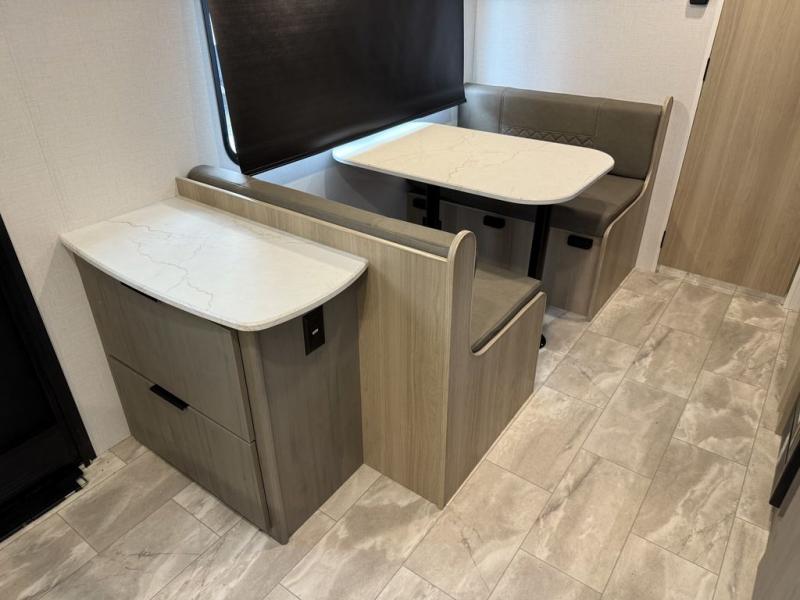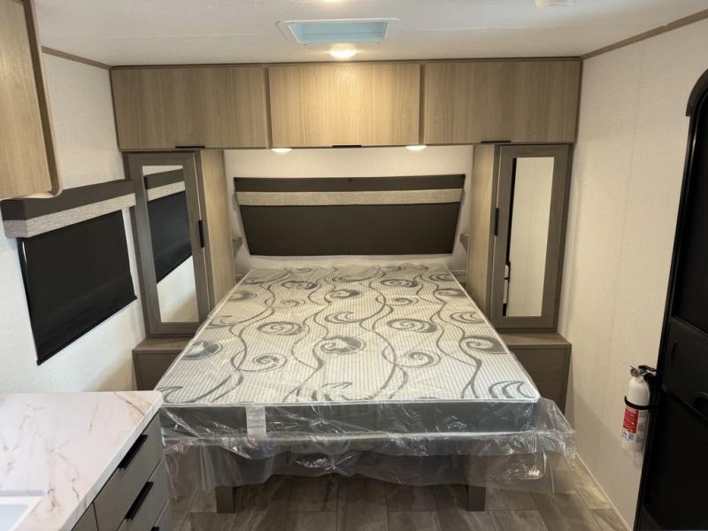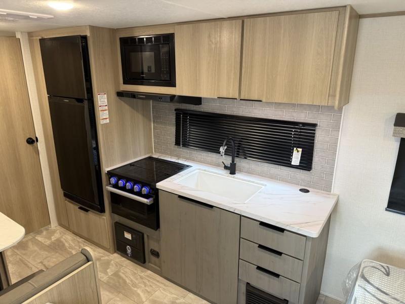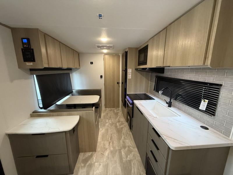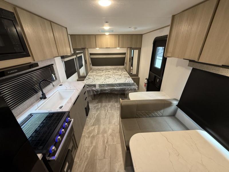 This couple's trailer is perfect for weekend excursions or extended getaways at your favorite state park. You will have your own queen bed up front with storage space for your things, and the full rear bath will add privacy and convenience. Prepare your meals on the cooktop or in the microwave oven, and you can dine together at the booth dinette. The dinette can also be used as additional sleeping space for one guest or two kids.