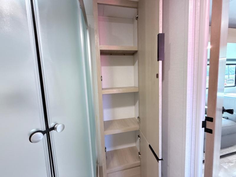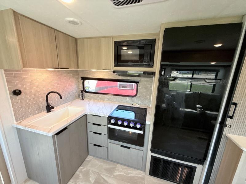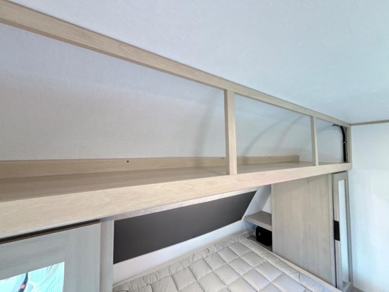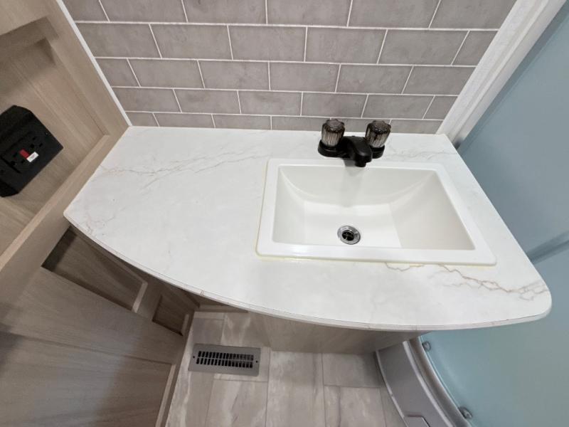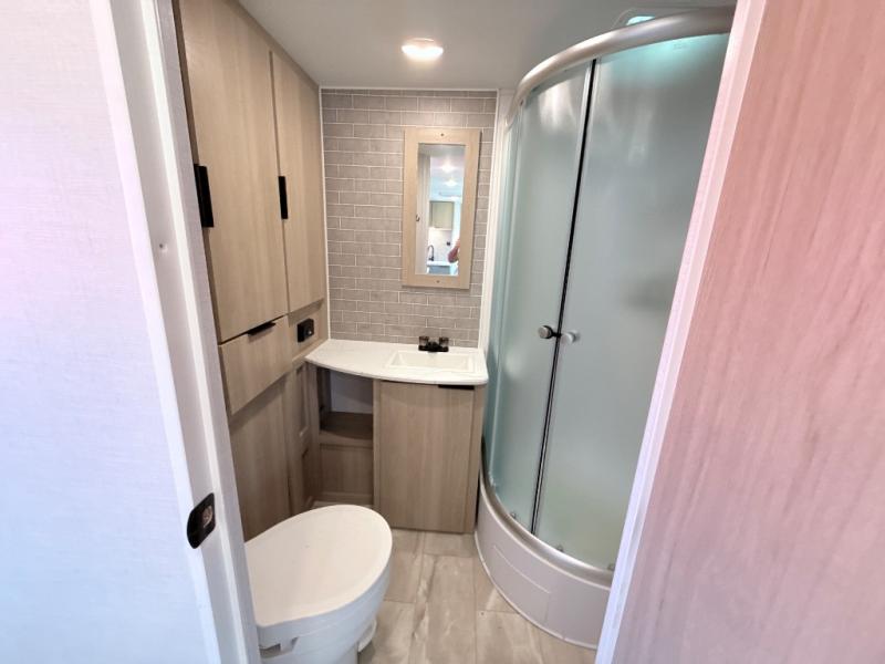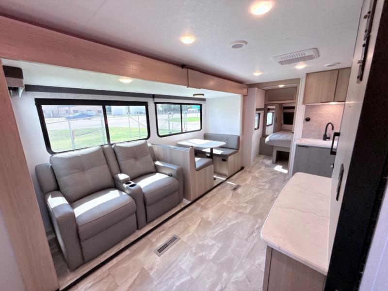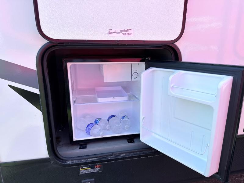 A full rear bath on board this cozy travel trailer will add privacy and convenience you won't want to camp without. The large slide out in the main living area will provide plenty of space to let the chef whip up breakfast on the cooktop, and your crew can get comfy on the theater seats. The 10 cu. ft. 12V refrigerator will allow you to pack your favorite cold ingredients, plus there is a hidden pantry behind the hinged entertainment center for smart storage spaces. This model also includes a front private bedroom with a queen bed, just like at home!