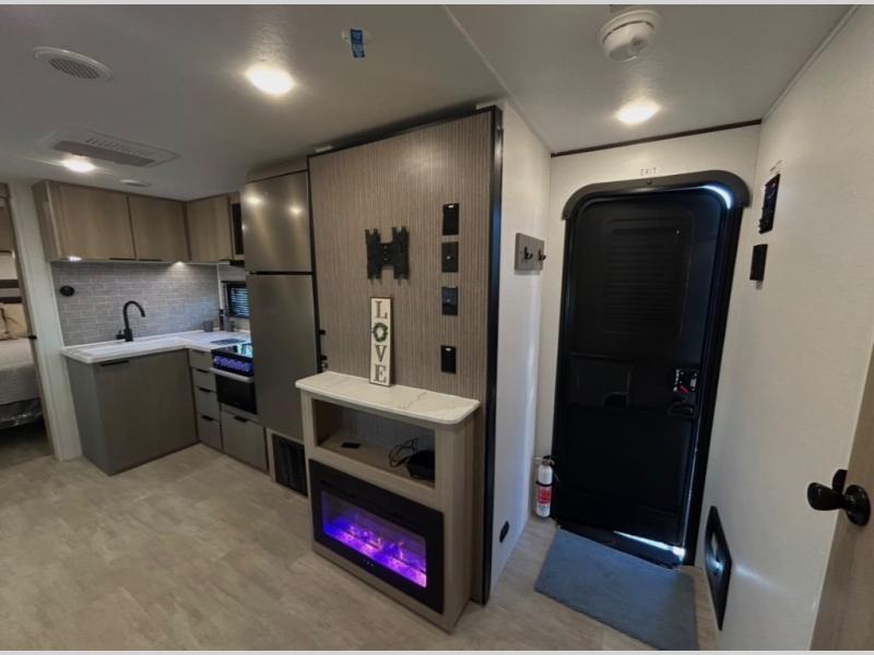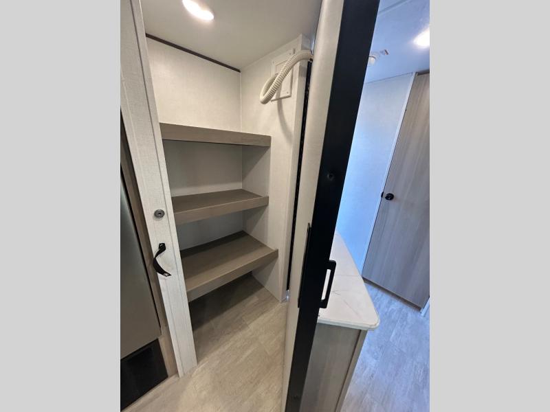 A full rear bath on board this cozy travel trailer will add privacy and convenience you won't want to camp without. The large slide out in the main living area will provide plenty of space to let the chef whip up breakfast on the cooktop, and your crew can get comfy on the theater seats. The 10 cu. ft. 12V refrigerator will allow you to pack your favorite cold ingredients, plus there is a hidden pantry behind the hinged entertainment center for smart storage spaces. This model also includes a front private bedroom with a queen bed, just like at home!