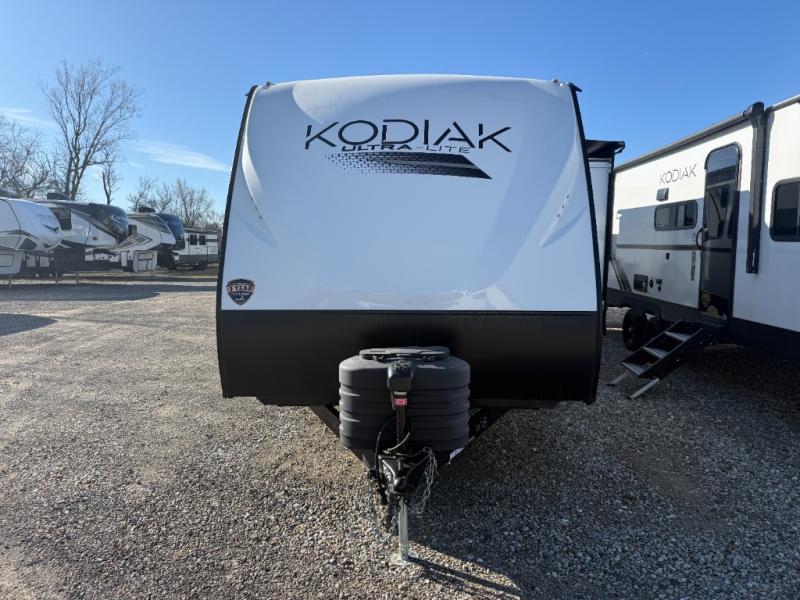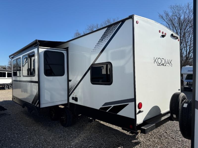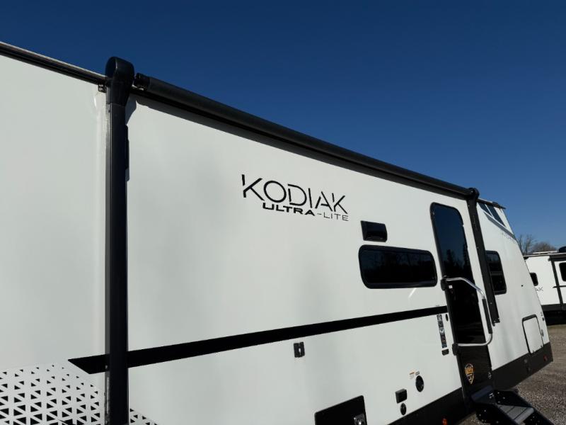 Each Kodiak travel trailer by Dutchmen includes a diamond front plate, easy lube axles, and a power tongue jack for hassle-free towing. The bear cave storage will allow you to bring along all the camp gear, and the power awning with an LED light will create an inviting outdoor space. Head inside to enjoy the designer valances, blackout roller shades, and seamless countertops. There is also HyperDeck flooring that will withstand your many adventures plus a 6' 8" interior height for more head room. A high output furnace and 13.5k BTU A/C will keep you comfortable, and the on-demand tankless water heater will provide instant hot water when you need it!