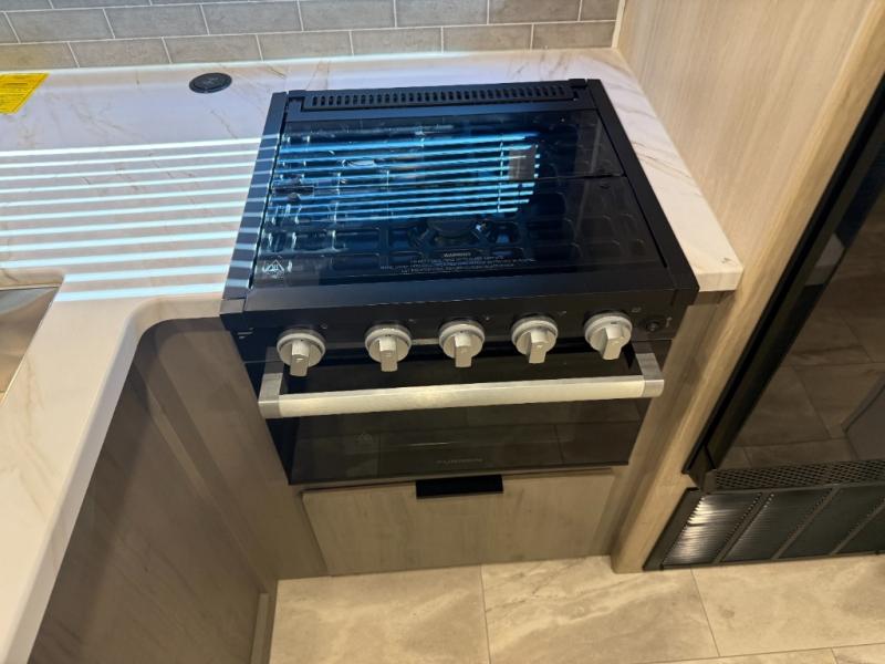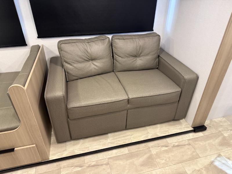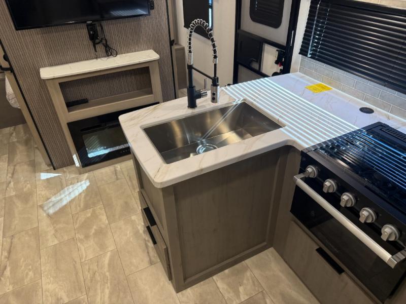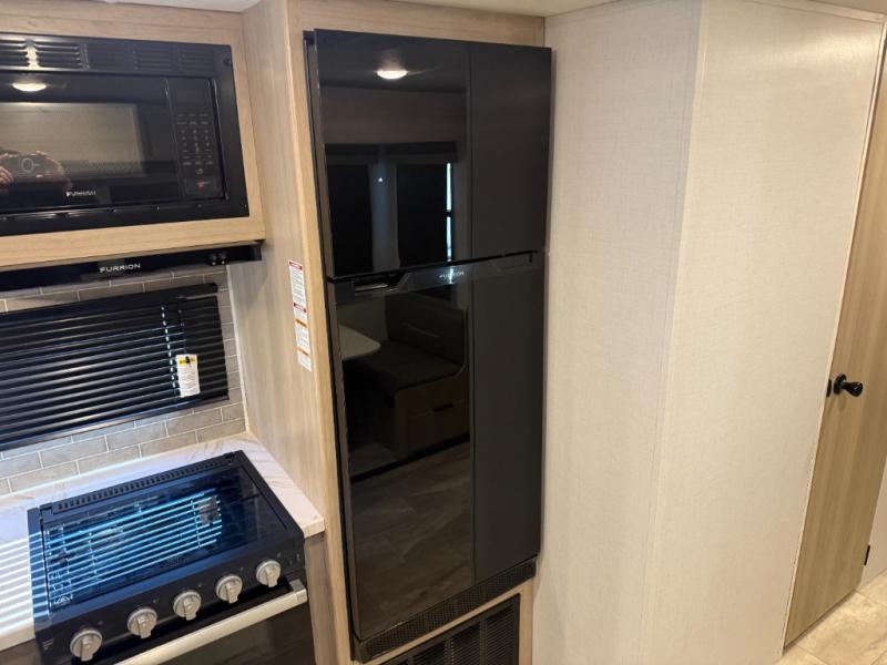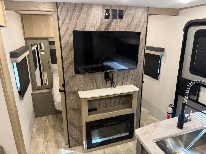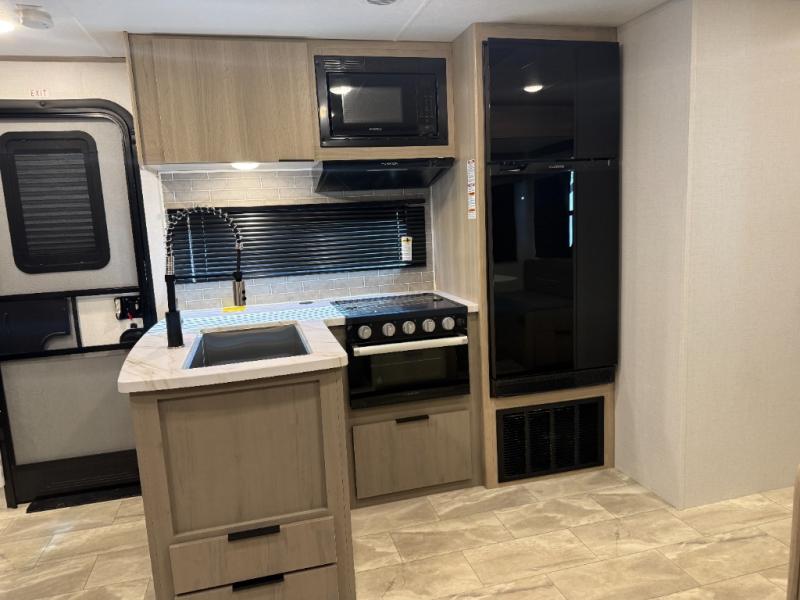 This travel trailer is perfect for weekend excursions or extended getaways at your favorite state park. You will have your own queen bed up front with storage space for your things, and the rear private bunkhouse will be perfect for guests. Here, you'll find a set of bunk beds plus a fold-up bunk over a booth dinette so there is a place to eat or play games back here. The full kitchen will let you cook meals each day, and the 10 cu. ft. refrigerator will keep your food fresh. Outside, a 14' power awning will provide some shade, and an outdoor refrigerator will keep cold drinks close by!
