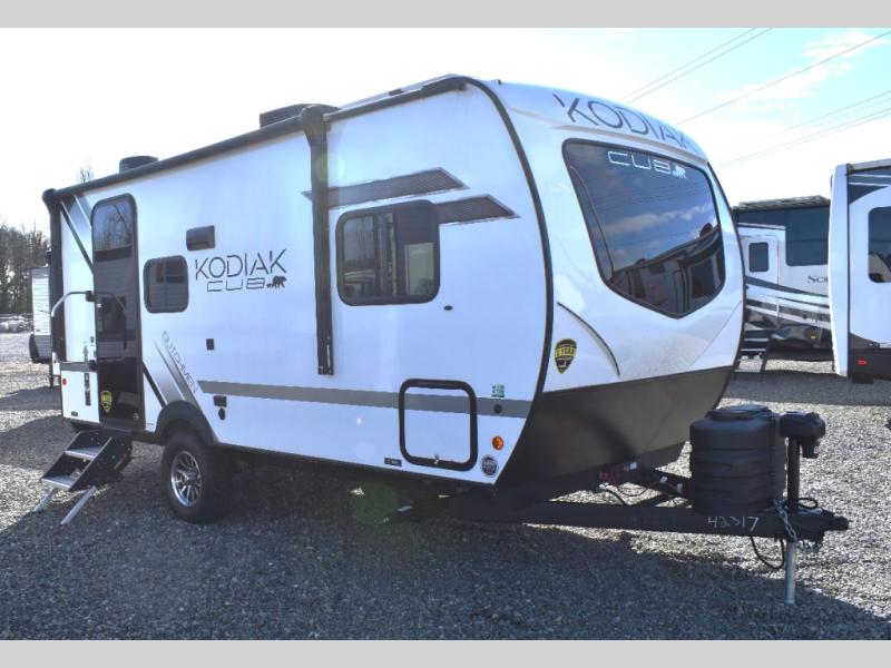 With any Kodiak Cub travel trailer by Dutchmen, you will enjoy lightweight towing and at-home comforts! Each model is constructed with aluminum framing and a laminated roof, plus front diamond plate protection against rock and debris. You will also find a power tongue jack outside, along with hybrid aluminum steps, plus electric front and rear stabilizer jacks for easy set-up. Head inside to enjoy the roller night shades, Home Series interior decor collection, and seamless countertops. There is also a central command center, a Bluetooth speaker, HyperDeck flooring, plus a furnace and A/C unit to keep you comfortable year around!
