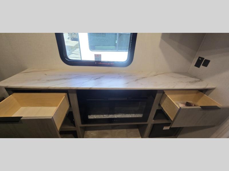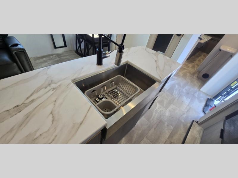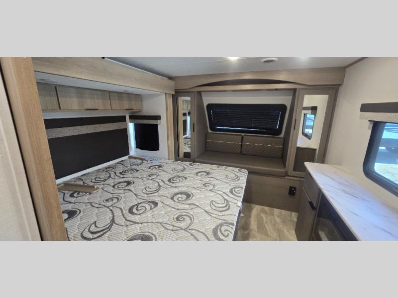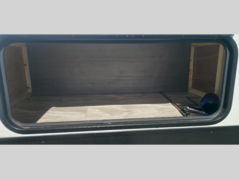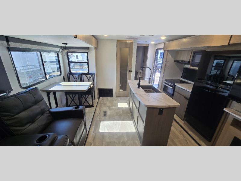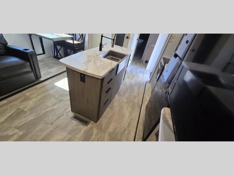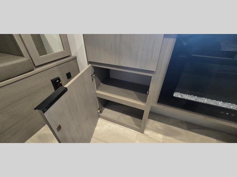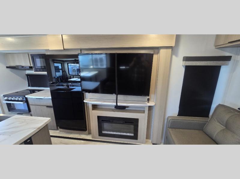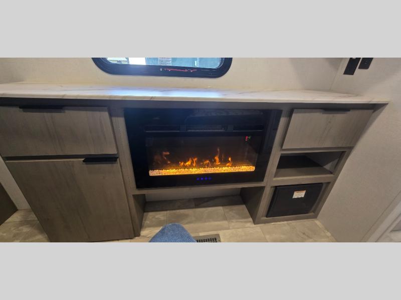 You will feel right at home in this spacious travel trailer that can sleep five people each night. The kitchen island includes a stainless kitchen sink, a three burner cooktop, plus a 10 cu. ft. 12V refrigerator for perishables. There is also an outside kitchen, which will make the outdoor cook very happy! The pass-through storage will be perfect for bringing along fishing poles or hiking gear, and there is a 20' power awning with LED lights if you enjoy relaxing outdoors in the evenings. Get cleaned up in the walk-through bath before heading off to the front master bedroom each night. You'll love the slide out king bed, the bedroom fireplace, and the front bench seat to read a book or two!