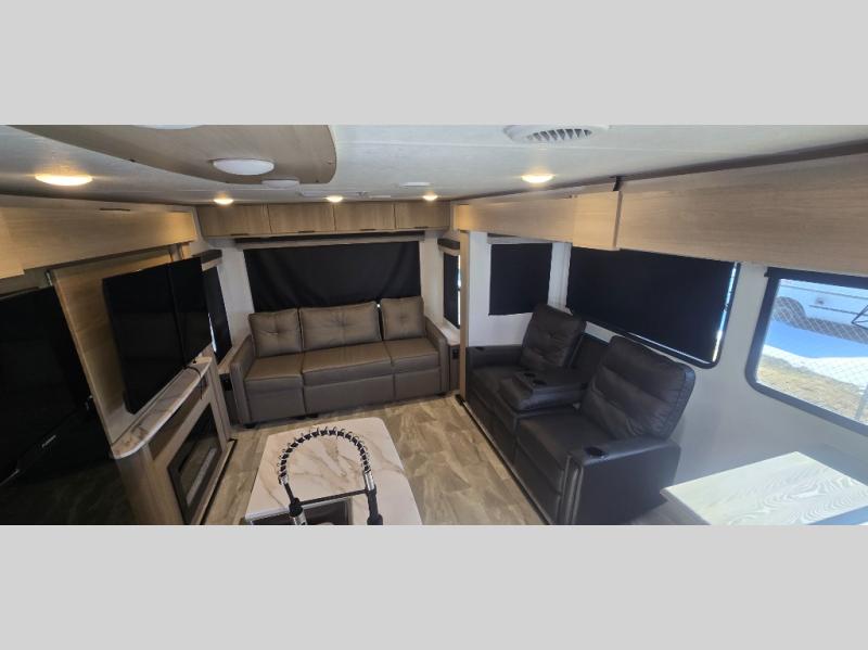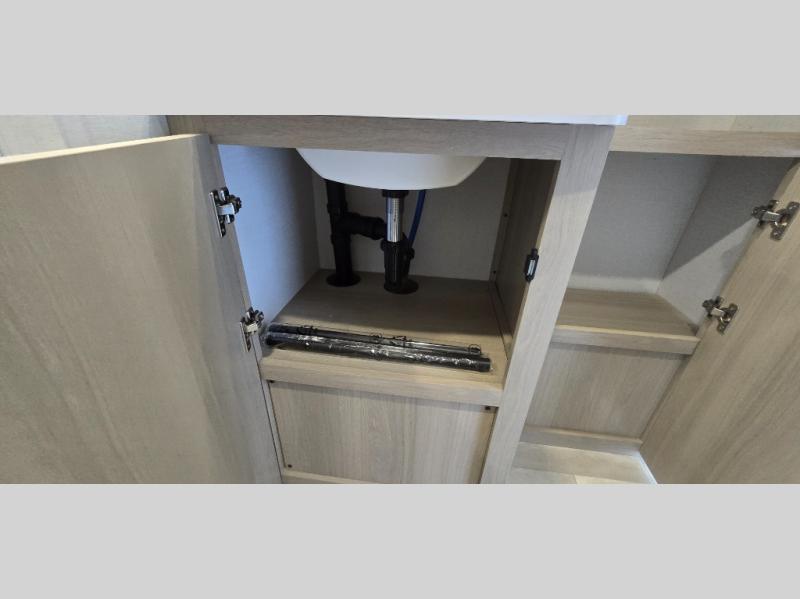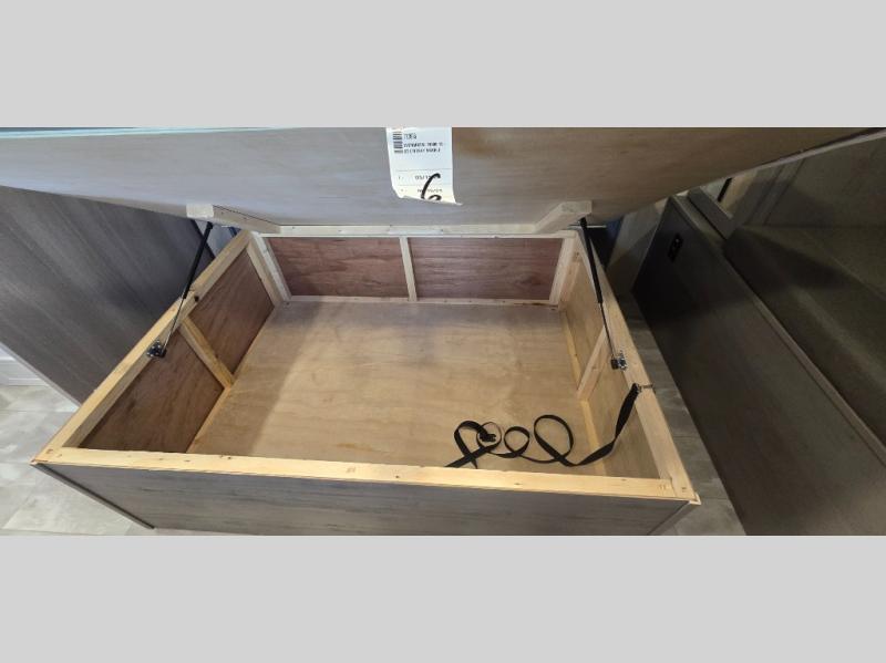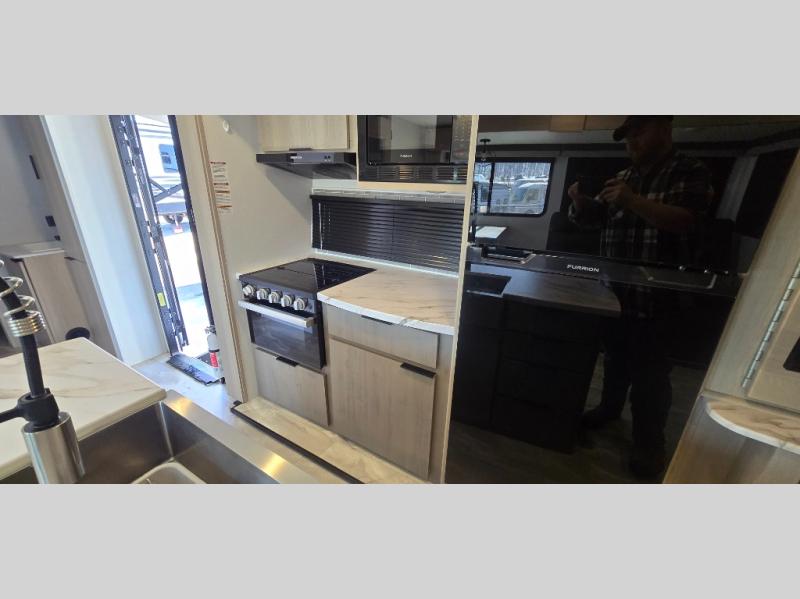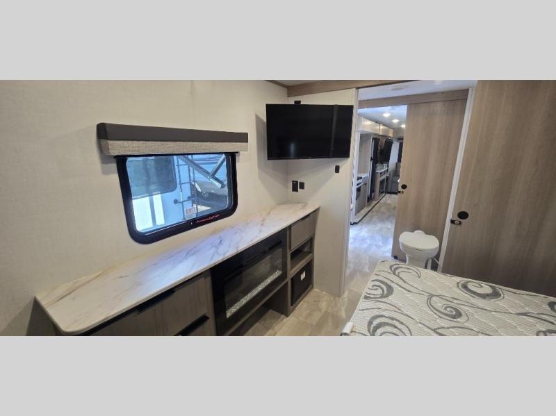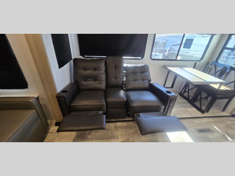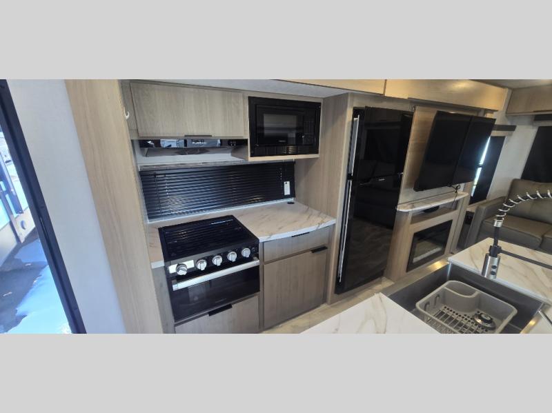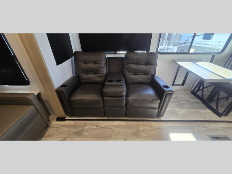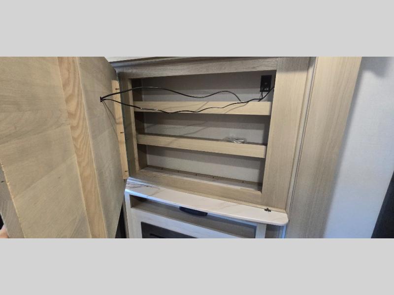 You will feel right at home in this spacious travel trailer that can sleep five people each night. The kitchen island includes a stainless kitchen sink, a three burner cooktop, plus a 10 cu. ft. 12V refrigerator for perishables. There is also an outside kitchen, which will make the outdoor cook very happy! The pass-through storage will be perfect for bringing along fishing poles or hiking gear, and there is a 20' power awning with LED lights if you enjoy relaxing outdoors in the evenings. Get cleaned up in the walk-through bath before heading off to the front master bedroom each night. You'll love the slide out king bed, the bedroom fireplace, and the front bench seat to read a book or two!
