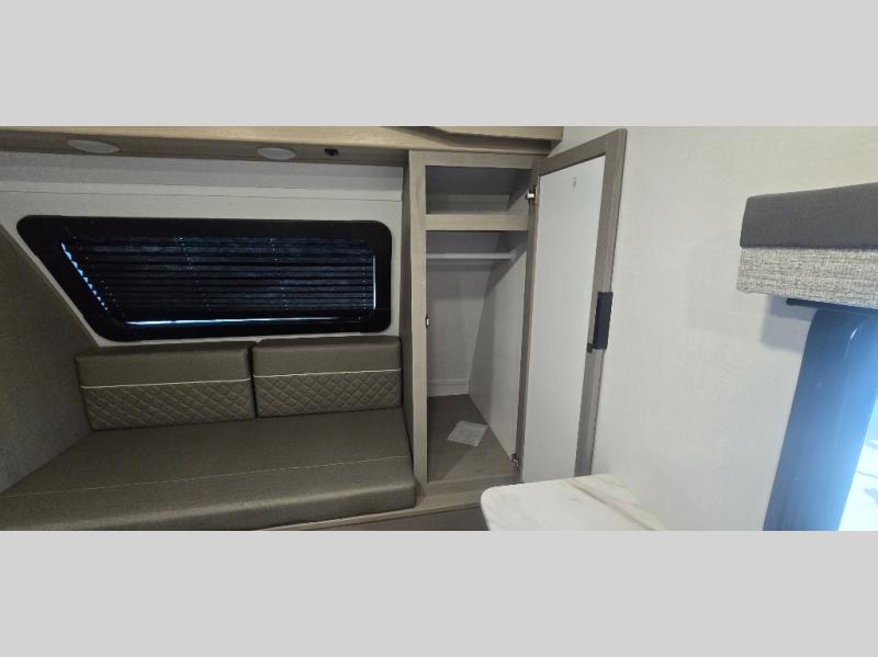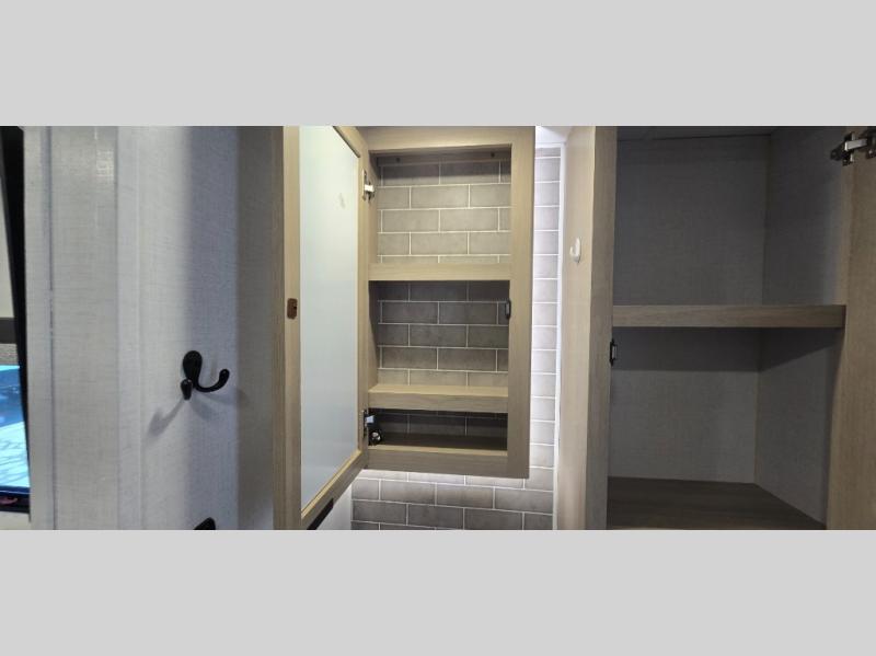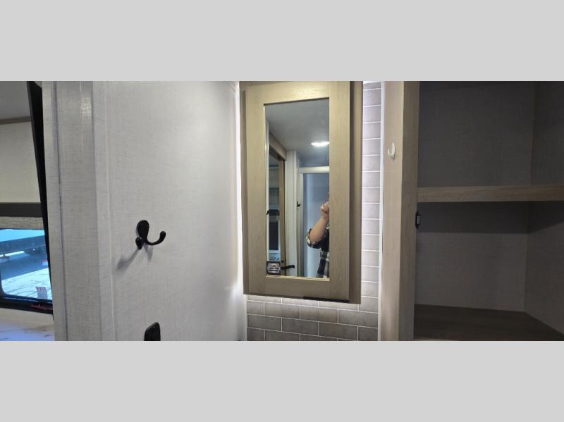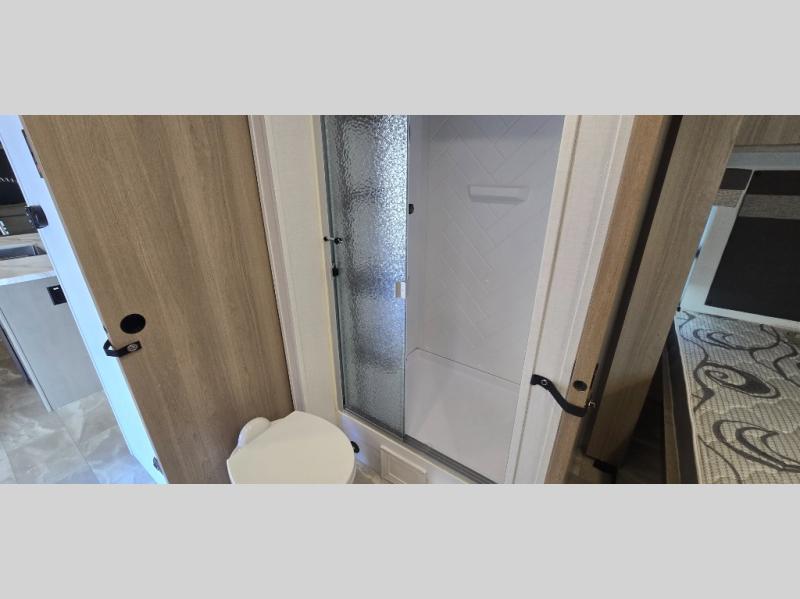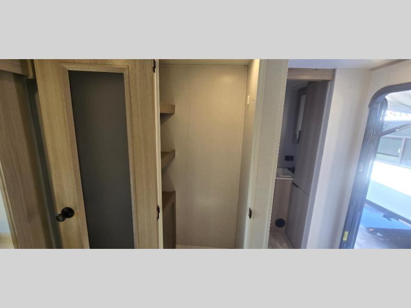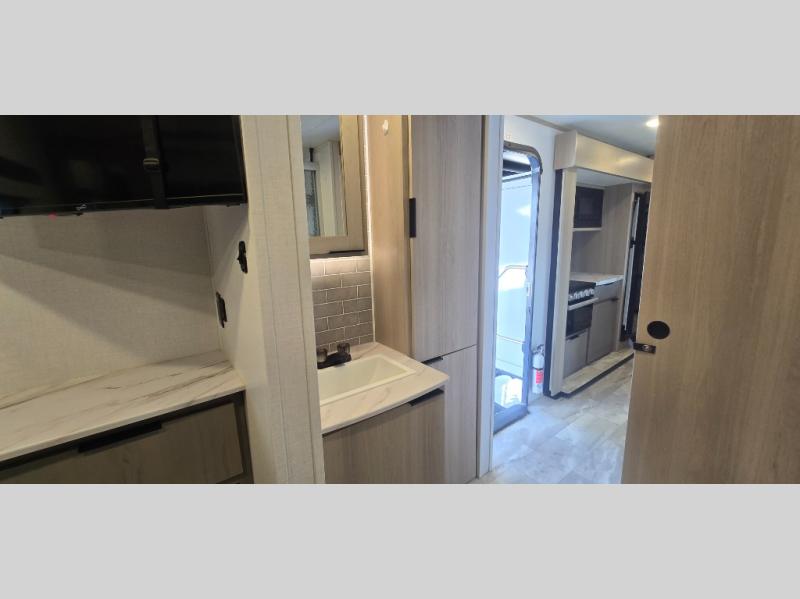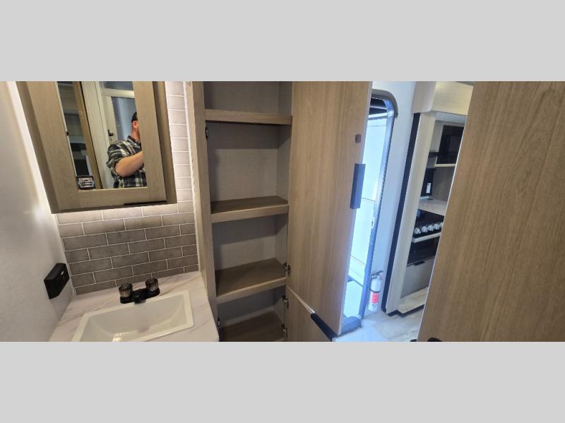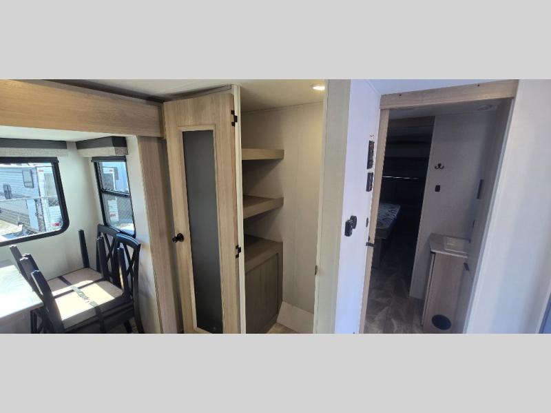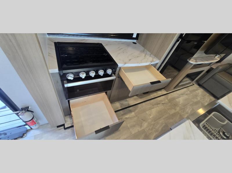 You will feel right at home in this spacious travel trailer that can sleep five people each night. The kitchen island includes a stainless kitchen sink, a three burner cooktop, plus a 10 cu. ft. 12V refrigerator for perishables. There is also an outside kitchen, which will make the outdoor cook very happy! The pass-through storage will be perfect for bringing along fishing poles or hiking gear, and there is a 20' power awning with LED lights if you enjoy relaxing outdoors in the evenings. Get cleaned up in the walk-through bath before heading off to the front master bedroom each night. You'll love the slide out king bed, the bedroom fireplace, and the front bench seat to read a book or two!