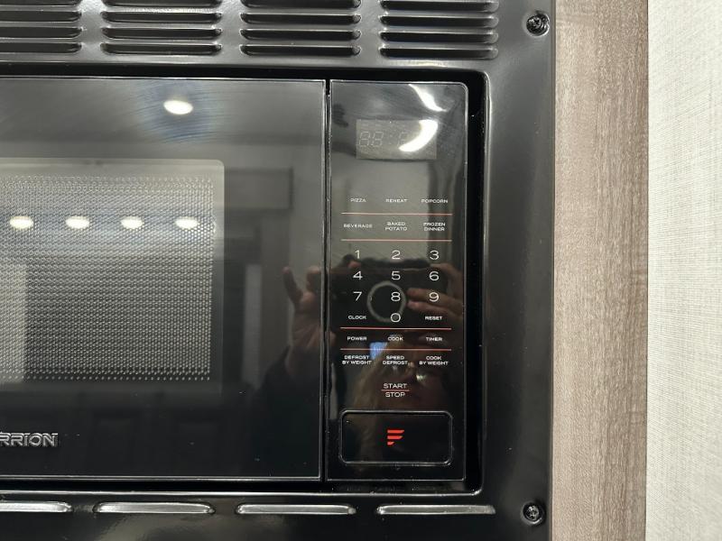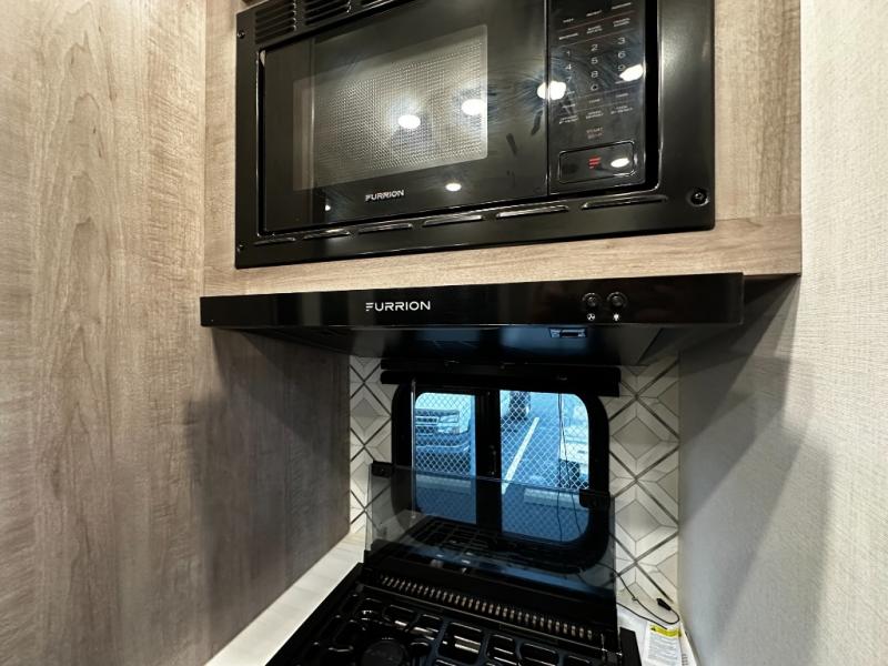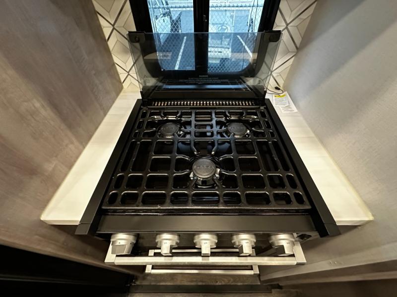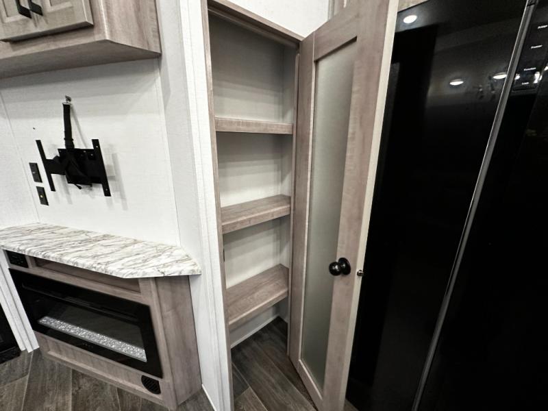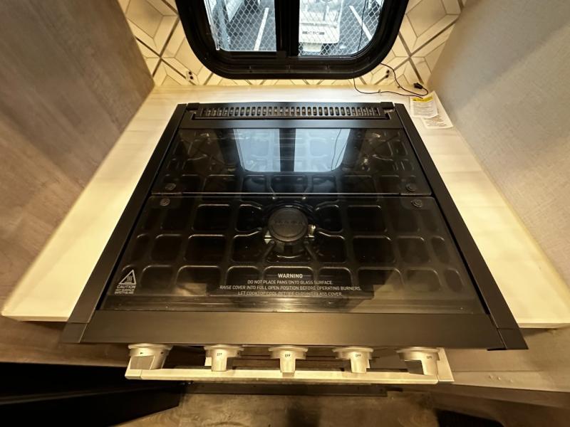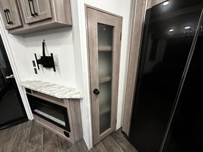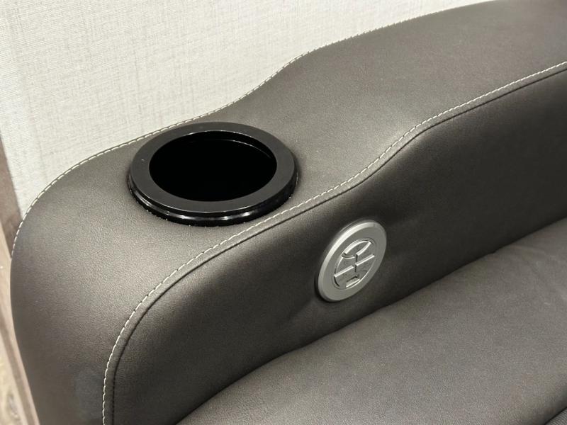 The main living area features theater-style seating inside a slide-out, giving you space to unwind, relax, or watch the 50" TV and enjoy the fireplace after a day of adventure.