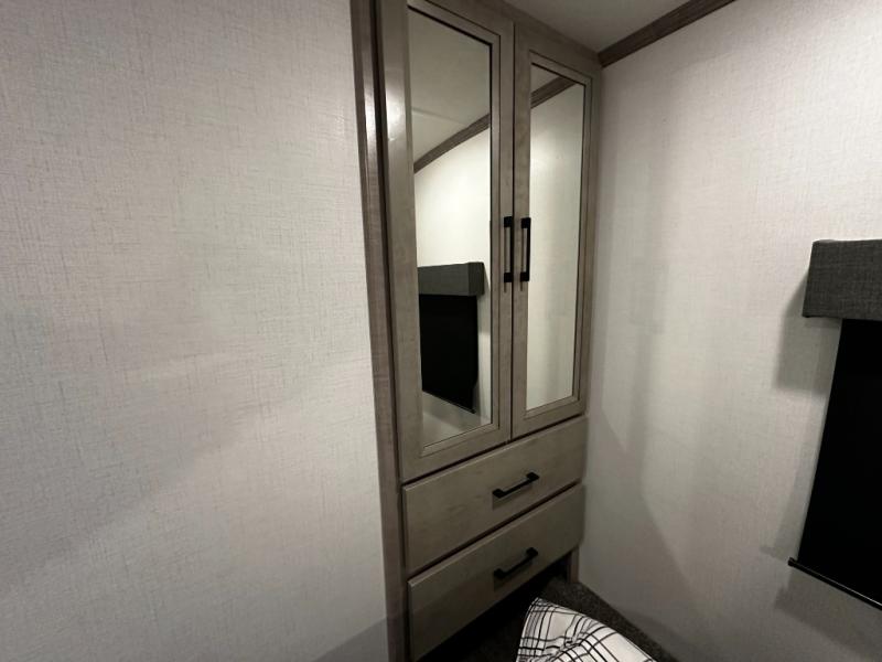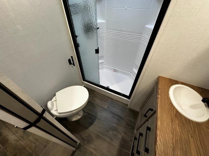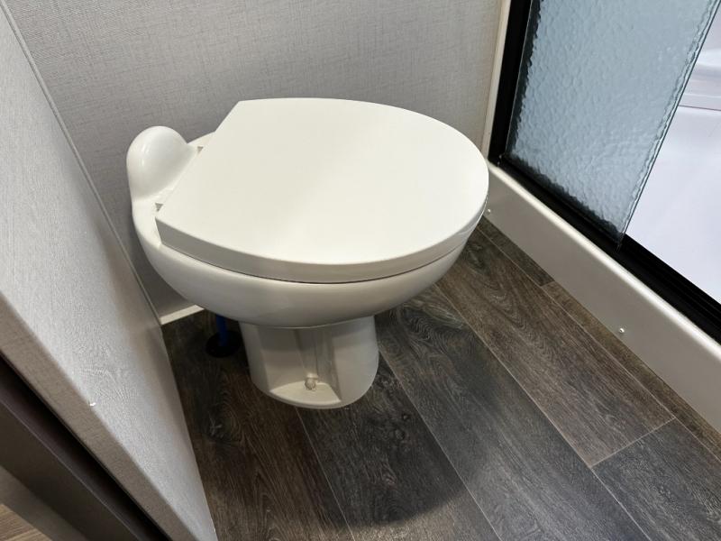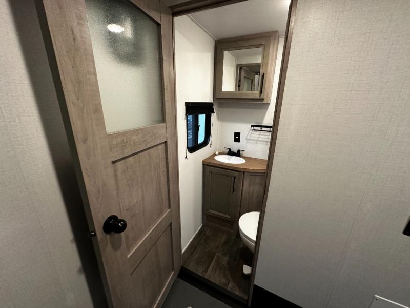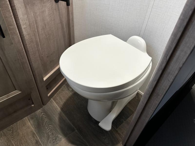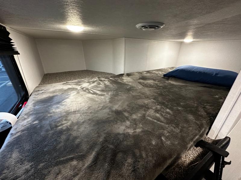 A private front bedroom with a 60" x 80" queen bed provides a cozy retreat after a long day on the road or at the campsite.