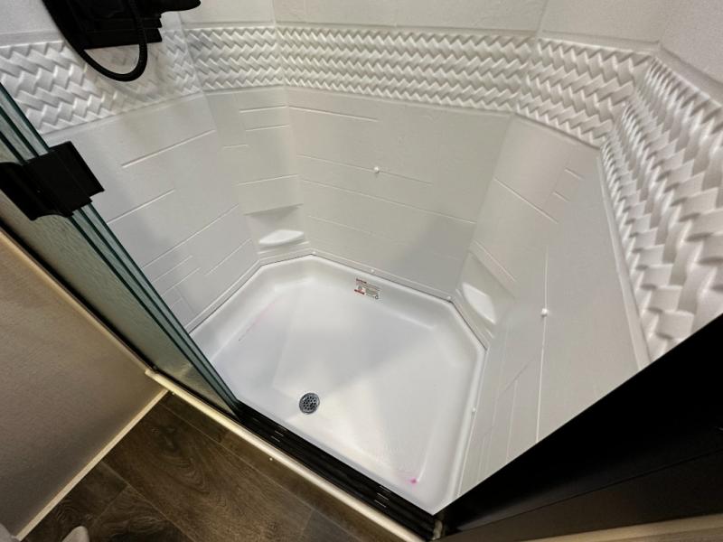 Inside you’ll find a full kitchen (3-burner cooktop with oven, large 16 cu-ft 12V refrigerator, deep stainless sink, useful counter space), a full-size bath with a 50" walk-in shower with seat and skylight, and an additional half-bath in the garage — perfect for convenience when you come in covered in dirt or mud.