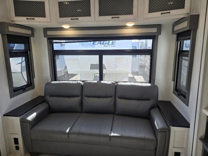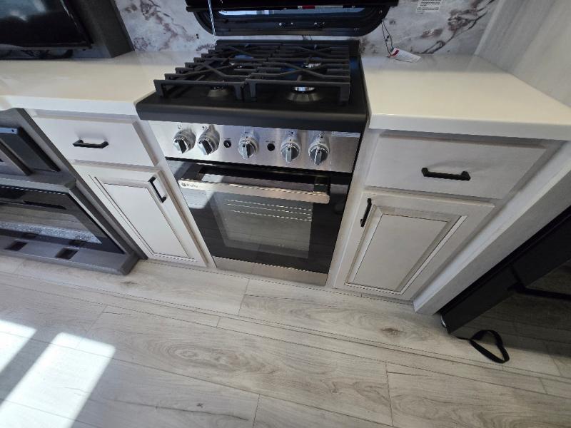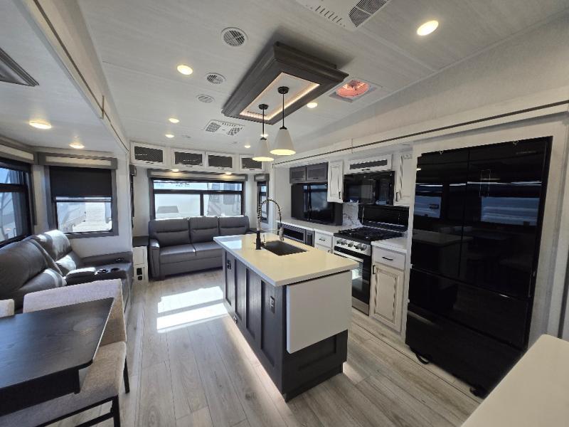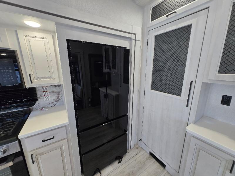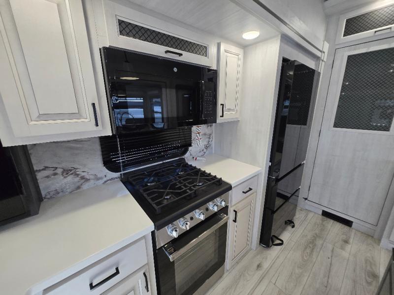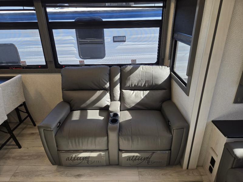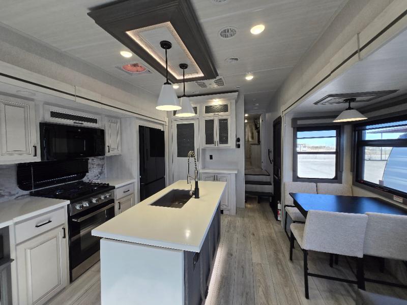 Besides the dimensions and the weights, the only real difference between this Ahara fifth wheel and model 325RL is the bedroom and bathroom configuration. This model offers you a private bedroom that has a king bed slide with drawers under the bed, a sliding dresser top with hidden storage across from the bed for adding a TV, a closet with washer/dryer prep, and a large closet with sliding doors for your clothes. The full bathroom is located right next to the bedroom, but it is separate from the bedroom so that it can offer you a dual-sink vanity which is helpful because it allows two people to wash their face and brush their teeth at the same time. The kitchen is quite amazing with its kitchen island with countertop extensions, pantry and hutch, 16-cubic foot 12V refrigerator, and 24" residential oven. As you sit back on the theater seating or 78" sofa, you'll be kept warm by the 5,100 BTU electric fireplace below the TV.