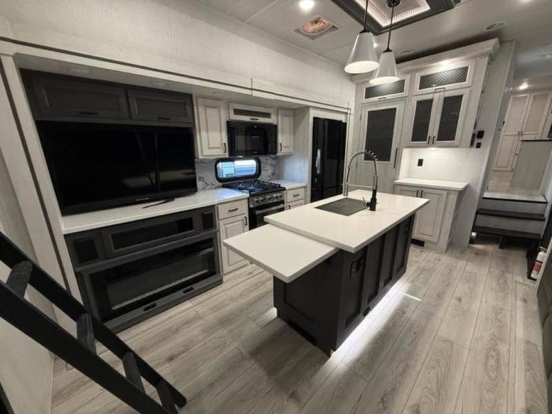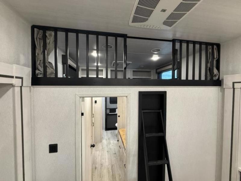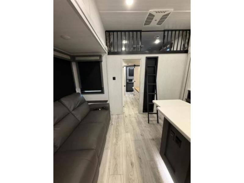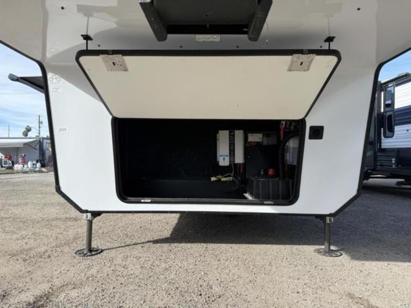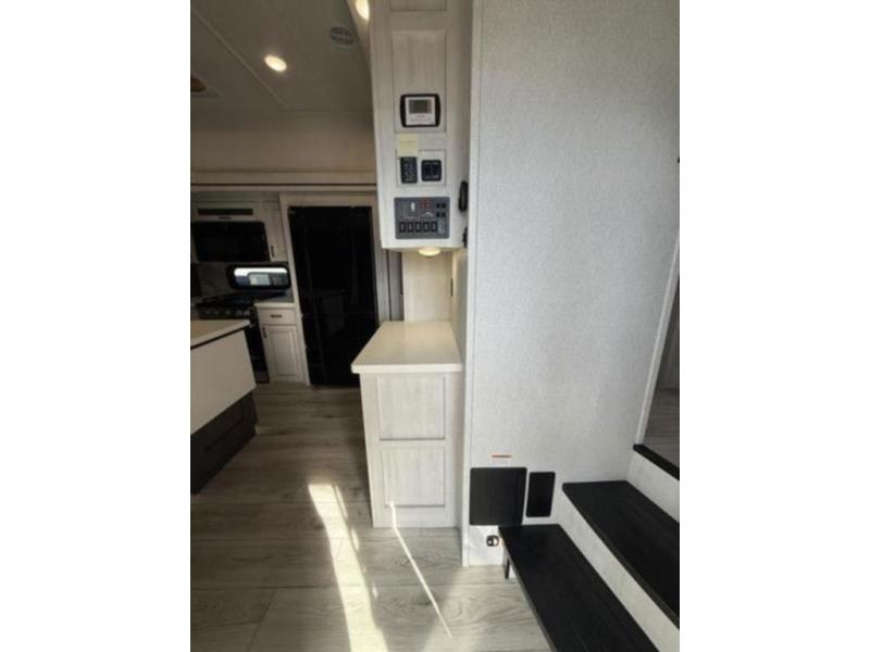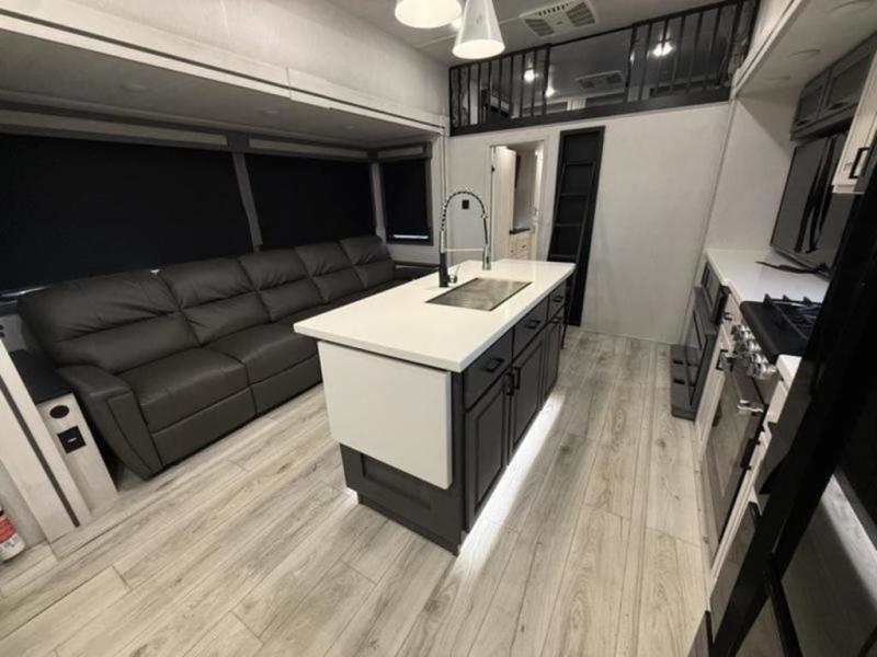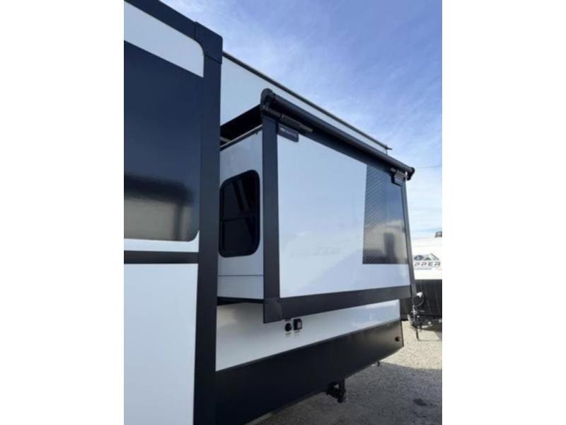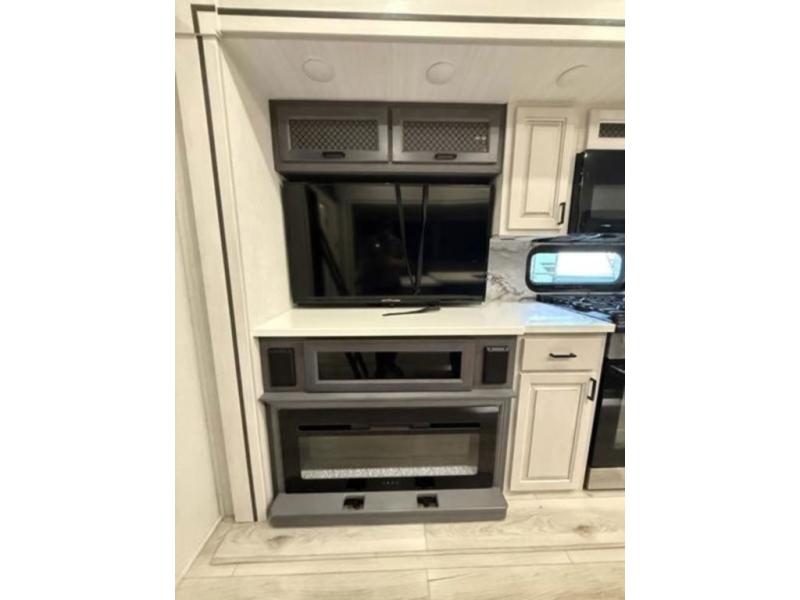 If you're looking for a luxury fifth wheel with more space for friends and family, you've found it in this Ahara! The main entry door opens up to the living area with dual opposing slides, a 50" LED TV with a fireplace, plus a full kitchen with residential appliances, a hutch, and even a pantry for dry goods and snacks. Everyone can meet here in the evenings to dine at the free-standing dinette or relax on the theater seating. You'll love the rear master suite with its king bed slide out, drawers under the bed, and full rear bath with the unique rear second entry door. And check out the Ahara Sky Suite loft above this room for even more sleeping or storage space! Your guests will find the front private bedroom to be accommodating since it includes a king bed slide out, drawers under the bed, plus a large wardrobe to keep clothes tidy. There is also a closet with washer and dryer prep. Who knows, you may just choose this bedroom for your own!