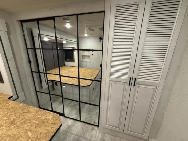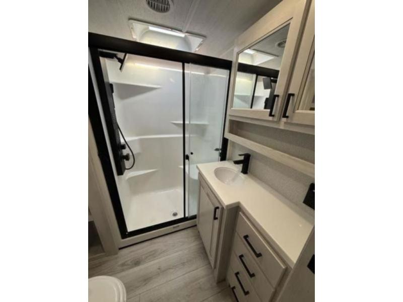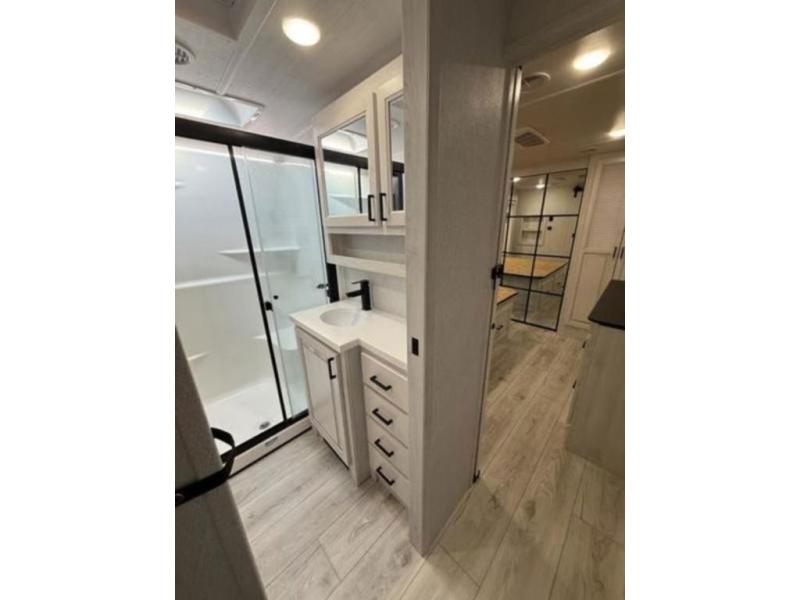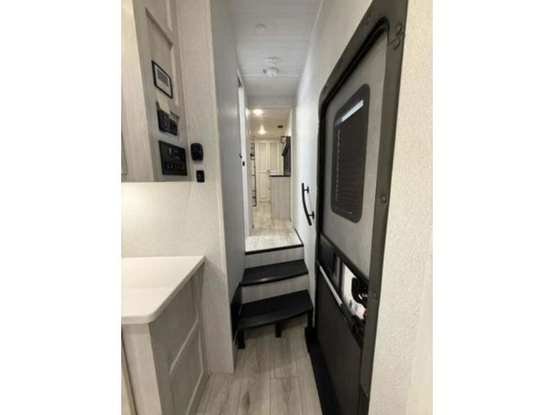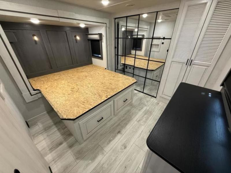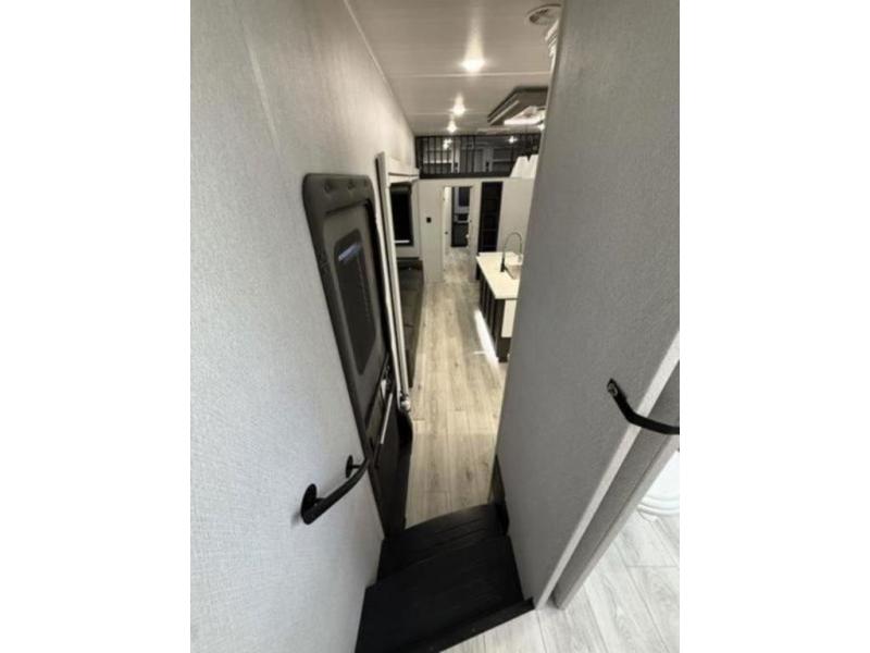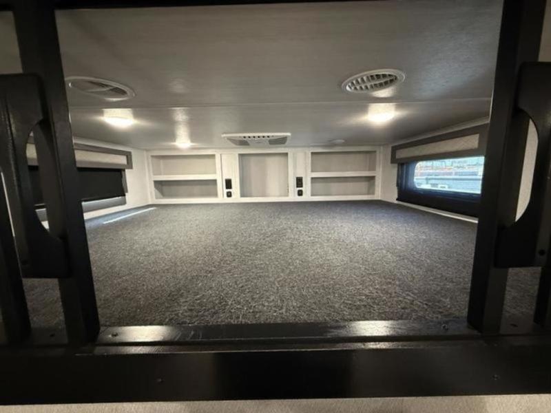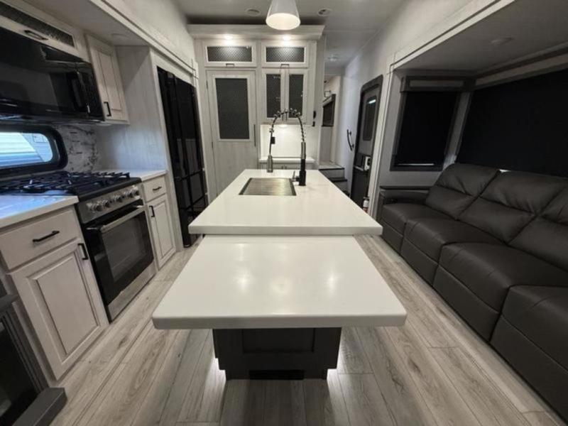 If you're looking for a luxury fifth wheel with more space for friends and family, you've found it in this Ahara! The main entry door opens up to the living area with dual opposing slides, a 50" LED TV with a fireplace, plus a full kitchen with residential appliances, a hutch, and even a pantry for dry goods and snacks. Everyone can meet here in the evenings to dine at the free-standing dinette or relax on the theater seating. You'll love the rear master suite with its king bed slide out, drawers under the bed, and full rear bath with the unique rear second entry door. And check out the Ahara Sky Suite loft above this room for even more sleeping or storage space! Your guests will find the front private bedroom to be accommodating since it includes a king bed slide out, drawers under the bed, plus a large wardrobe to keep clothes tidy. There is also a closet with washer and dryer prep. Who knows, you may just choose this bedroom for your own!