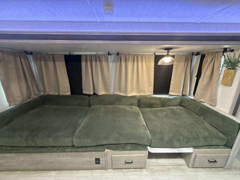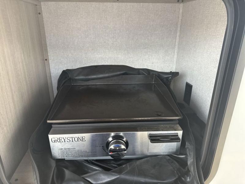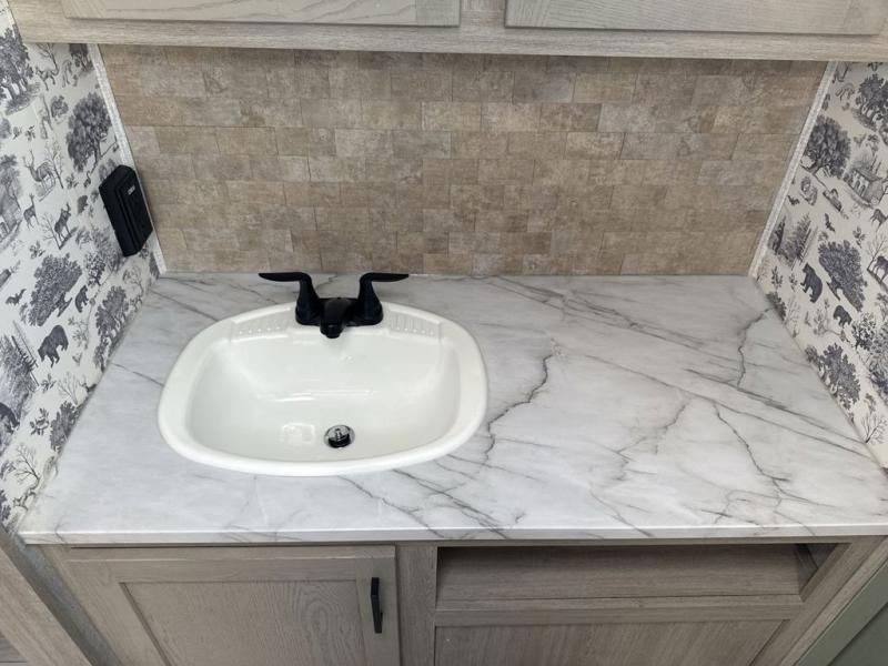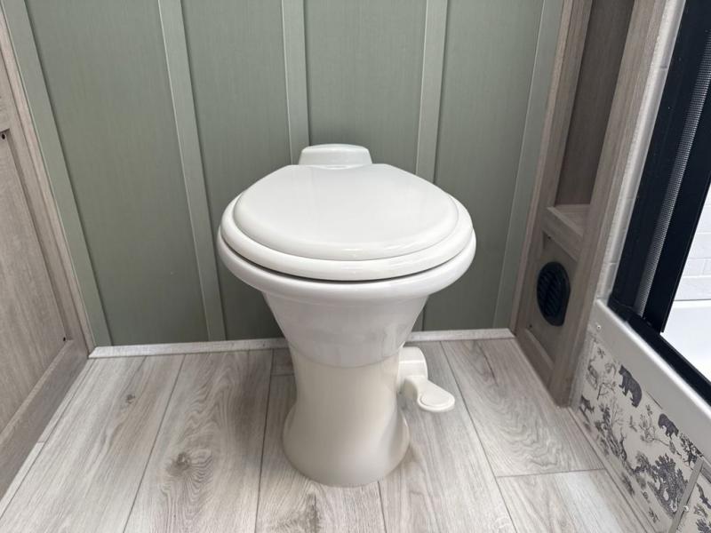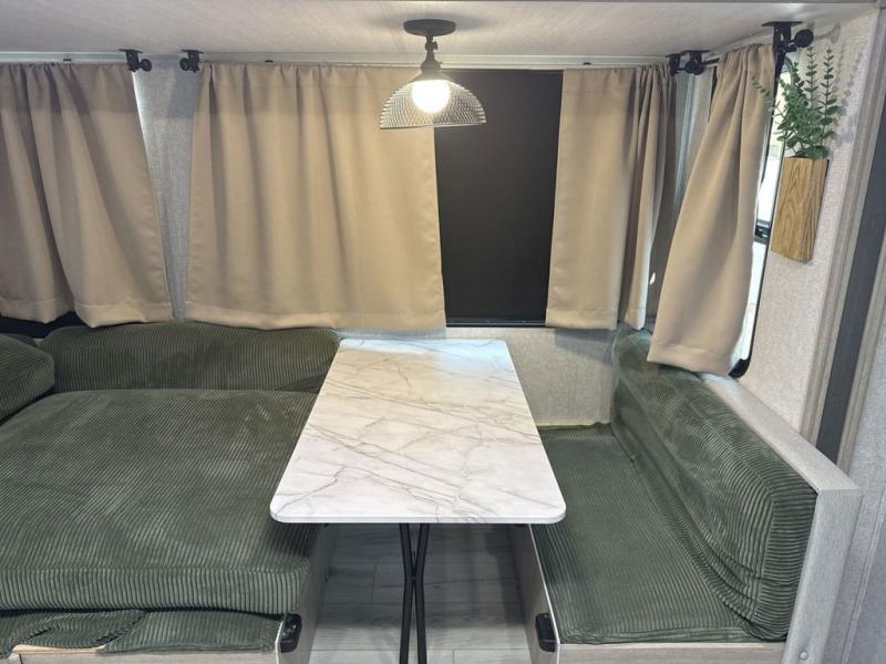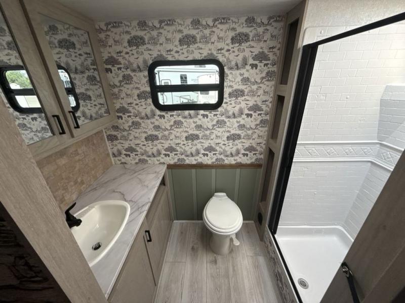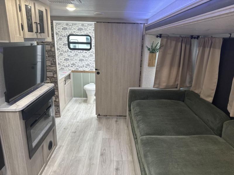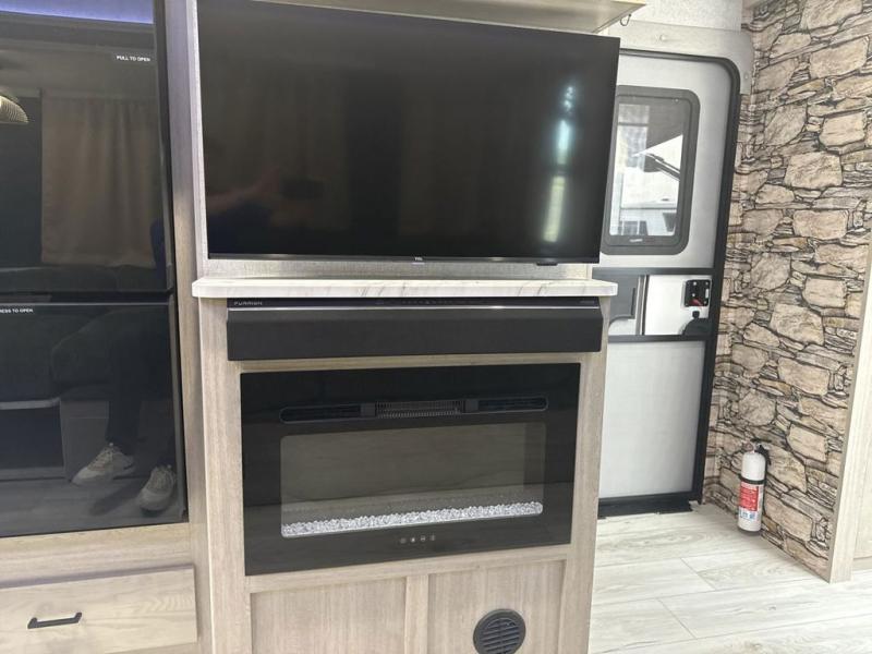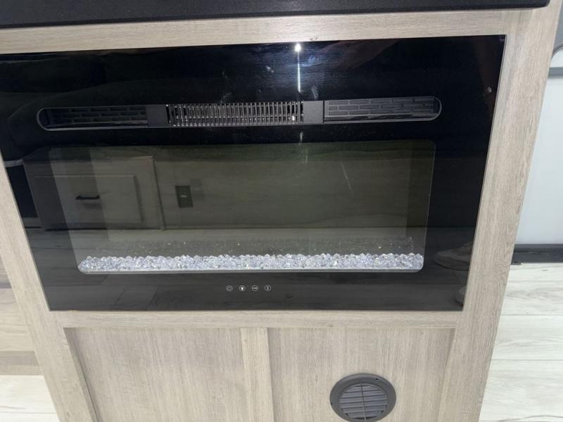 Wow! Check out the spacious full rear bath in this travel trailer for five! You'll appreciate a linen closet here and a shower skylight to let natural light in. Your crew can get comfortable on the tri-fold sofa that sits directly across from the fireplace for a more cozy feel. There is also a booth dinette here with storage space underneath for board games. Head to the kitchen to prepare dinner on the three burner cooktop, and use the countertop extension to cut fresh fruits and vegetables. A front private bedroom with a king bed and dual wardrobes will have you feeling right at home. Start camping today!