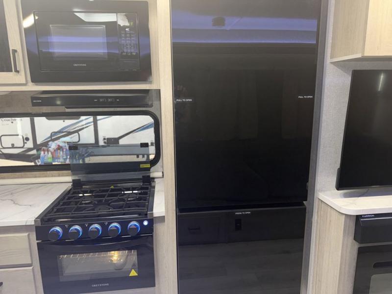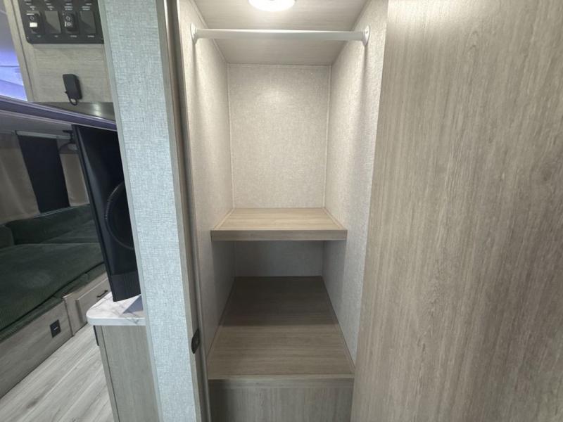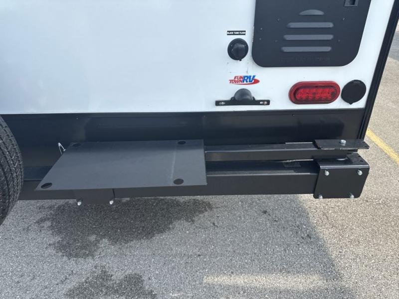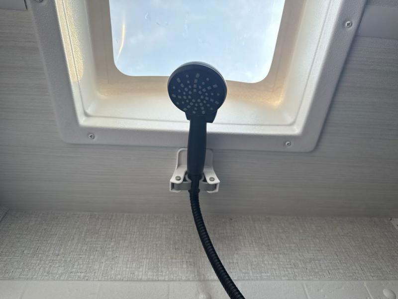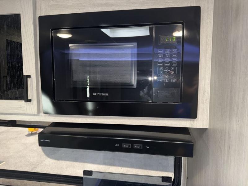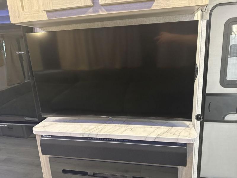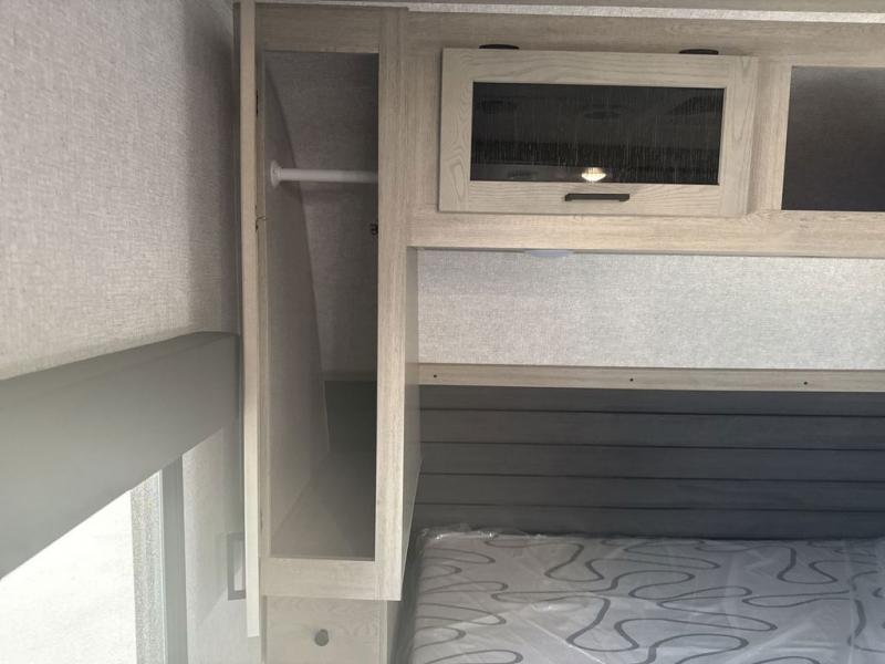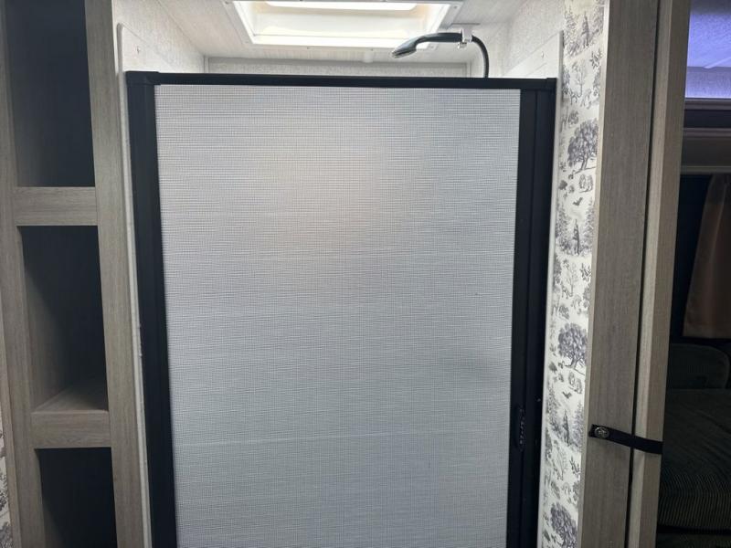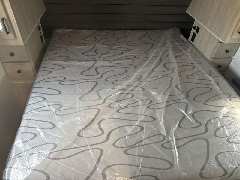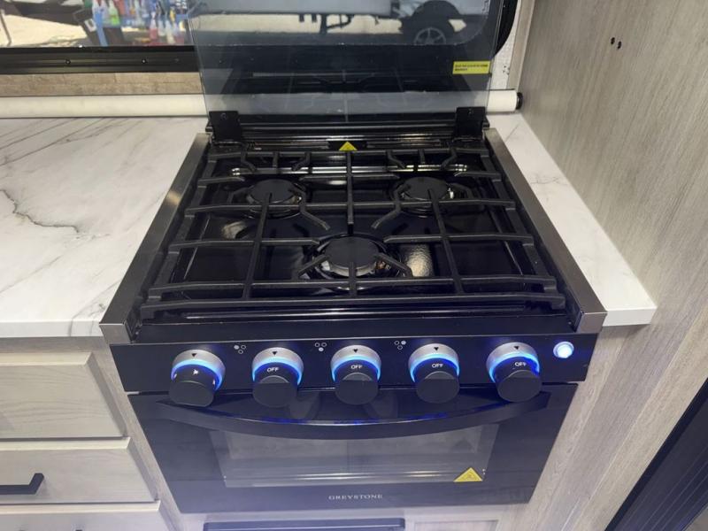 Wow! Check out the spacious full rear bath in this travel trailer for five! You'll appreciate a linen closet here and a shower skylight to let natural light in. Your crew can get comfortable on the tri-fold sofa that sits directly across from the fireplace for a more cozy feel. There is also a booth dinette here with storage space underneath for board games. Head to the kitchen to prepare dinner on the three burner cooktop, and use the countertop extension to cut fresh fruits and vegetables. A front private bedroom with a king bed and dual wardrobes will have you feeling right at home. Start camping today!