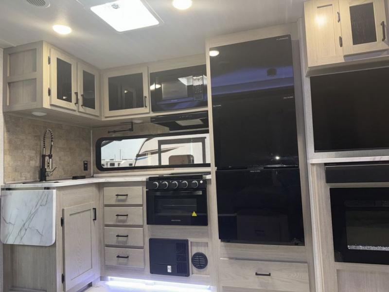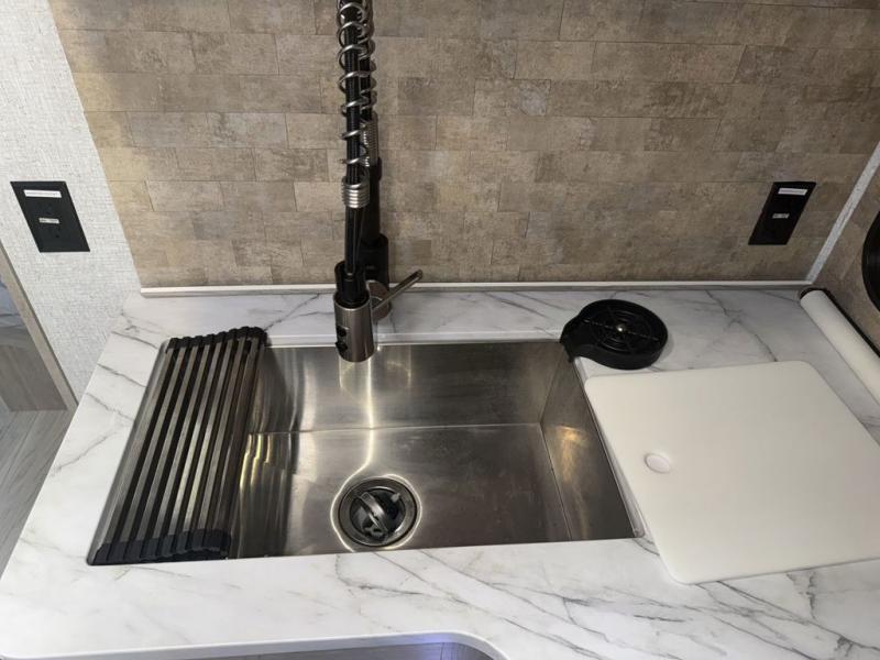 Each Alta travel trailer or toy hauler by EAST TO WEST is constructed with a 5" vacuum bonded roof, an enclosed and heated underbelly, and diamond plate front rock guard for added protection. Outside, you'll find marine-grade exterior speakers, a universal docking station, and back-up camera prep that can be added to make maneuvering in and out of campgrounds easier than ever. Inside, there are 4k interior LED lights, solid pressed membrane countertops, black roller shades, and many more interior comforts you are sure to love.