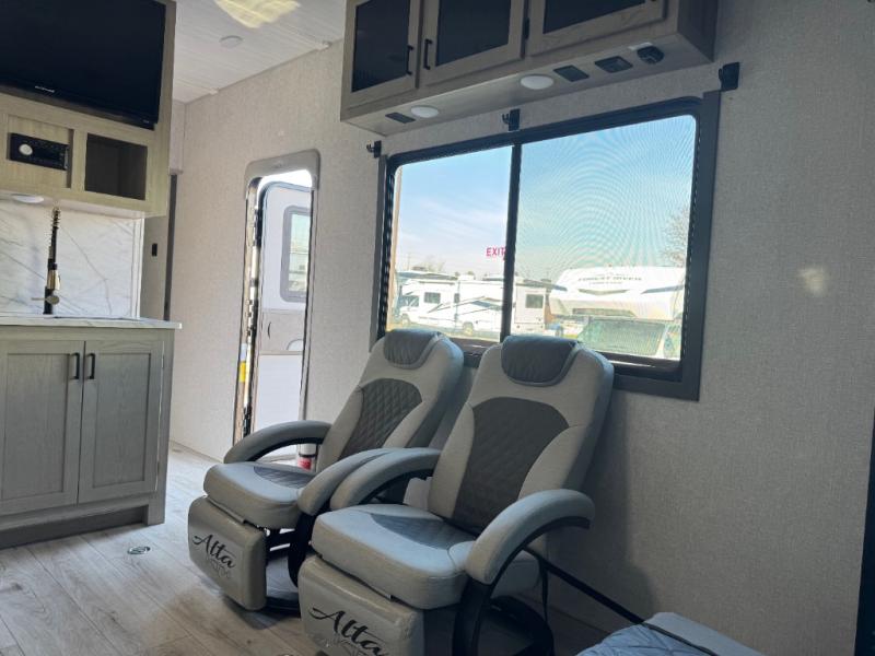 Each Alta travel trailer or toy hauler by EAST TO WEST is constructed with a 5" vacuum bonded roof, an enclosed and heated underbelly, and diamond plate front rock guard for added protection. Outside, you'll find marine-grade exterior speakers, a universal docking station, and back-up camera prep that can be added to make maneuvering in and out of campgrounds easier than ever. Inside, there are 4k interior LED lights, solid pressed membrane countertops, black roller shades, and many more interior comforts you are sure to love.