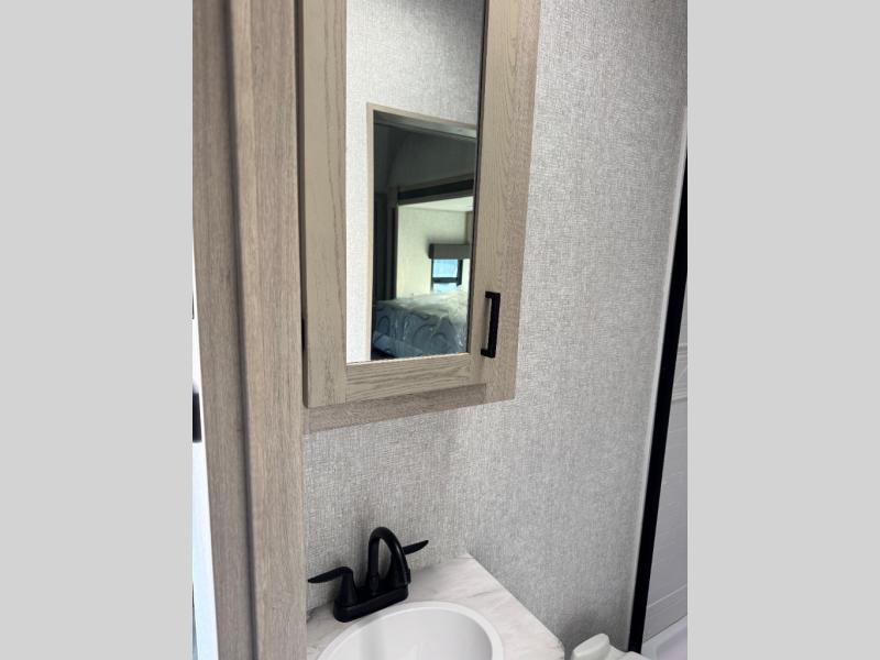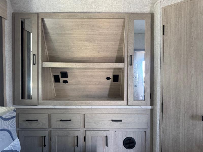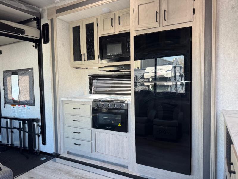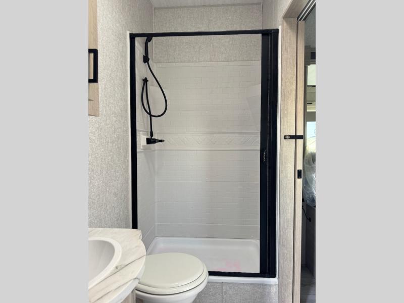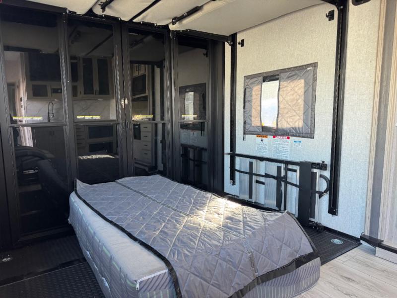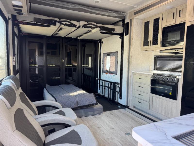 Take your favorite toys and favorite people to your favorite camping spots in this toy hauler! It offers a 14' garage so there is plenty of room for all your toys with a 97" x 92" ramp door with patio kit for easy loading and unloading. A Happi-jack with bunk above opposing sofas with a table in between means you will get lots of flexible use out of the space. The kitchen comes with a 10.7 cu. ft. 12V black glass refrigerator and three-burner range, and you can relax in one of the two recliners after dinner. At night retire to the front bedroom with its king bed slide, wardrobe, dresser, and dual entry bath with shower and skylight. This model also comes with the mandatory West Coach Power Package with a 400 watt solar panel, a 30 Amp controller and a second battery to keep you going!