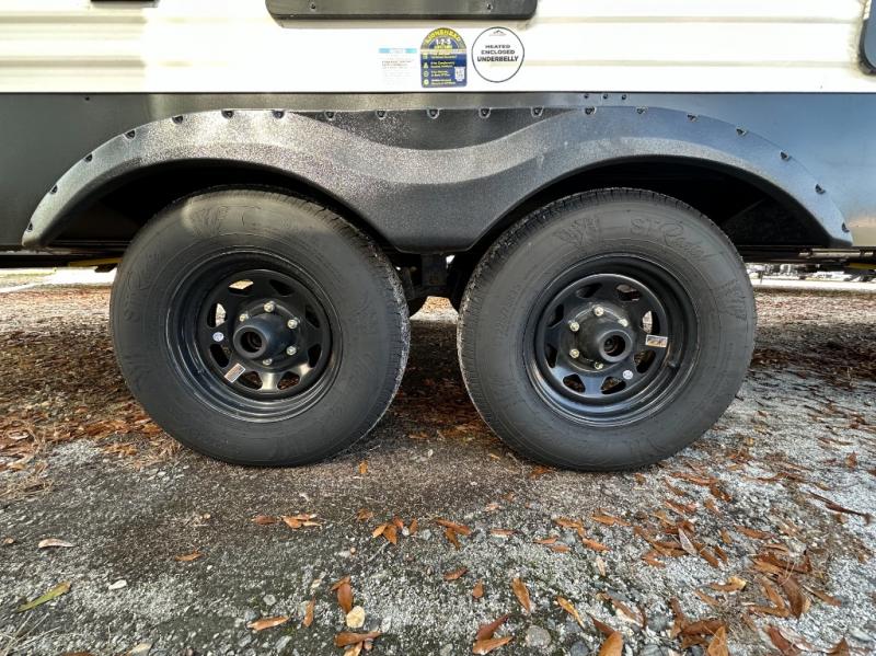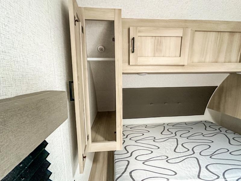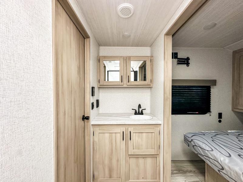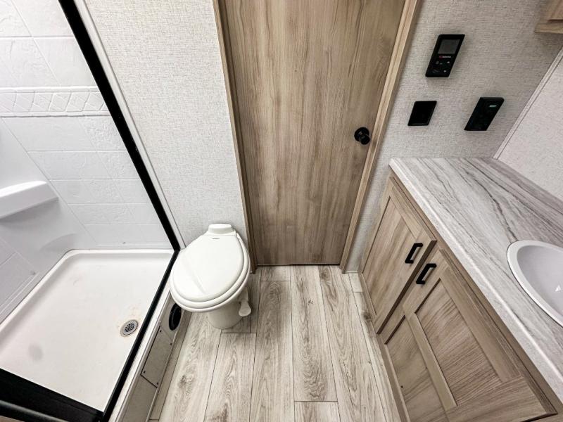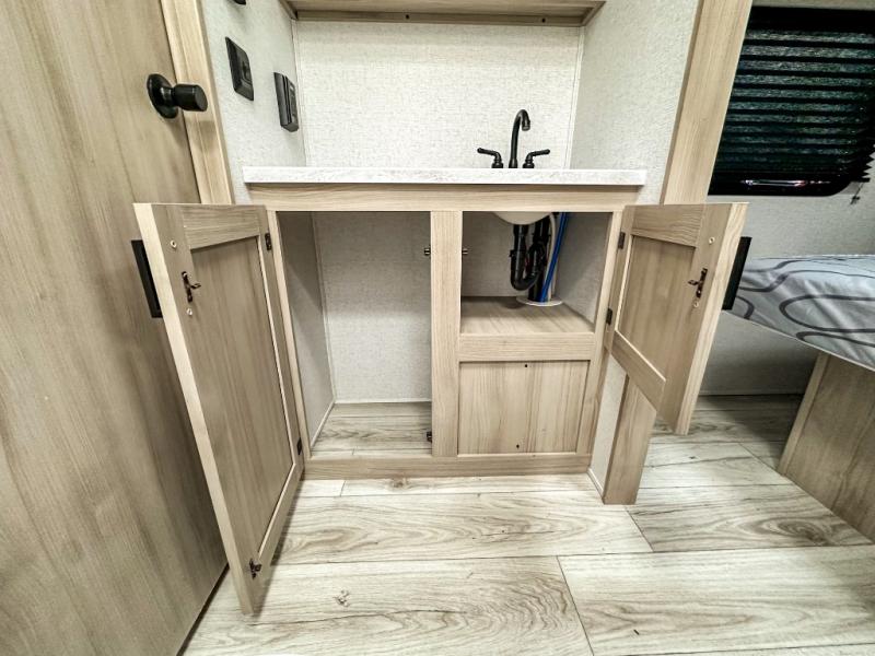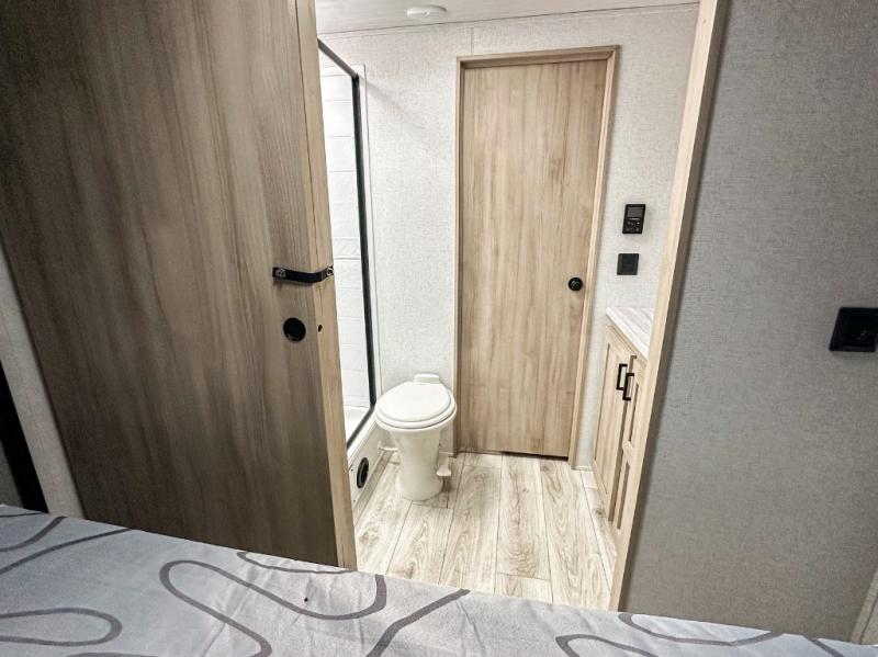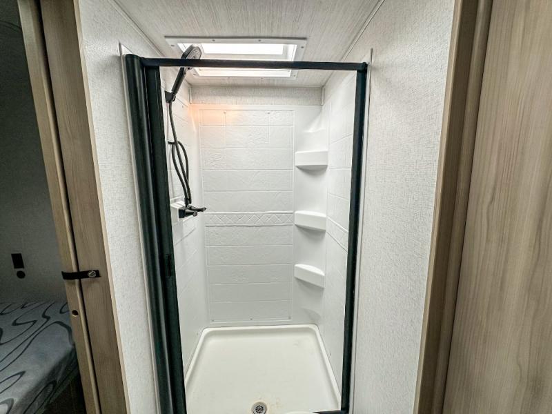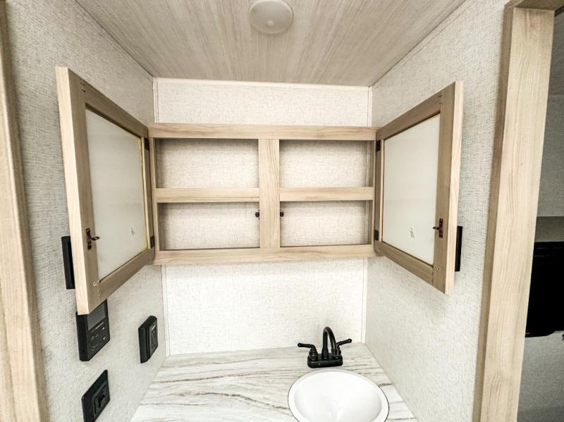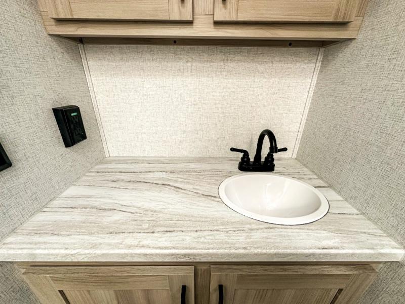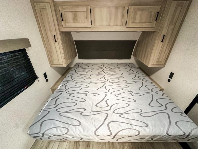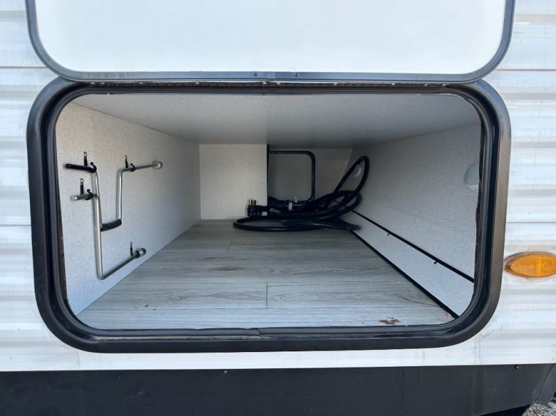 When you are wanting a little more interior space in your next travel trailer, take a look inside! This large slide out widens the main living space so you can easily make meals using full amenities without having to move for someone walking from the front bedroom and walk-through bath to the U-shaped dinette in the back. For sleeping, there is a king-size bed with storage on both sides at the very front of this unit giving you privacy from the rest, and even a private second entry/exit door from within the bedroom. You will find storage beneath the bed for larger items or extra blankets, plus a space saving sliding door. The U-shaped dinette and jackknife sofa offer comfortable seating as well as extra sleeping space for overnight guests, and the fireplace is just a nice feature to enjoy. On the outside, an 18' awning provides a large outdoor living area protected from the elements, and the oversized pass-through will house all of your exterior gear like lawn chairs, outdoor games and rugs, plus so much more!