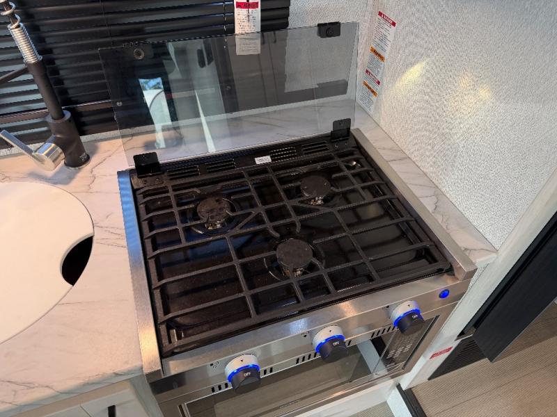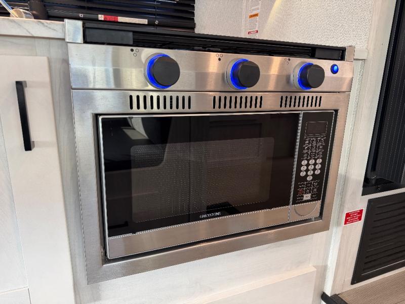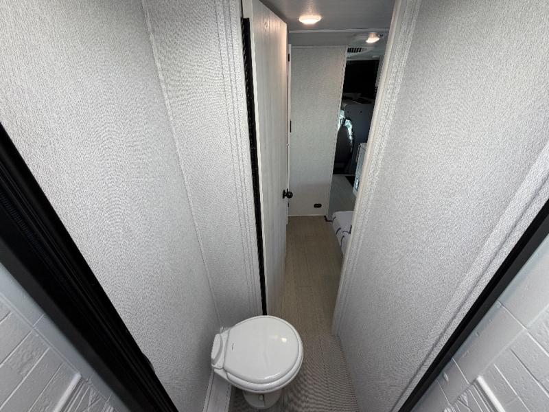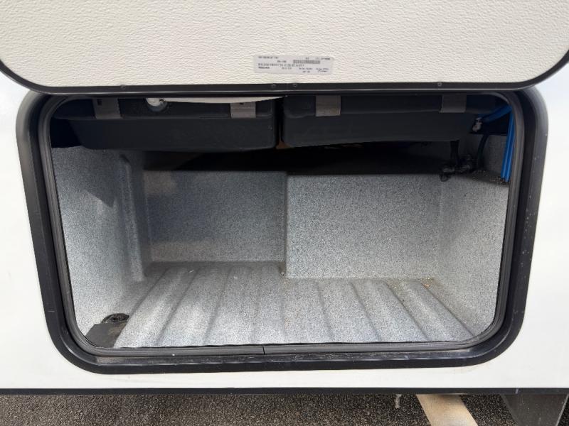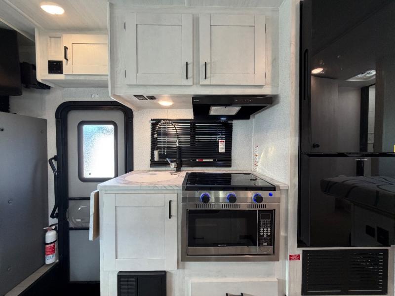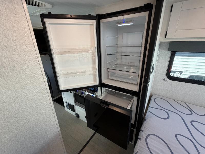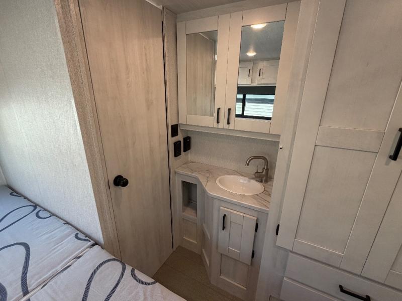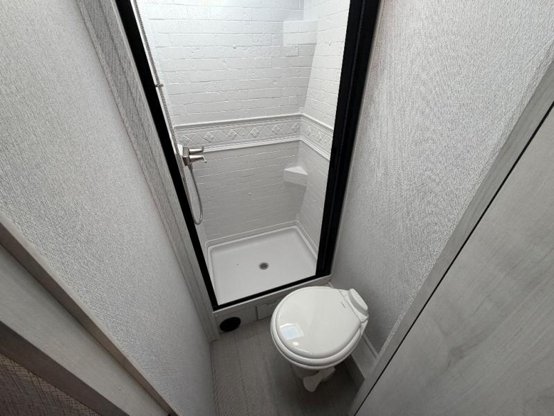 You're going to love traveling and camping in this coach that can sleep five to six each night. The convection microwave and 10.7 cu. ft. 12V refrigerator will let you cook and store food, and the booth dinette provides a place to dine together. A private bath includes a shower and toilet, with the sink just outside this room so two people can freshen up at once. You will sleep soundly each night on the rear corner queen bed with overhead storage for your belongings, while the little ones take the 60" x 80" bunk over cab!