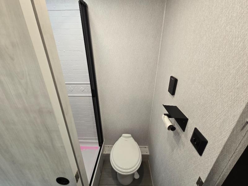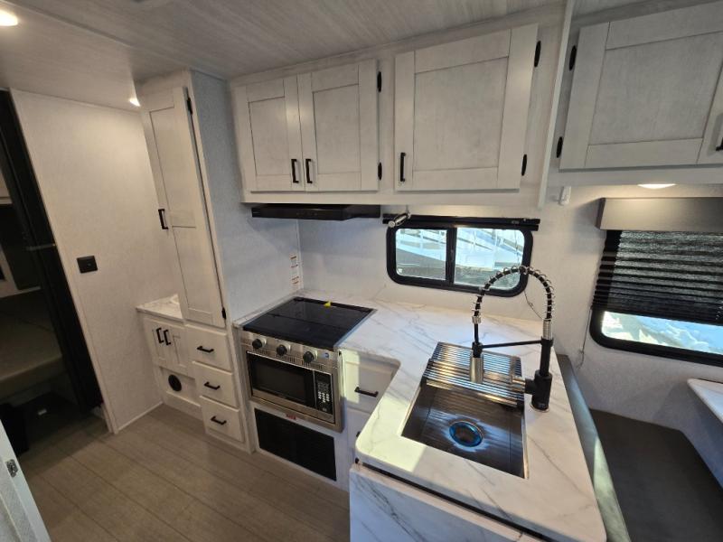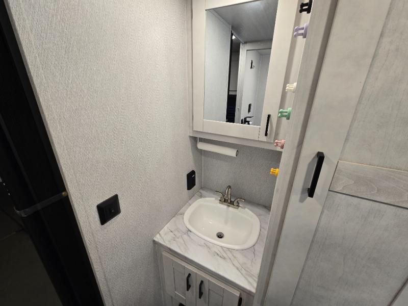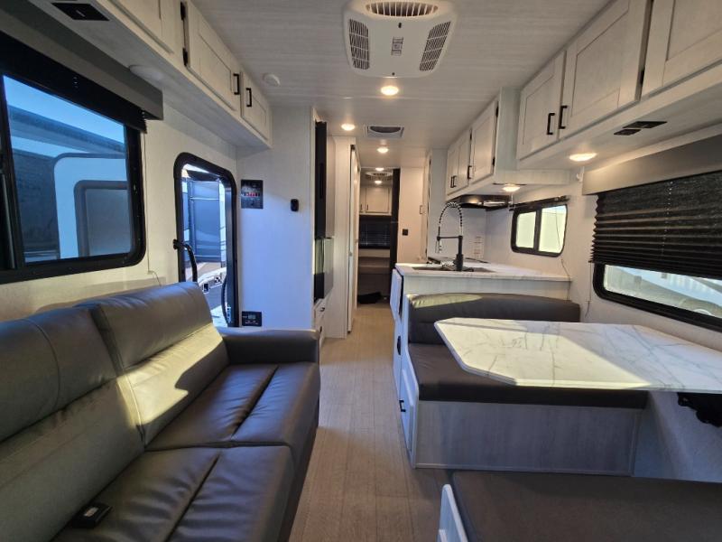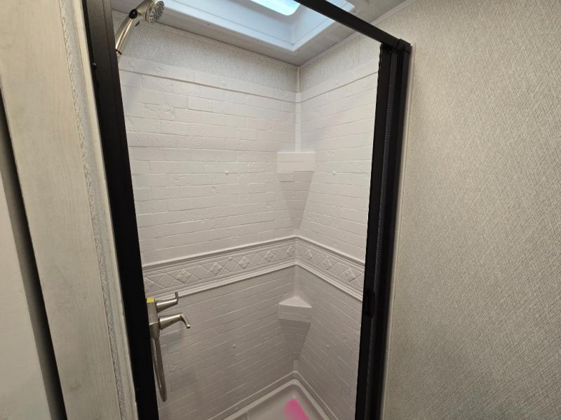 This coach is perfect for traveling with a friend or honey since there are two twin beds that can convert to a king-size bed if you choose! There is a 62" sofa and 42" x 68" booth dinette in the main living area that can double as seating and sleeping space, plus there is a bunk over cab for the little ones. Once you are fully rested, head to the kitchen to prepare a delicious breakfast feast with the convection microwave and cooktop. Use the double sink to clean up, and the 10.7-cubic foot refrigerator to keep your perishables fresh. You can even add some extra prep space to this area by using the countertop extension.