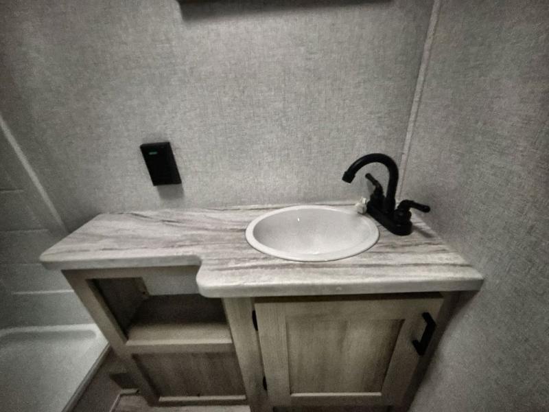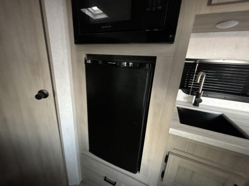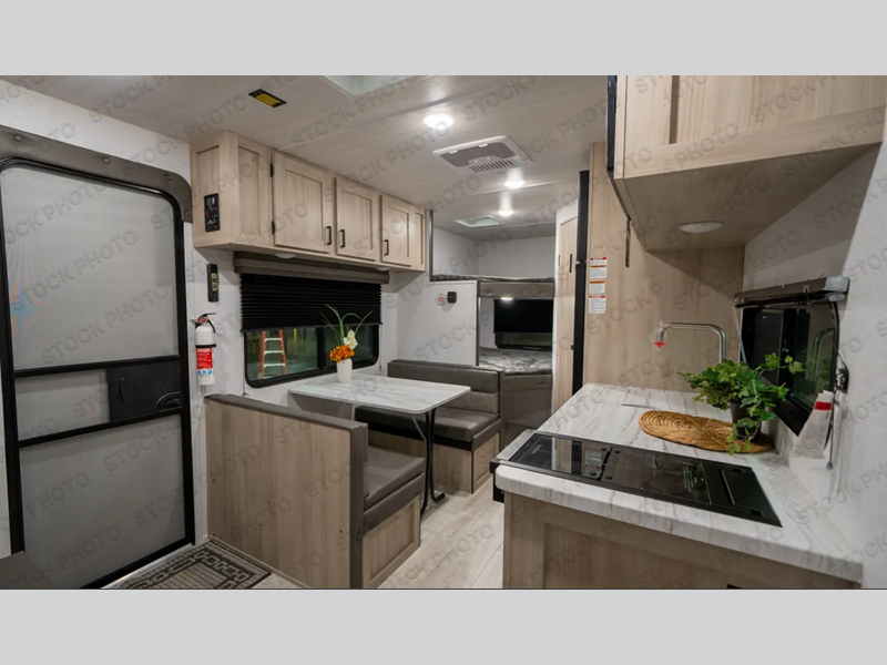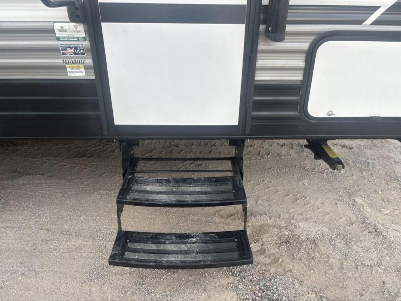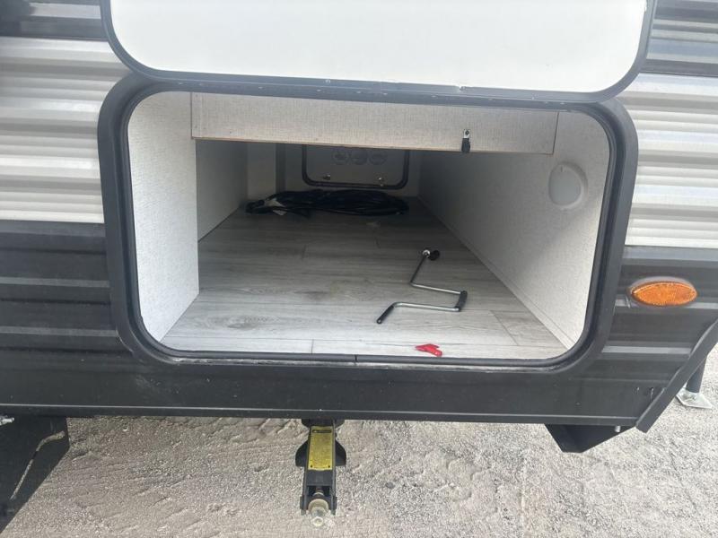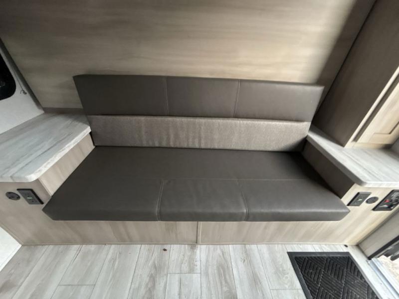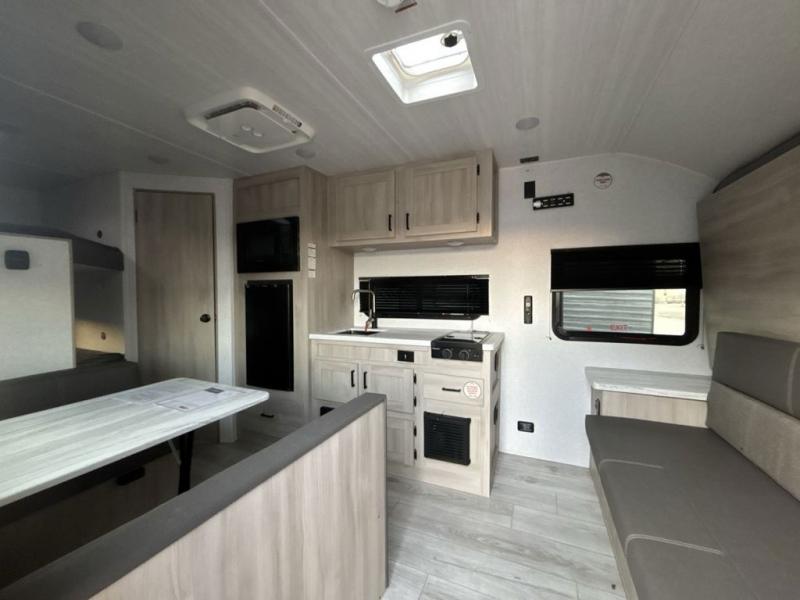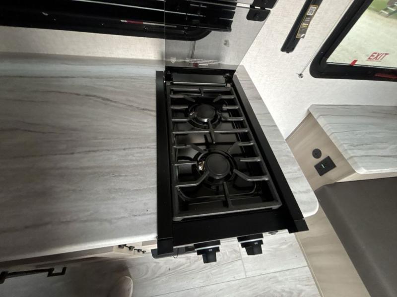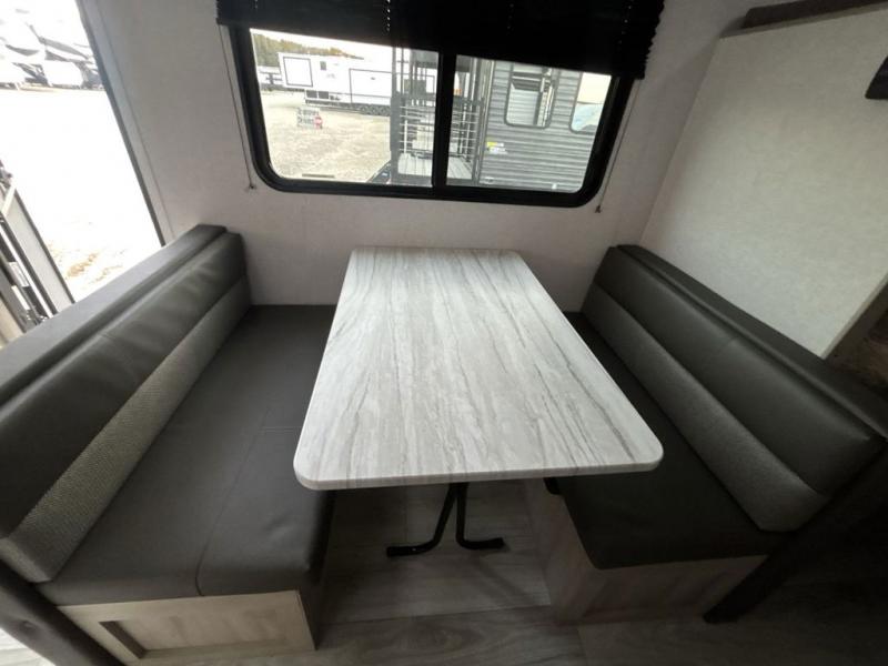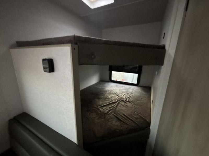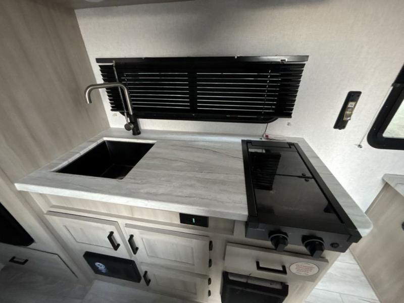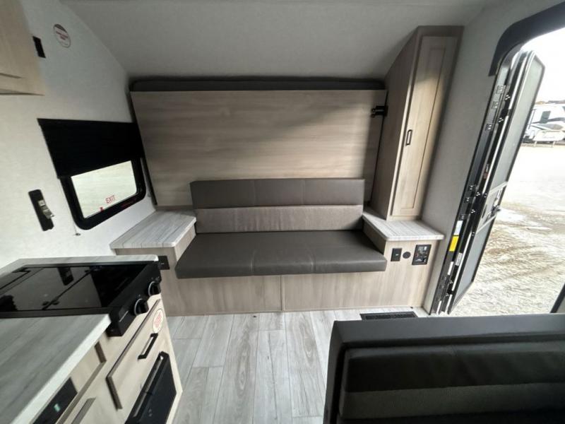 You'll love every minute camping in this single axle travel trailer. Once you arrive at the campground, you can unload the pass-through storage and put out the 14' power awning with adjustable legs and LED light strip. The two burner cooktop and microwave oven will let you make meals each day, and you can dine at the booth dinette once dinner is made. If you have an overnight guest or two little ones, they can sleep here at night, while you take the front queen-size Murphy bed. There are also double-size bunks with storage for even more sleeping space!