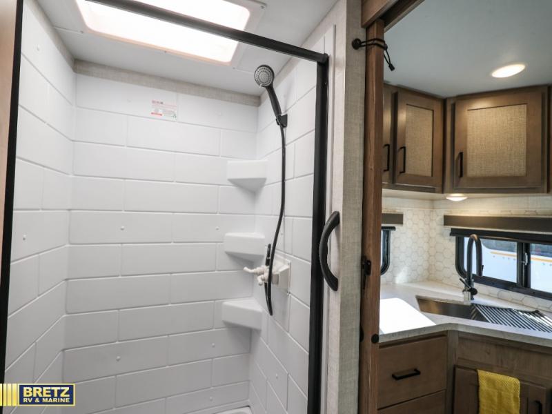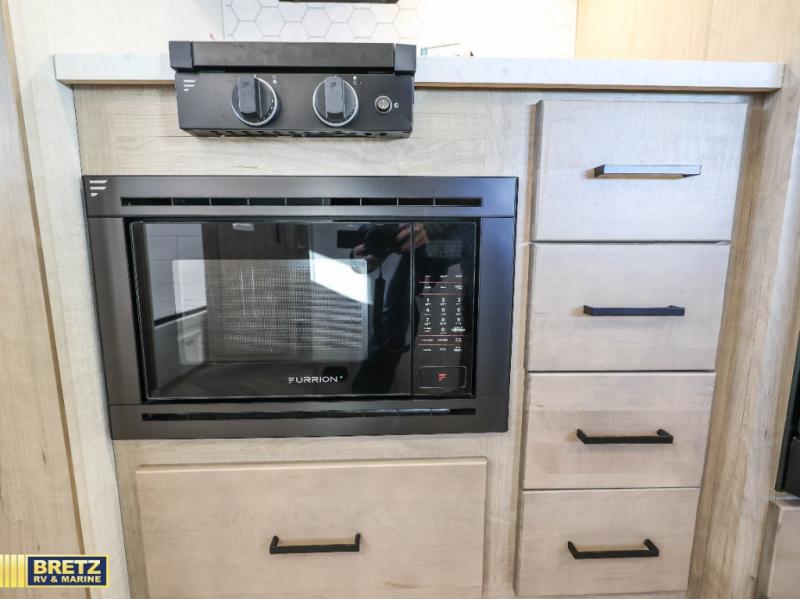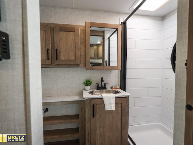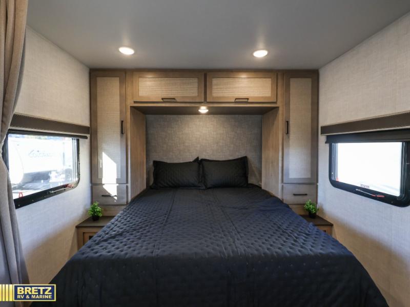 Camping trips just got a whole lot better in this tandem axle, single slide travel trailer! Once you arrive at the campground, you can put out the 18' power awning, grab your camp chairs from the pass-through storage, and relax! When you're getting hungry, head to the rear corner kitchen that includes ample counter space, a two burner cooktop, plus a 10 cu. ft. 12V refrigerator. There is also a pantry to store snacks and paper goods! You can get cozy after dinner on the theater seating that sits directly across from the HDTV for easy viewing, and there is a legless dinette if game night is in order. When you're ready for bed, the queen bed up front will provide a great night's rest, and there is a privacy curtain if you have a guest staying over on the dinette. And don't worry about storage space; this model has you covered with dual bedroom wardrobes, overhead cabinets, and convenient shoe storage!