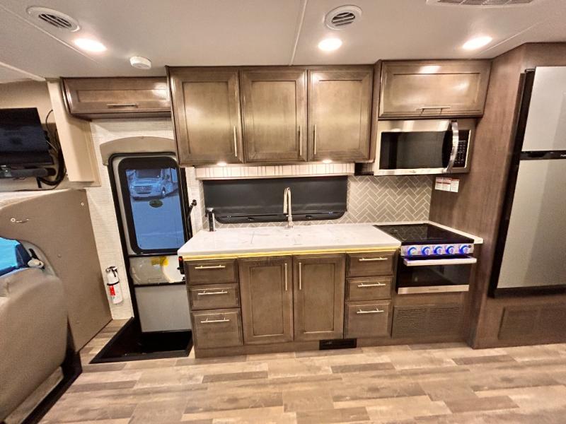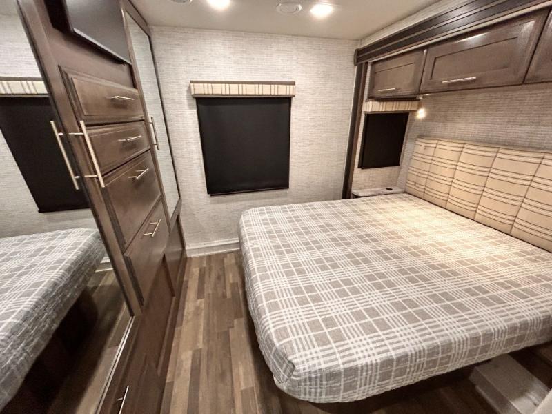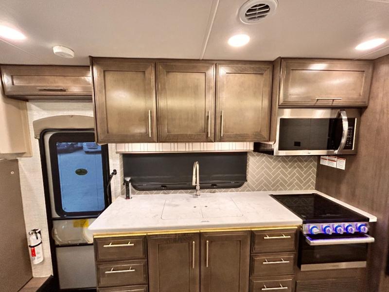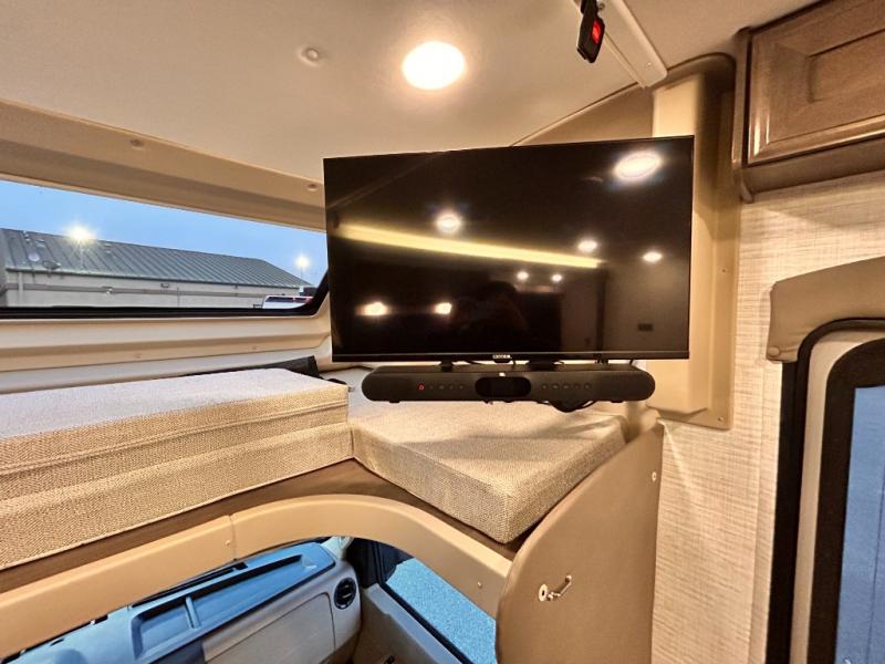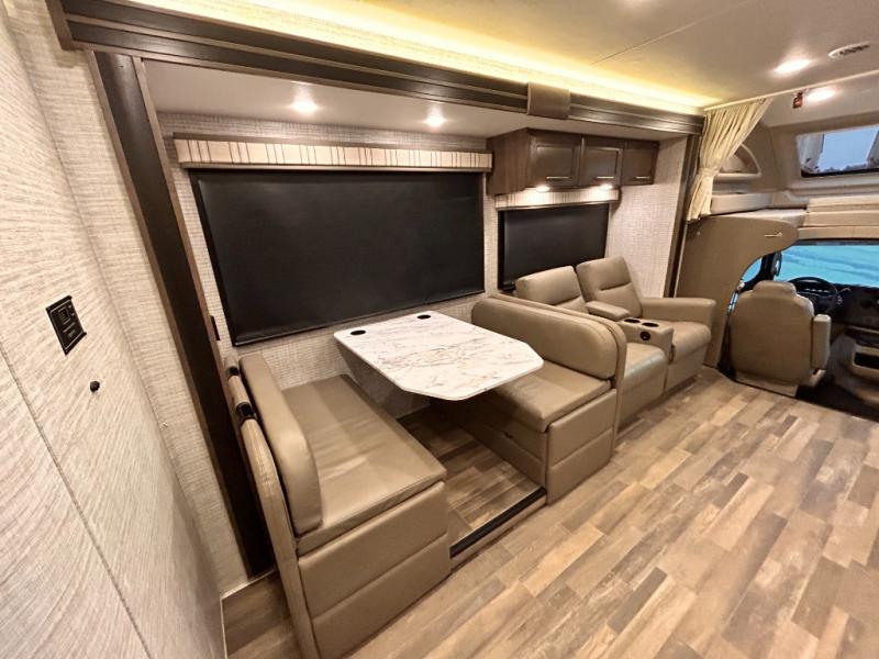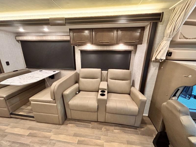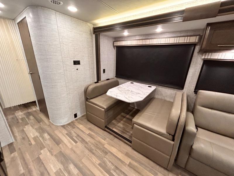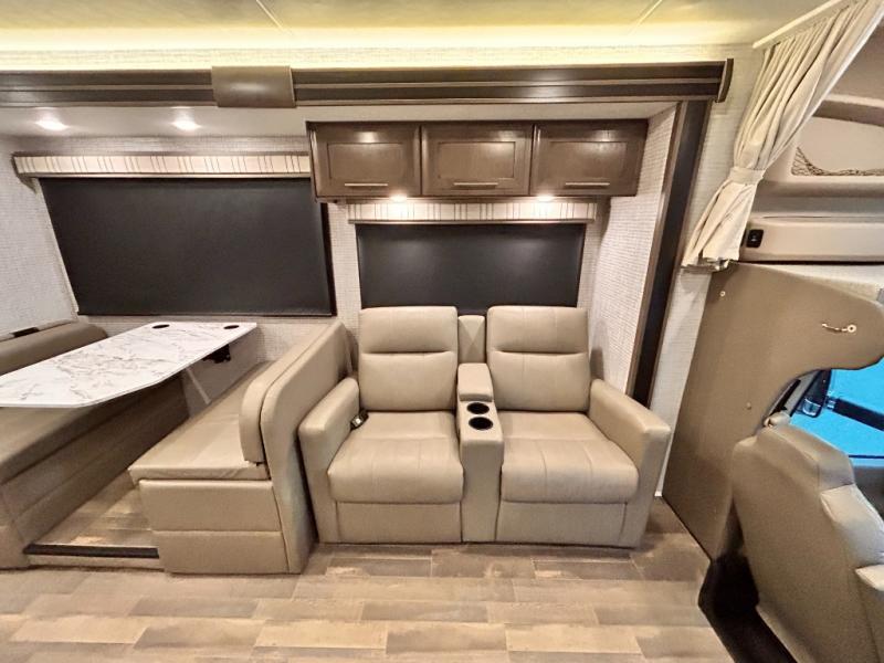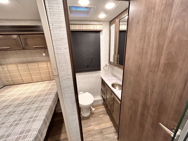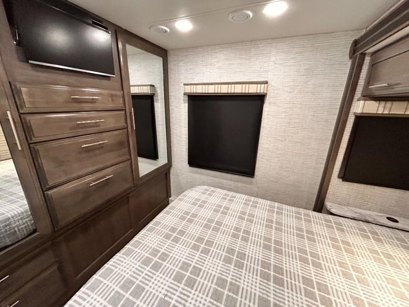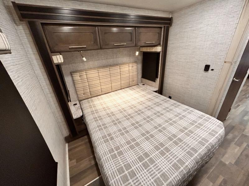 Enjoy a home on wheels with this motorhome! The rear private bedroom has a 60" x 74" queen bed slide to lay your head on at night and dual wardrobes opposite to keep your clothes looking their best. Add the optional TV if you enjoy watching a movie in bed. The separated bathroom makes it easy for one person to freshen up in the 30" x 36" shower while another uses the private toilet and sink. Prepare your best home cooked meals with the Furrion all-in-one cooktop and oven then enjoy them at the booth dinette. The tri-fold sofa offers a comfortable place to relax but it can be switched out for the an optional theater sofa instead. There is also a bunk over cab for more to join in on the fun!