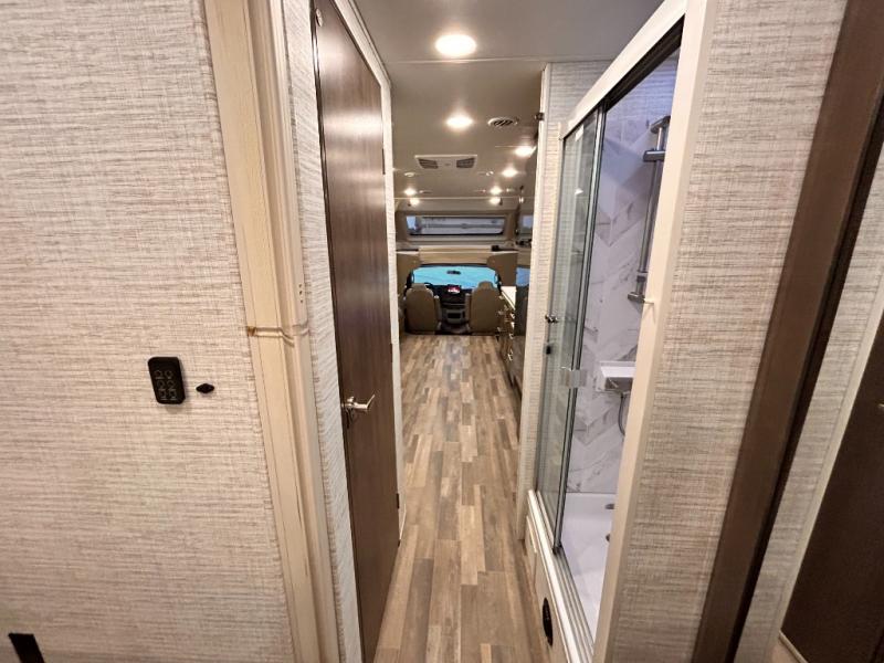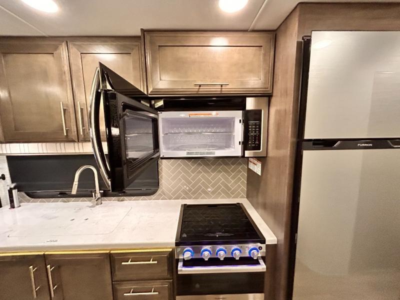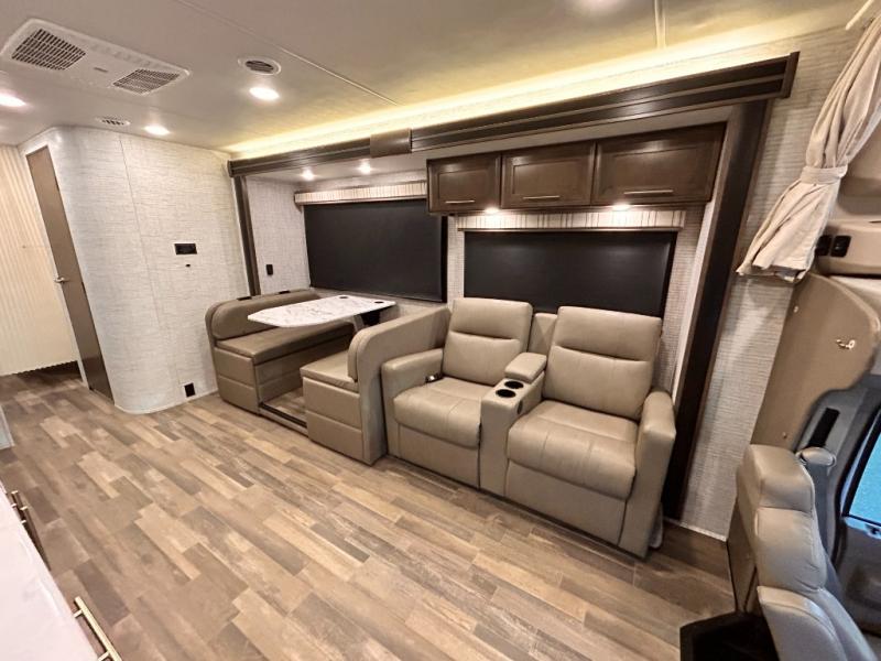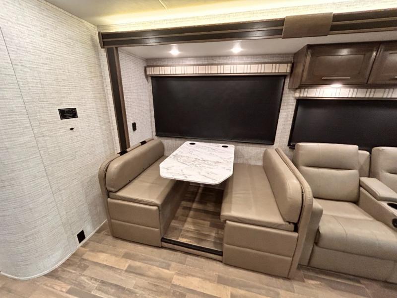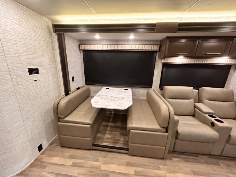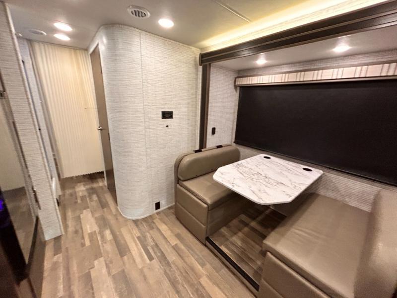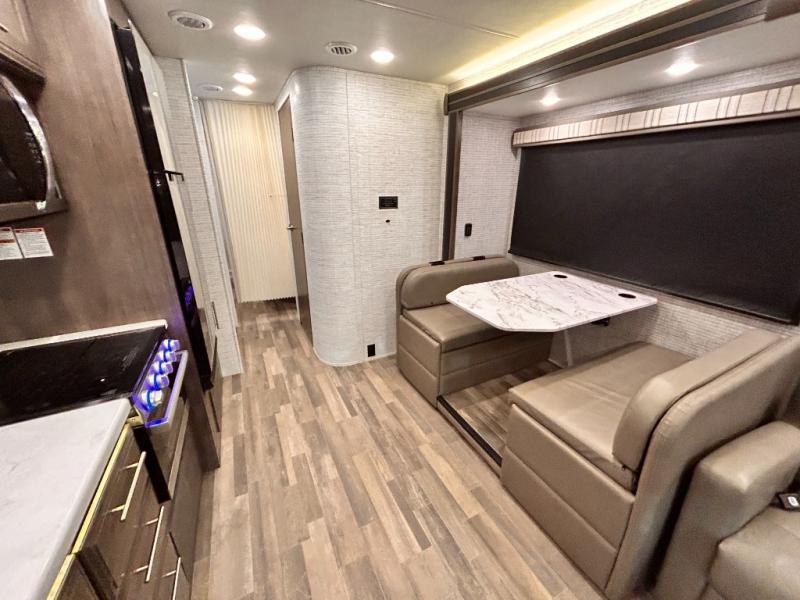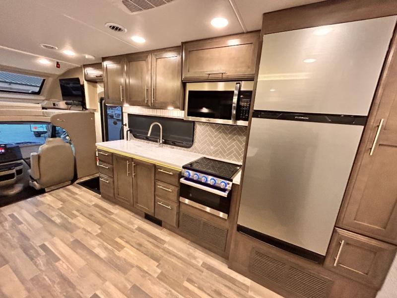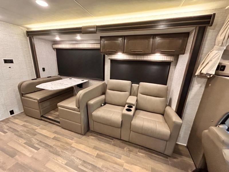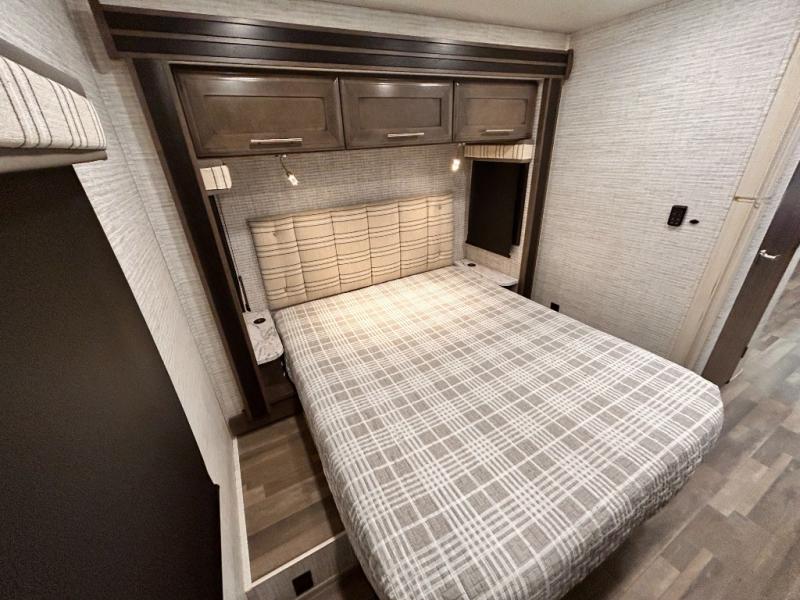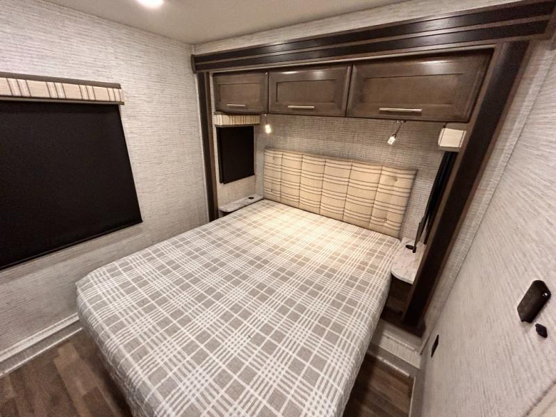 Enjoy a home on wheels with this motorhome! The rear private bedroom has a 60" x 74" queen bed slide to lay your head on at night and dual wardrobes opposite to keep your clothes looking their best. Add the optional TV if you enjoy watching a movie in bed. The separated bathroom makes it easy for one person to freshen up in the 30" x 36" shower while another uses the private toilet and sink. Prepare your best home cooked meals with the Furrion all-in-one cooktop and oven then enjoy them at the booth dinette. The tri-fold sofa offers a comfortable place to relax but it can be switched out for the an optional theater sofa instead. There is also a bunk over cab for more to join in on the fun!