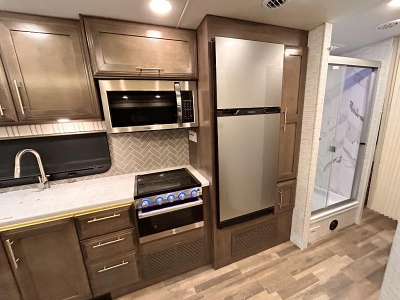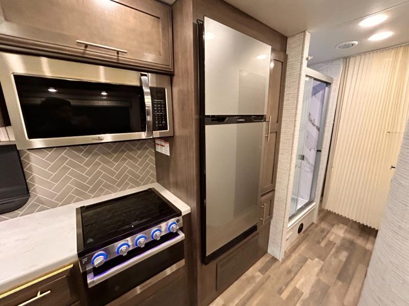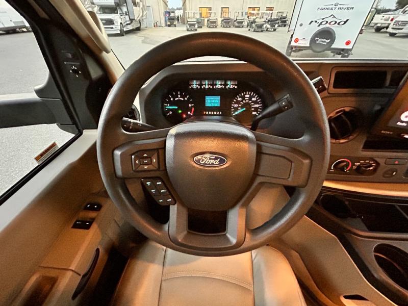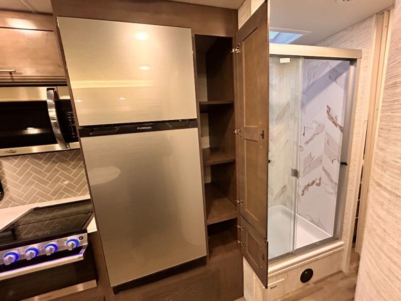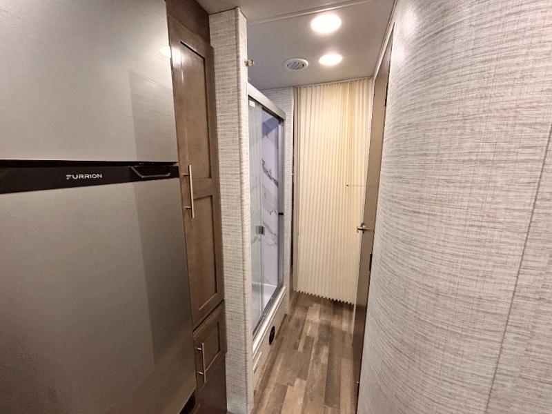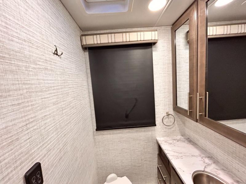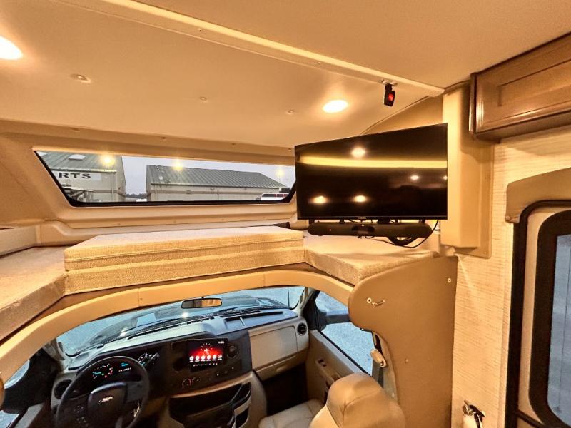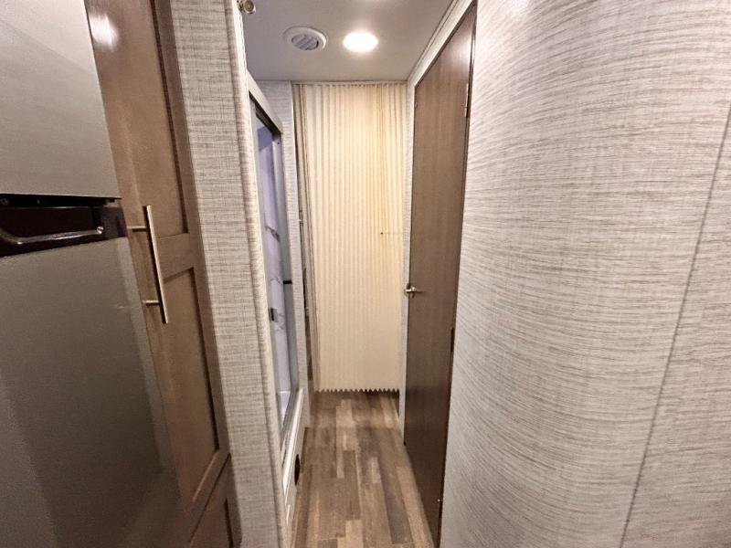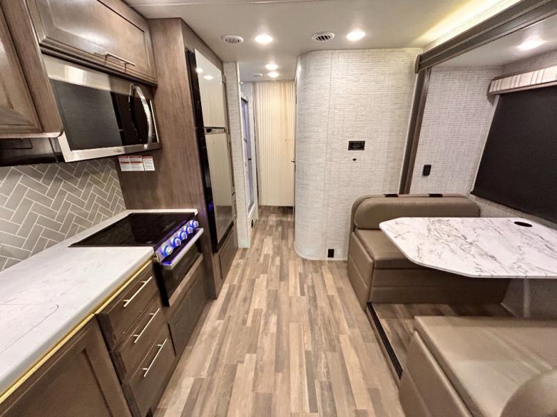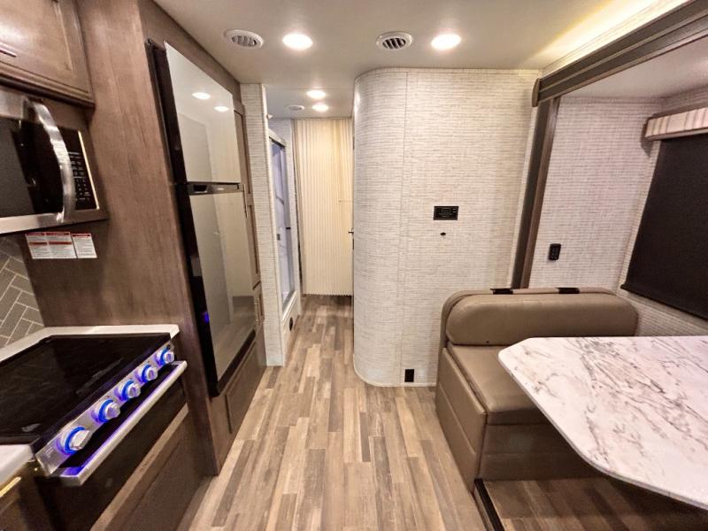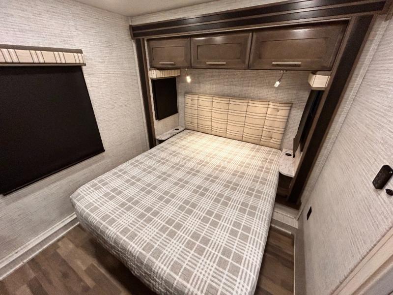 Enjoy a home on wheels with this motorhome! The rear private bedroom has a 60" x 74" queen bed slide to lay your head on at night and dual wardrobes opposite to keep your clothes looking their best. Add the optional TV if you enjoy watching a movie in bed. The separated bathroom makes it easy for one person to freshen up in the 30" x 36" shower while another uses the private toilet and sink. Prepare your best home cooked meals with the Furrion all-in-one cooktop and oven then enjoy them at the booth dinette. The tri-fold sofa offers a comfortable place to relax but it can be switched out for the an optional theater sofa instead. There is also a bunk over cab for more to join in on the fun!