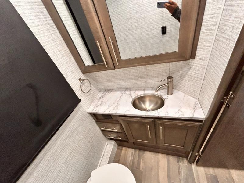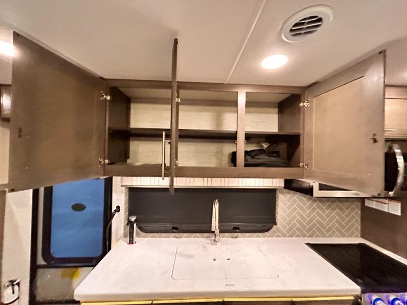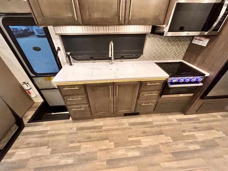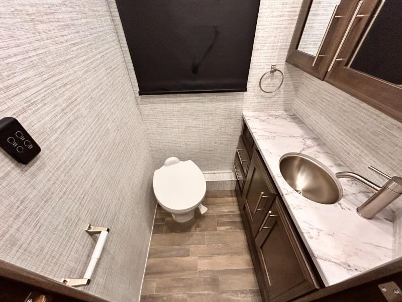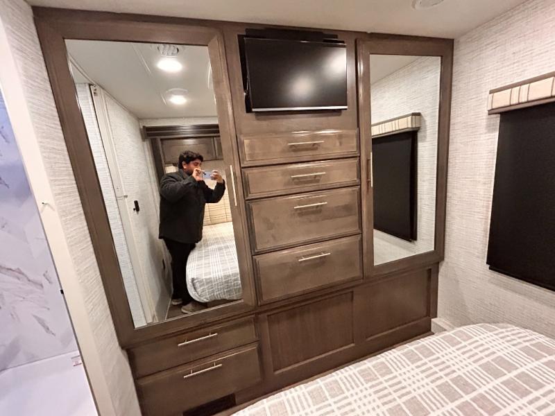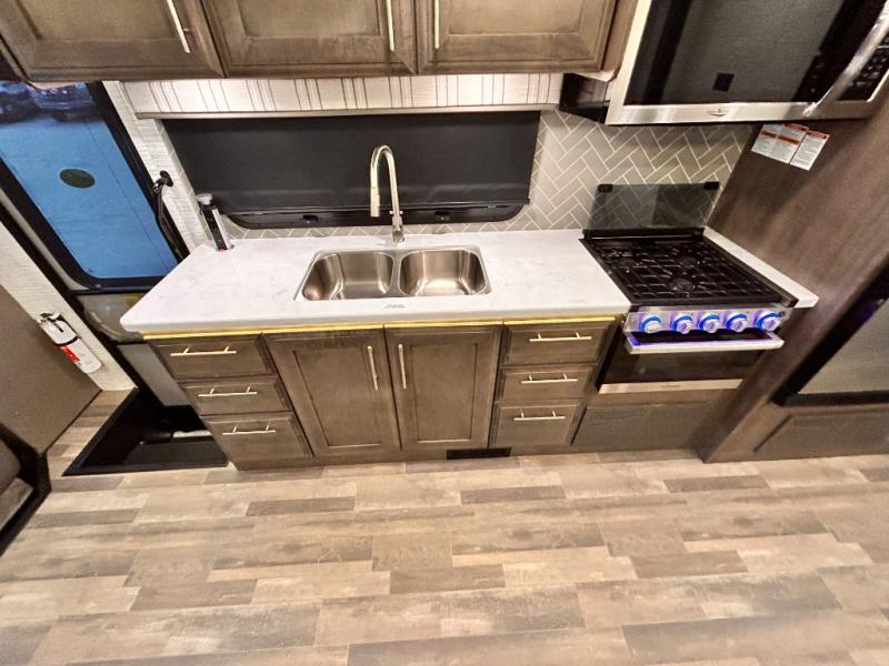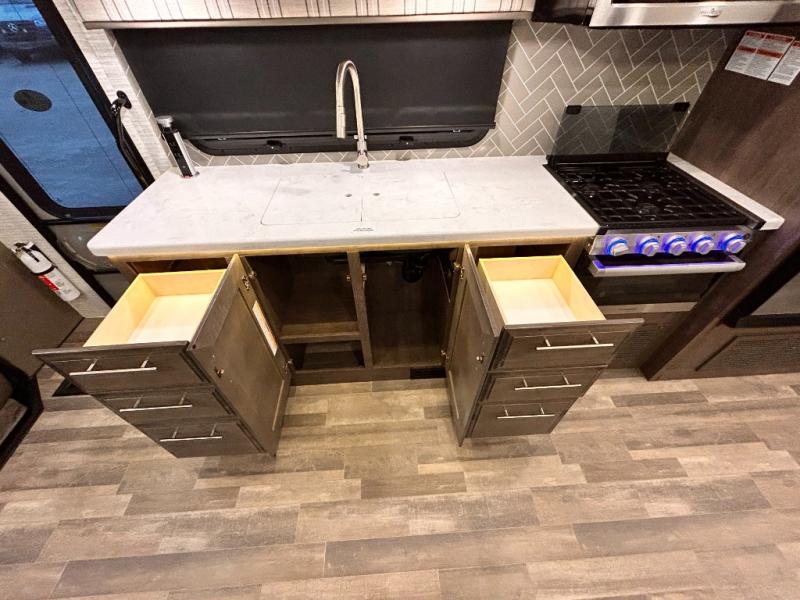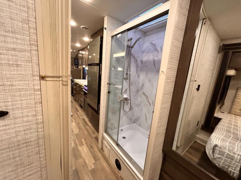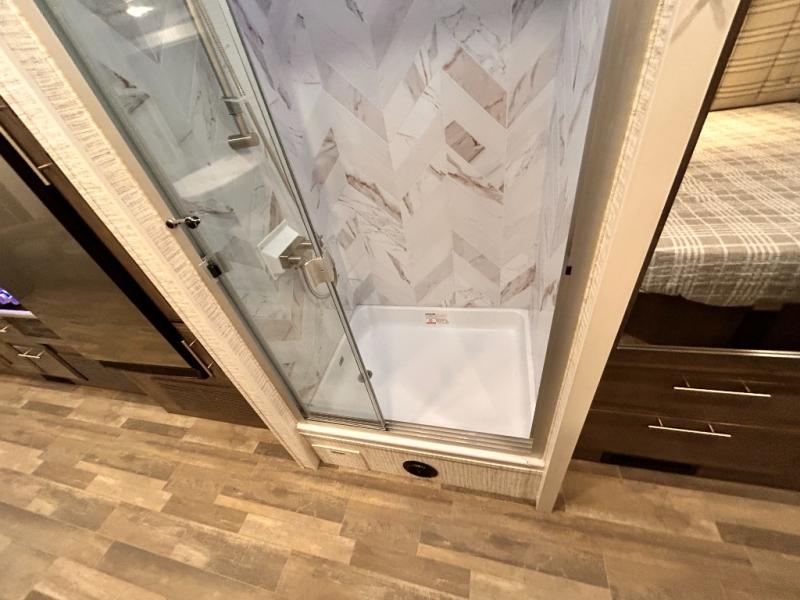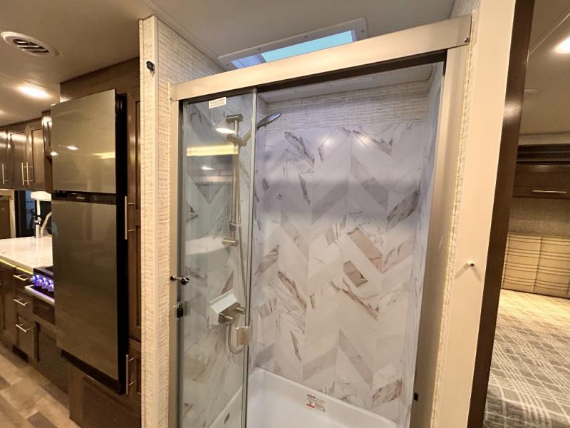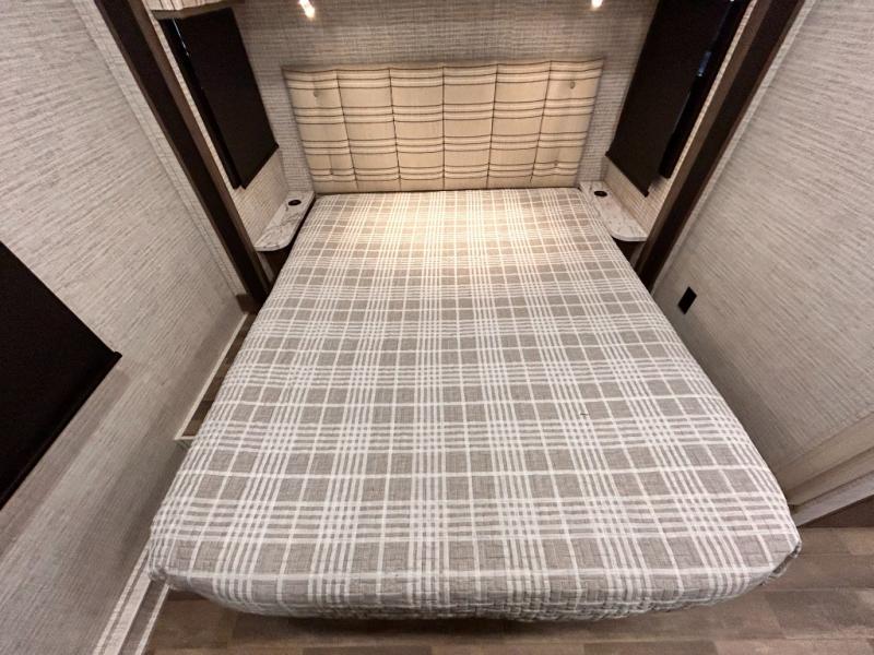 Enjoy a home on wheels with this motorhome! The rear private bedroom has a 60" x 74" queen bed slide to lay your head on at night and dual wardrobes opposite to keep your clothes looking their best. Add the optional TV if you enjoy watching a movie in bed. The separated bathroom makes it easy for one person to freshen up in the 30" x 36" shower while another uses the private toilet and sink. Prepare your best home cooked meals with the Furrion all-in-one cooktop and oven then enjoy them at the booth dinette. The tri-fold sofa offers a comfortable place to relax but it can be switched out for the an optional theater sofa instead. There is also a bunk over cab for more to join in on the fun!