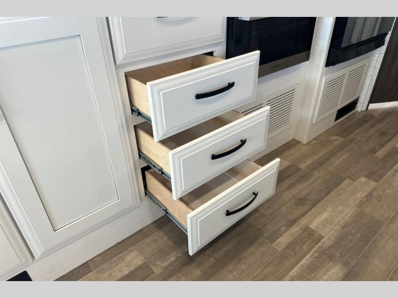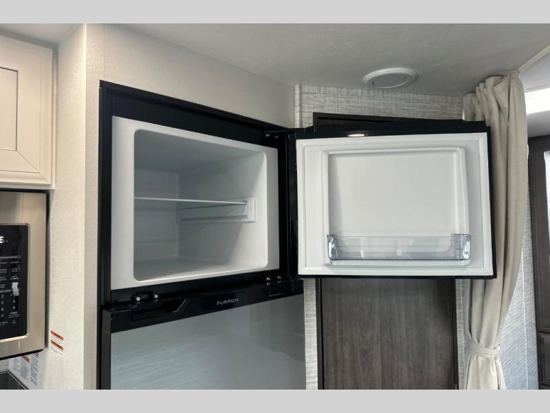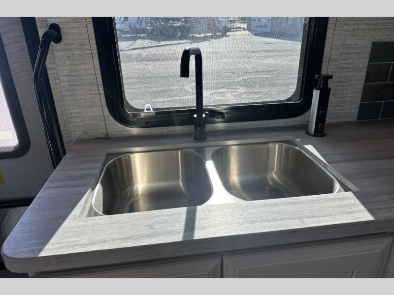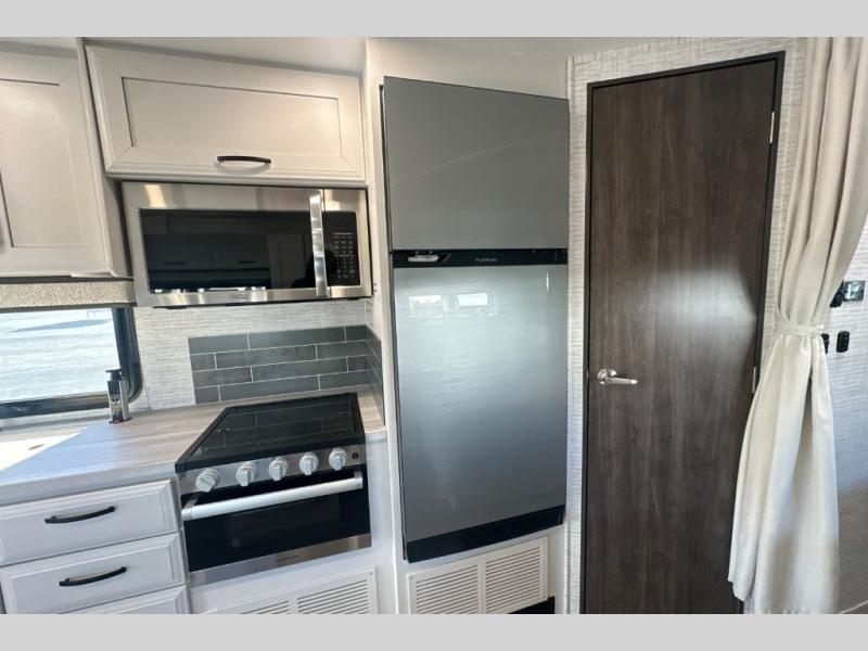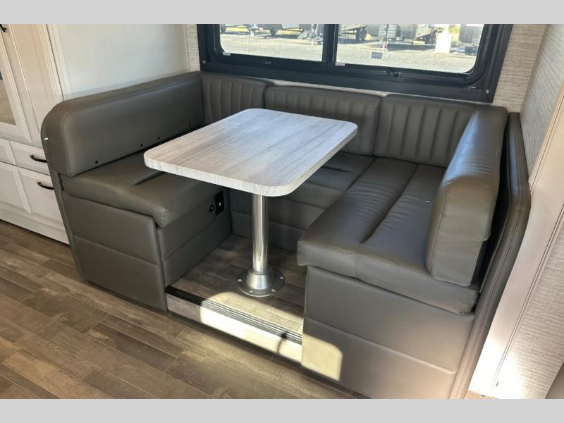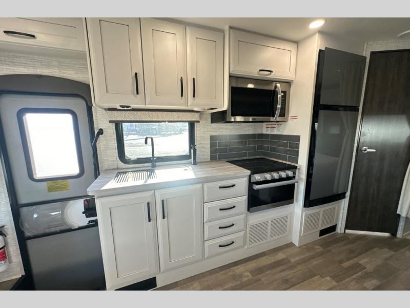 With any Odyssey Class C gas motorhome by Entegra Coach, the driver will appreciate the power from the 325 HP engine, the towing capacity from the 7,500 lb. hitch, the tire pressure monitoring system, the navigation from the Sony infotainment center with Apple CarPlay and Android Auto, plus the backup and side-view cameras when parking and driving down the highway. The kitchen offers full amenities including a recessed stainless steel sink with a cutting board sink cover, LED-lit countertops, a decorative backsplash, and a pop-up charging station with 110 outlet and USB plugs to keep your smart phones charged. Get ready for luxury in a Class C, choose your favorite today!