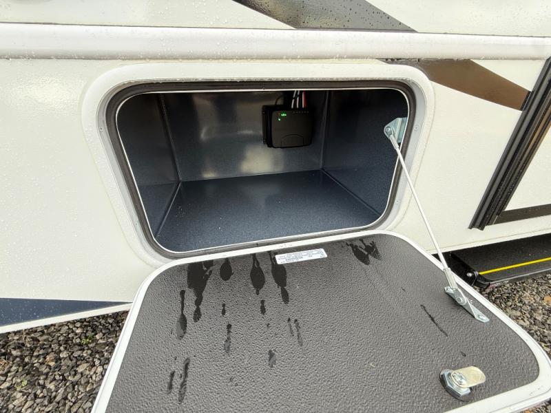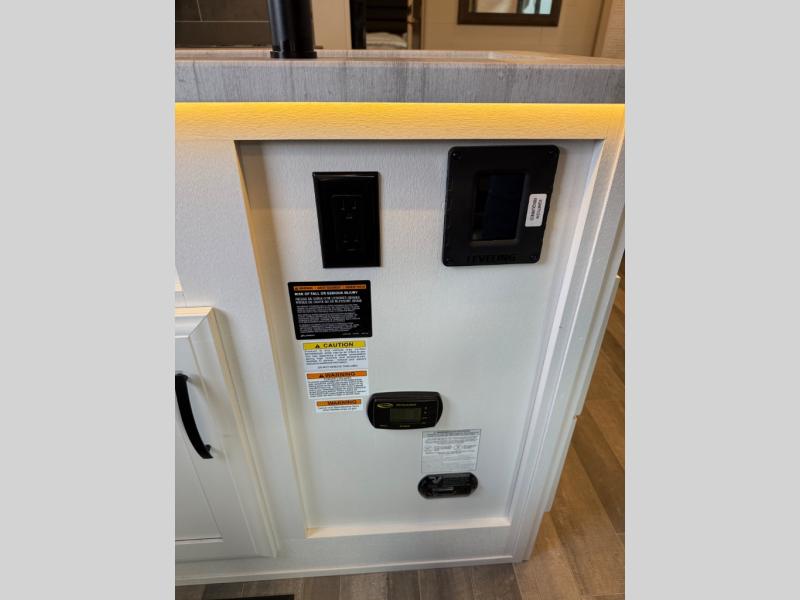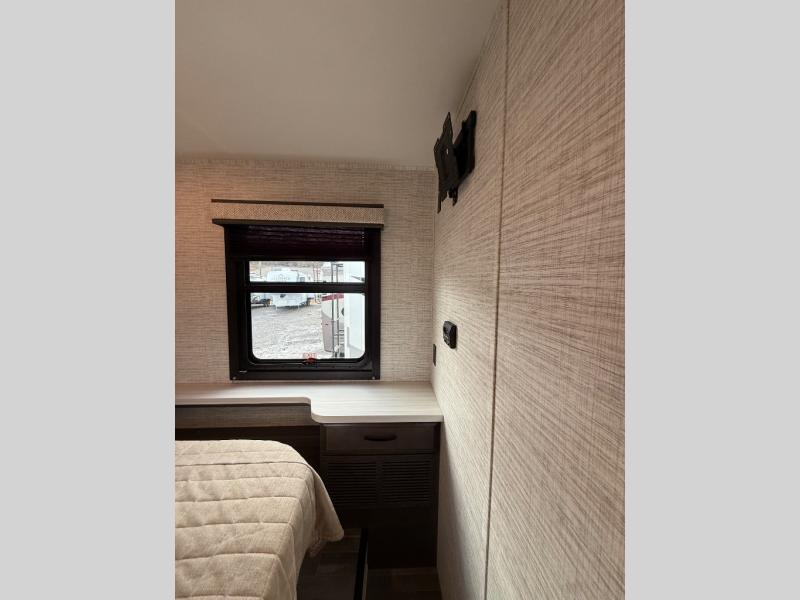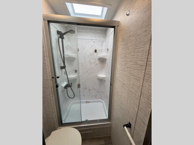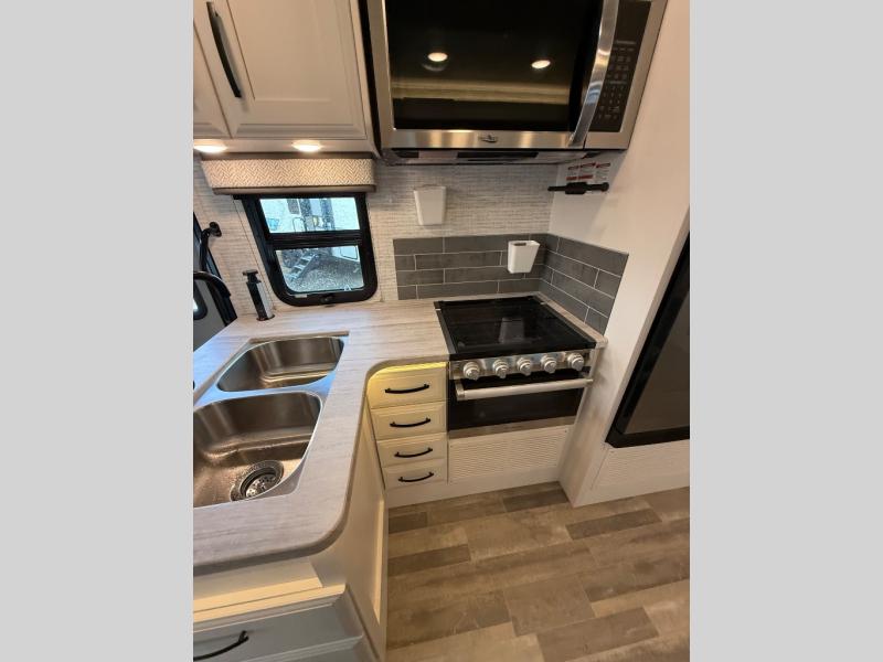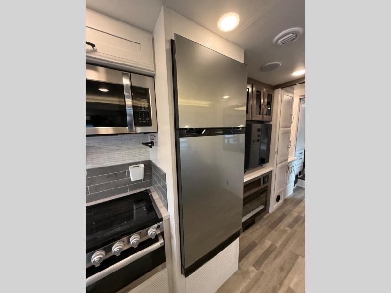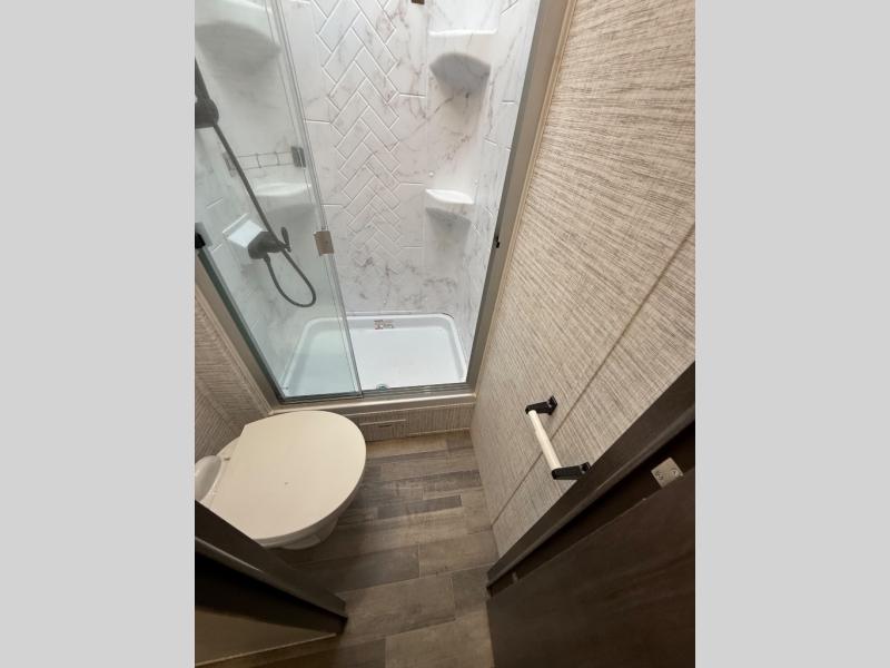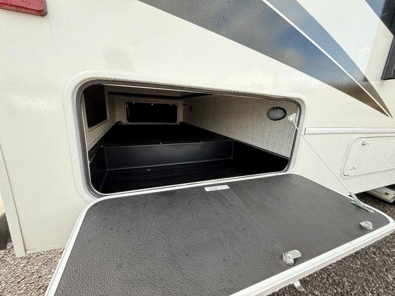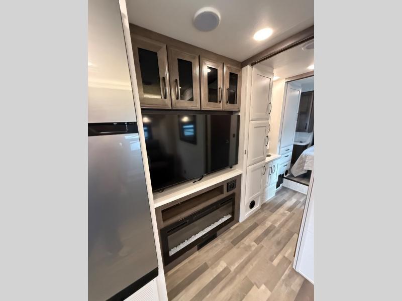 Relax inside while sitting on the sofa, at the booth dinette or on the swivel captains chairs while enjoying the fireplace and 50" TV, or unwind outside under the 18' electric awning while watching the exterior TV. After shopping in town or hiking the trails you can get cleaned up in the private toilet and shower room then brush your teeth in the bathroom sink a few steps outside the door. The private bedroom includes a space saving sliding door, a unique rear queen bed slide, plus storage. The cook will enjoy making meals using the residential-size microwave and Furrion all-in-one cooktop and oven, then storing leftovers in the 8 cu. ft. refrigerator. And the L-shaped counter with sink will come in handy.