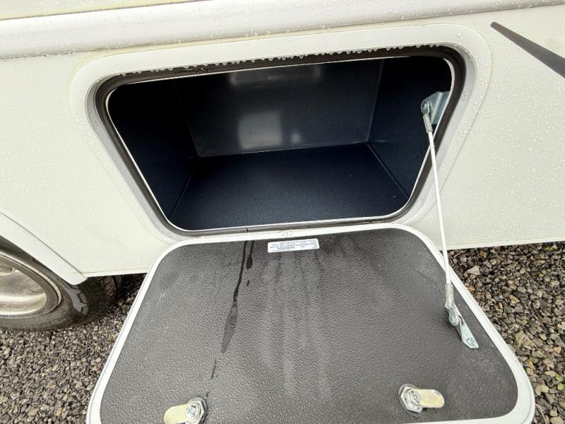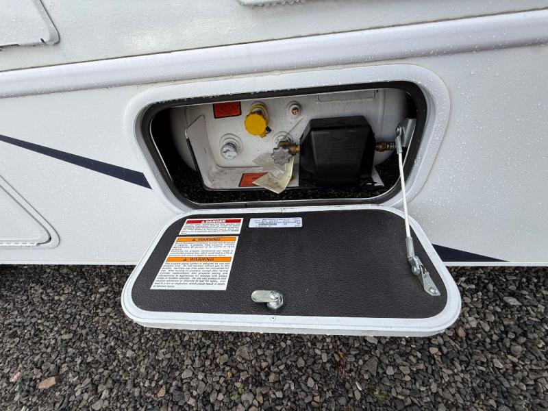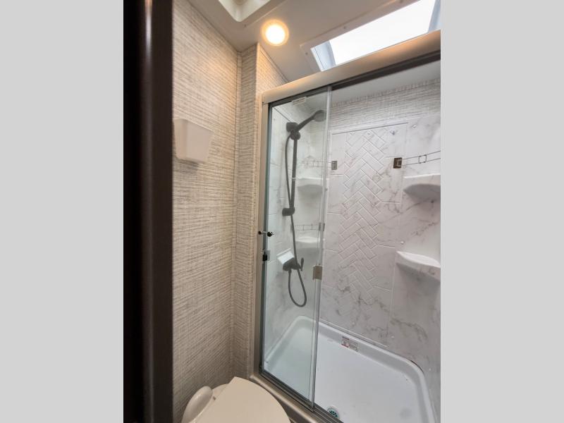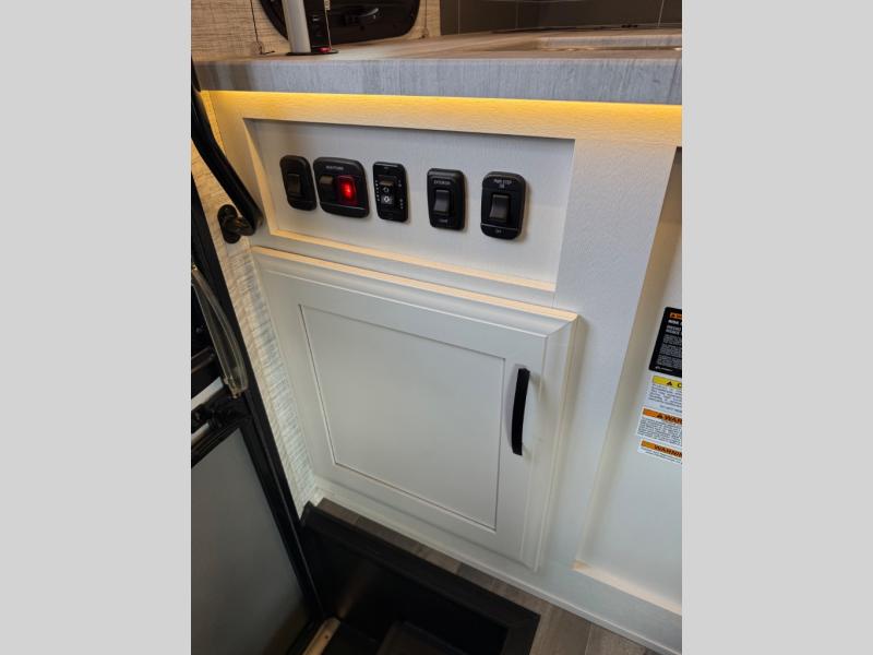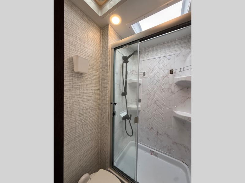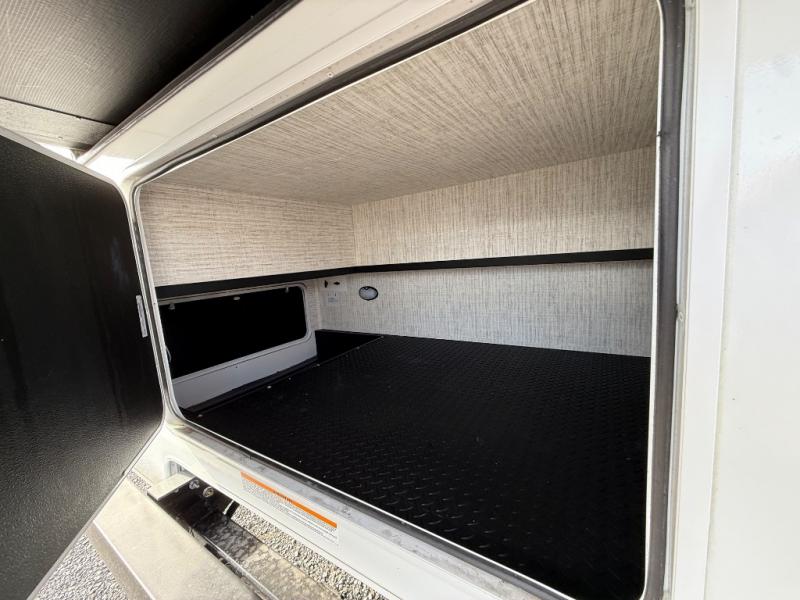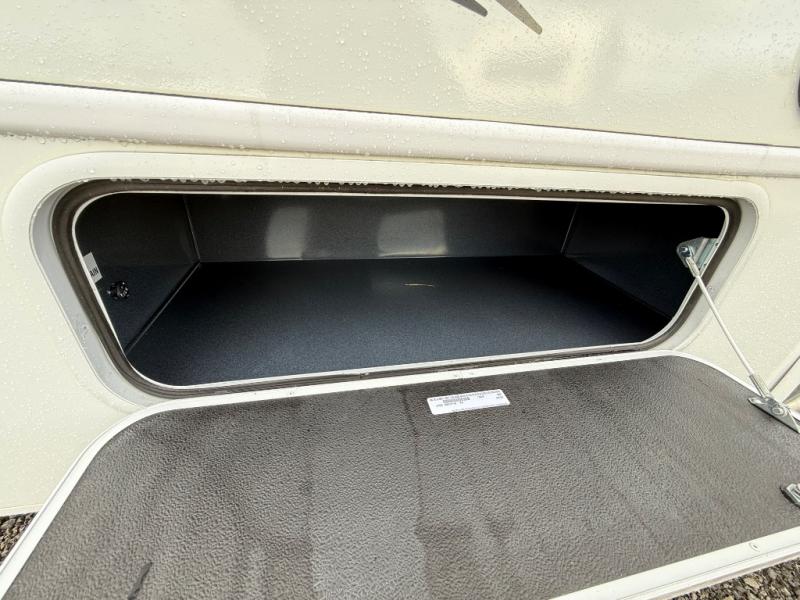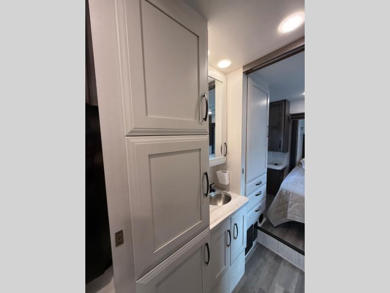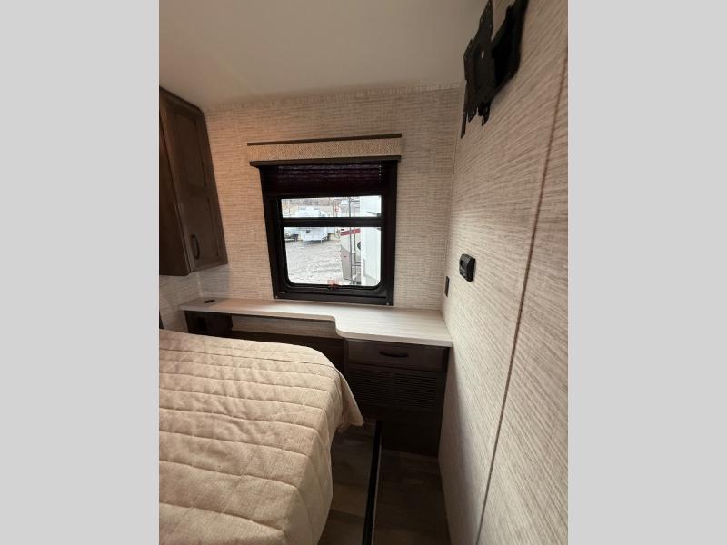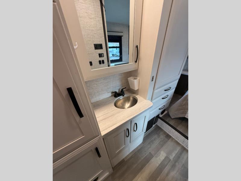 Relax inside while sitting on the sofa, at the booth dinette or on the swivel captains chairs while enjoying the fireplace and 50" TV, or unwind outside under the 18' electric awning while watching the exterior TV. After shopping in town or hiking the trails you can get cleaned up in the private toilet and shower room then brush your teeth in the bathroom sink a few steps outside the door. The private bedroom includes a space saving sliding door, a unique rear queen bed slide, plus storage. The cook will enjoy making meals using the residential-size microwave and Furrion all-in-one cooktop and oven, then storing leftovers in the 8 cu. ft. refrigerator. And the L-shaped counter with sink will come in handy.