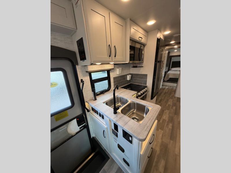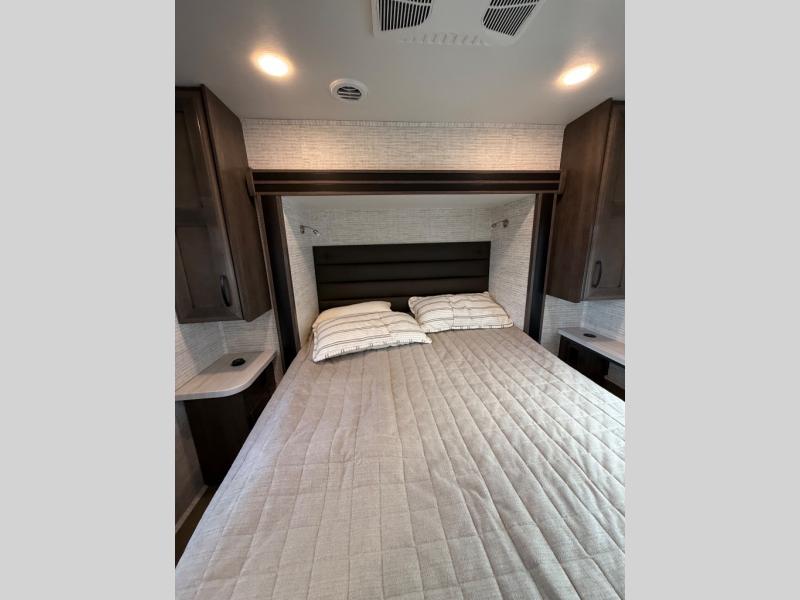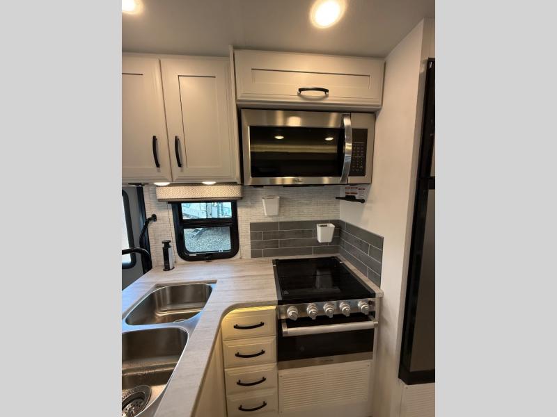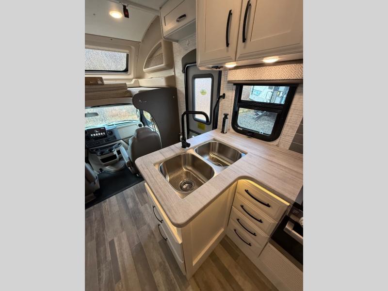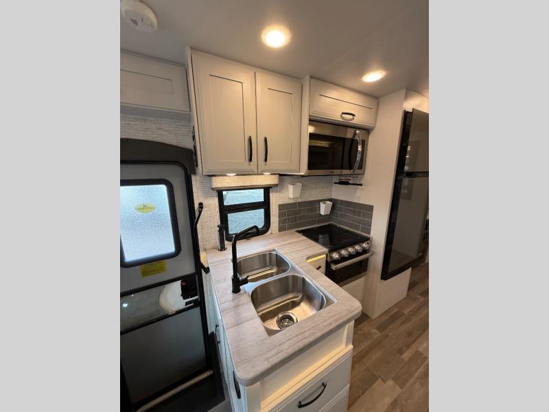 With any Odyssey Class C gas motorhome by Entegra Coach, the driver will appreciate the power from the 325 HP engine, the towing capacity from the 7,500 lb. hitch, the tire pressure monitoring system, the navigation from the Sony infotainment center with Apple CarPlay and Android Auto, plus the backup and side-view cameras when parking and driving down the highway. The kitchen offers full amenities including a recessed stainless steel sink with a cutting board sink cover, LED-lit pressed countertops, a decorative backsplash, and a pop-up charging station with 110 outlet and USB plugs to keep your smart phones charged. Get ready for luxury in a Class C, choose your favorite today!