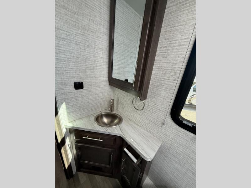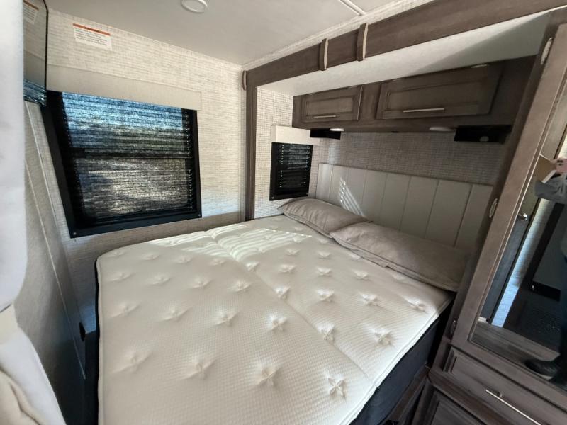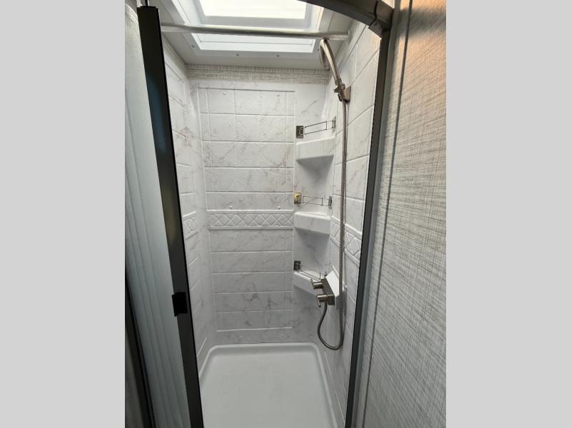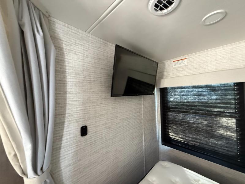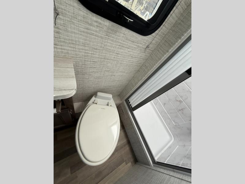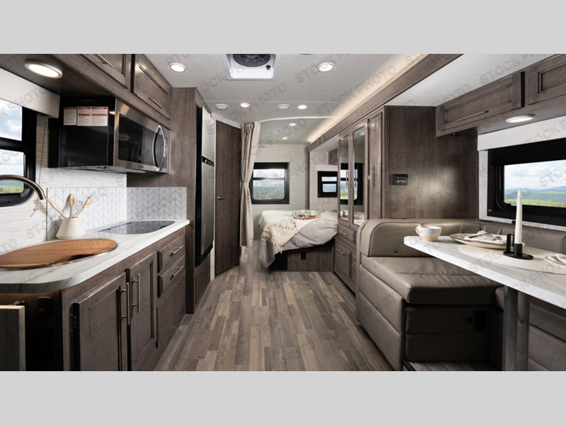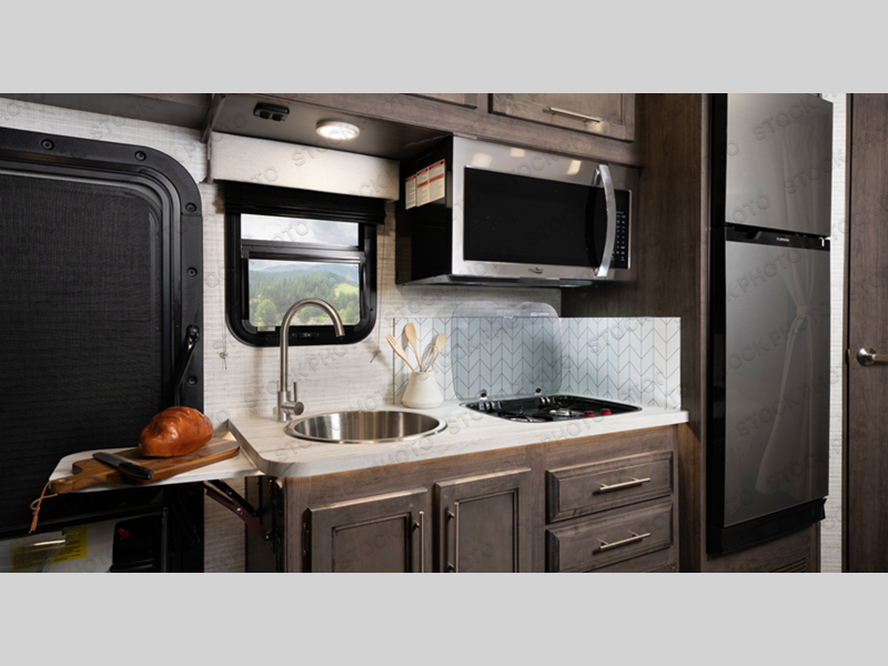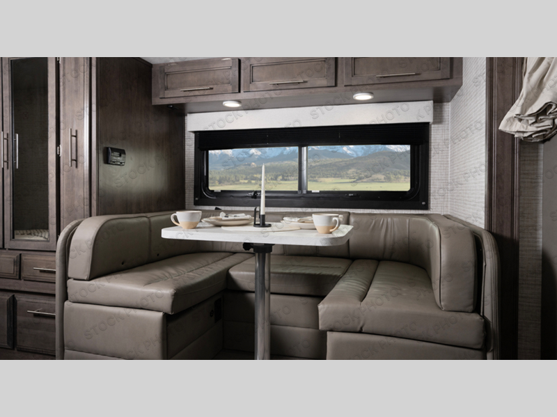 Pack your bags and head to your favorite camping destination in this cozy coach! You can sleep four to six between the RV queen bed, U-shaped dinette, and overhead bunk with a 750 lb. capacity. And if you don't need the extra sleeping space, just choose the entertainment center with overhead storage option in place of the bunk, and the theater seating option in place of the dinette! You can prepare meals each day on the two burner drop-in cooktop or in the convection microwave, and there is a 10 cu. ft. 12V refrigerator for perishables. A full bath, complete with a foot flush toilet, powered roof vent, and shower skylight will let you stay clean throughout each trip. You will also find plenty of storage space, including a wardrobe by the bed, a pantry, plus overhead cabinets!