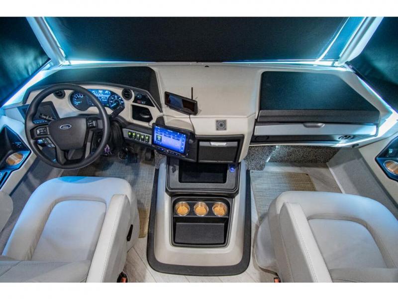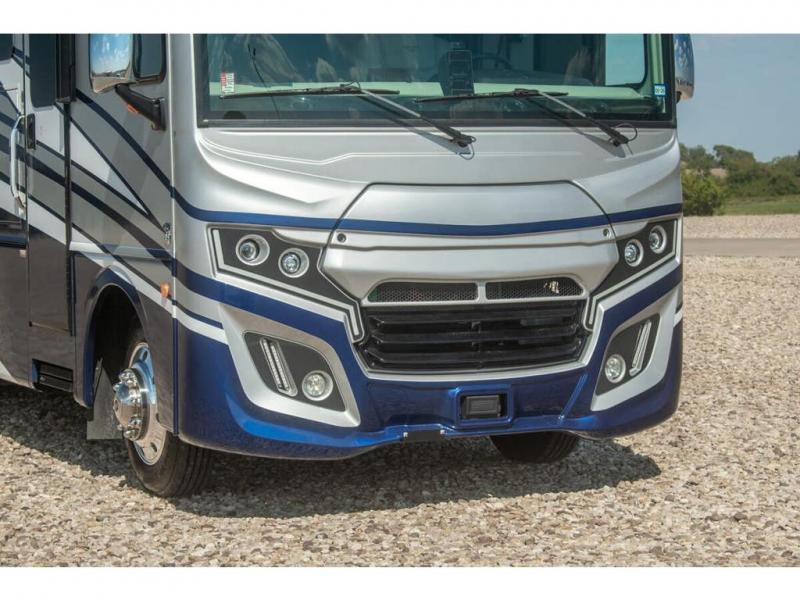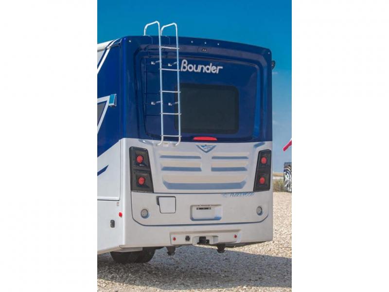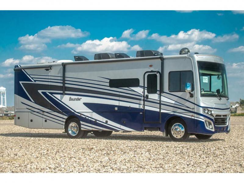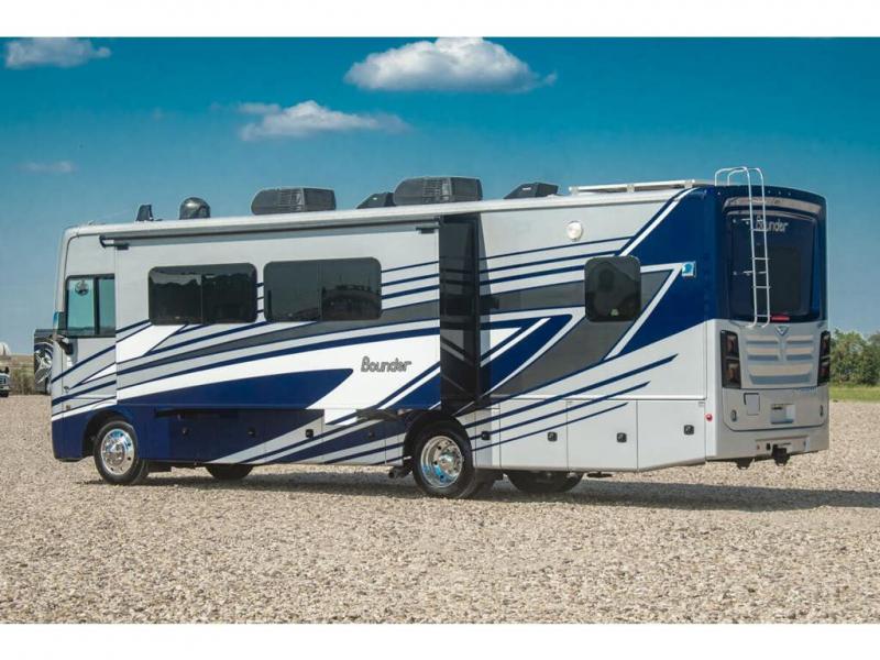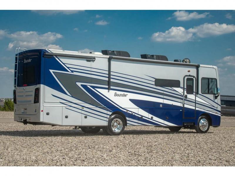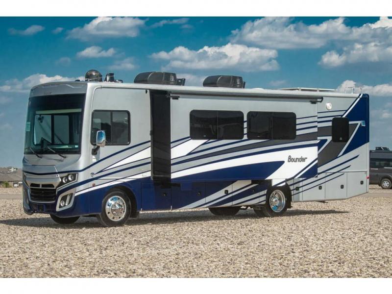 With any Bounder Class A gas motorhome by Fleetwood, you can travel in luxury and style with the power you desire to enjoy the ride as much as the destination. Beginning with the Power Platform Ford chassis, the enhanced safety features such as remote, power-heated mirrors with turn indicators and side cameras, and the color monitor for side and rear cameras, traveling is made easy. There is also an automotive one-piece windshield, a 100W solar panel, and WiFi Ranger Sky4 that come standard. A 5.5kW Onan generator will keep you powered up and you'll find plenty of storage both inside and out for personal belongings, camp gear, and more. Inside you will love the look of the durable, hand-laid Tarkett flooring, the energy efficient LED flush mount ceiling lighting, and the fiberglass shower with a glass door. Choose a Bounder Class A gas coach to discover even more stand-out features!